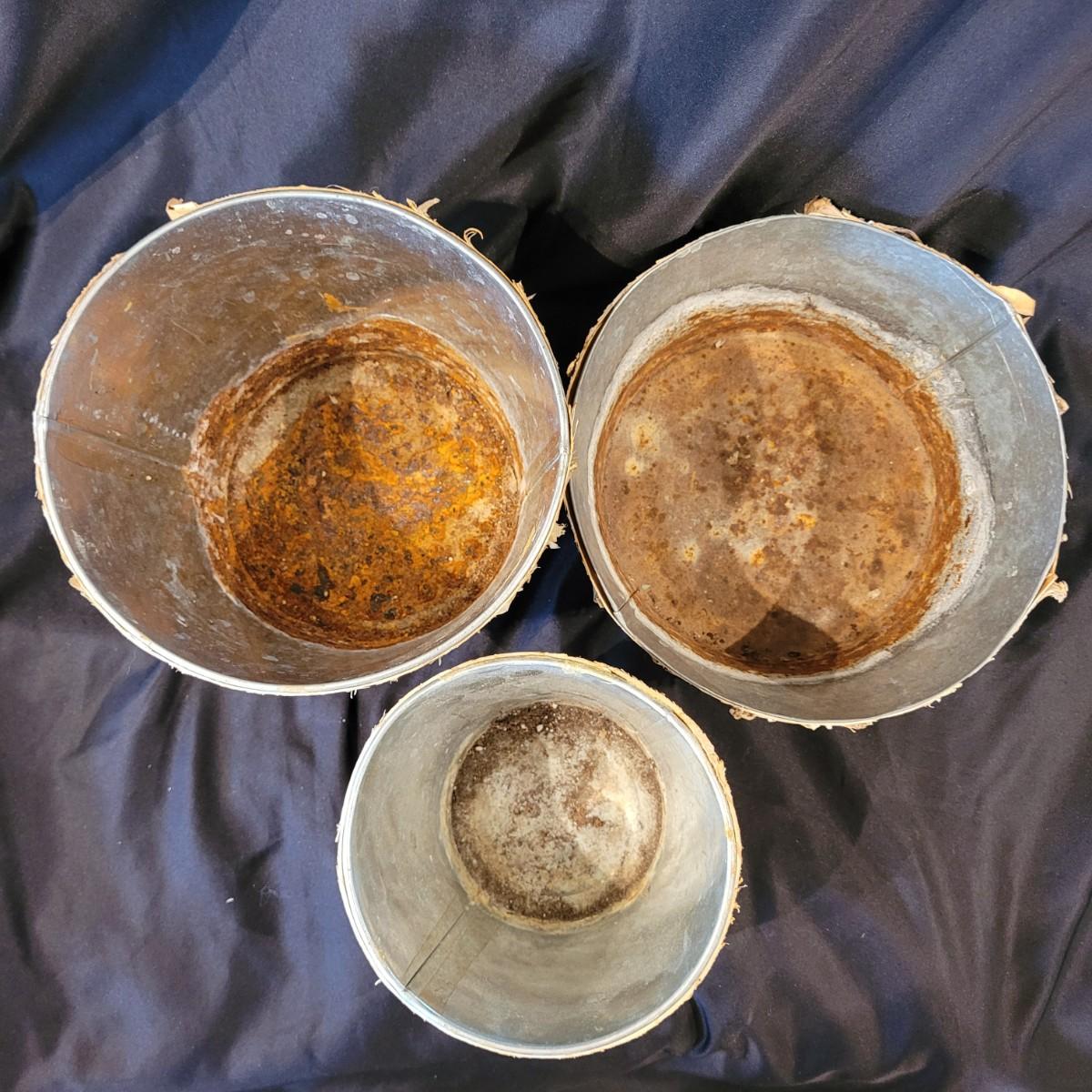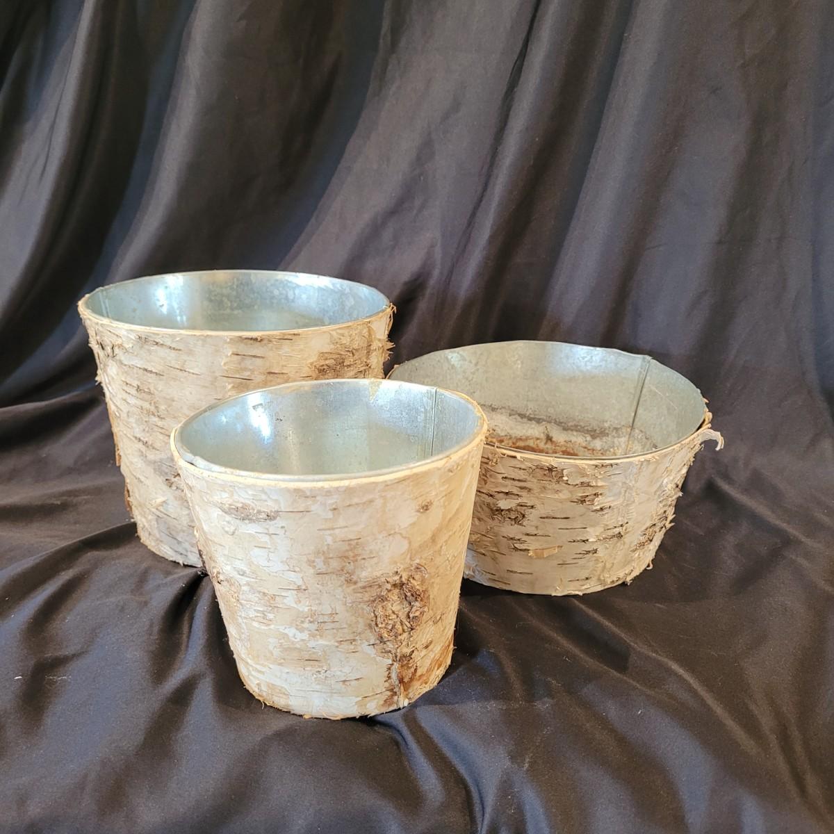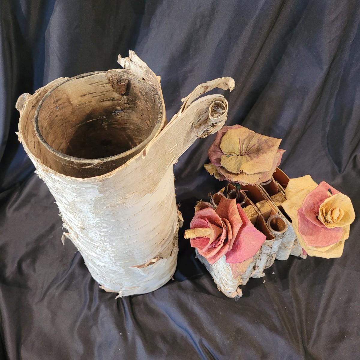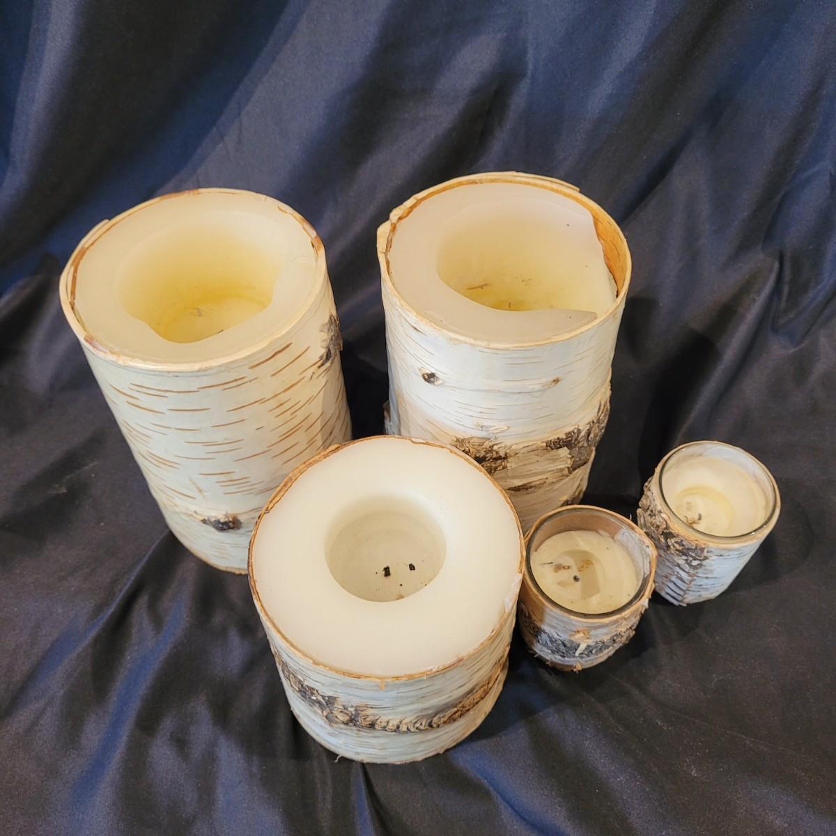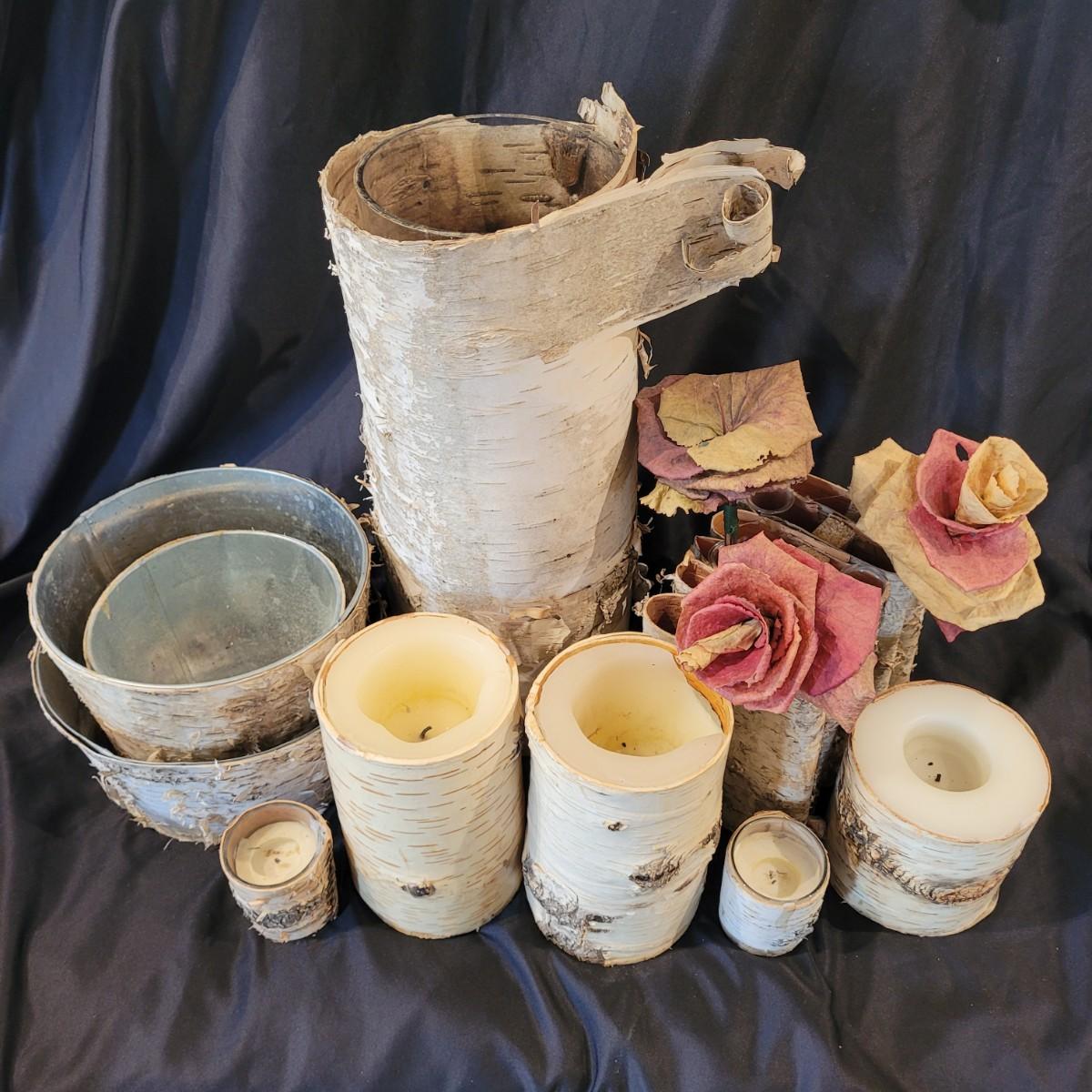 Birch wood wrapped decorations and candles. Large birch wrapped vase measures 6" x 6" x 14H. Three metal buckets wrapped in Birch, two of which show signs of rust. One folded Birch flower holder with hand made leaf "flowers". Five birch wrapped candles, two large, one medium and two smaller.