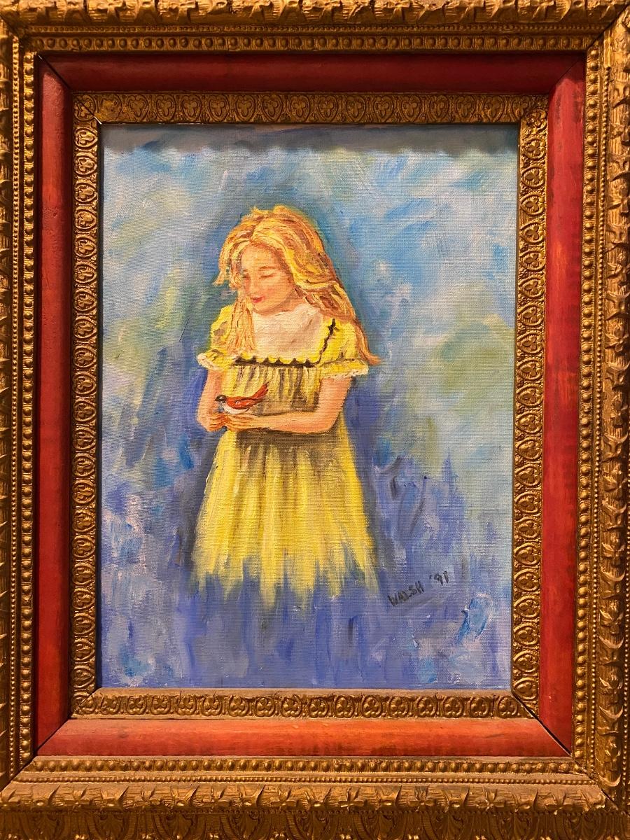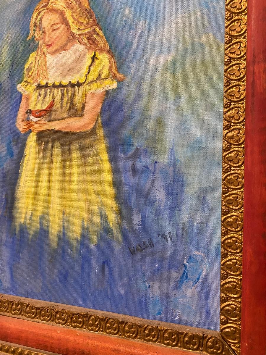 1991 Oil on Canvas, Untitled Bird and Girl Art by Dorothy Walsh - 19.5" W x 23.5" T. Signed and Framed