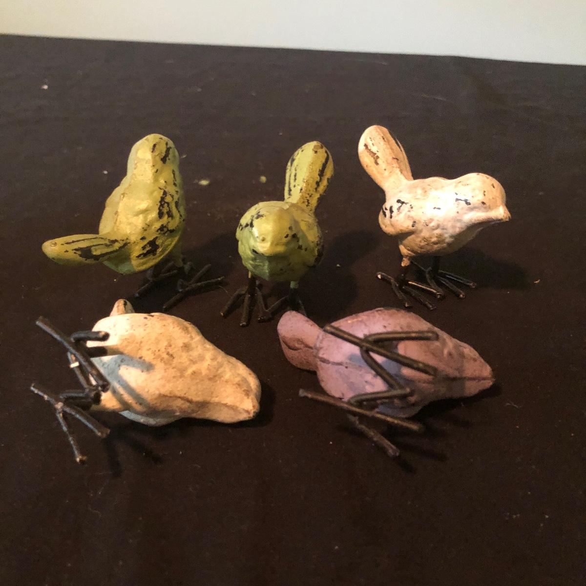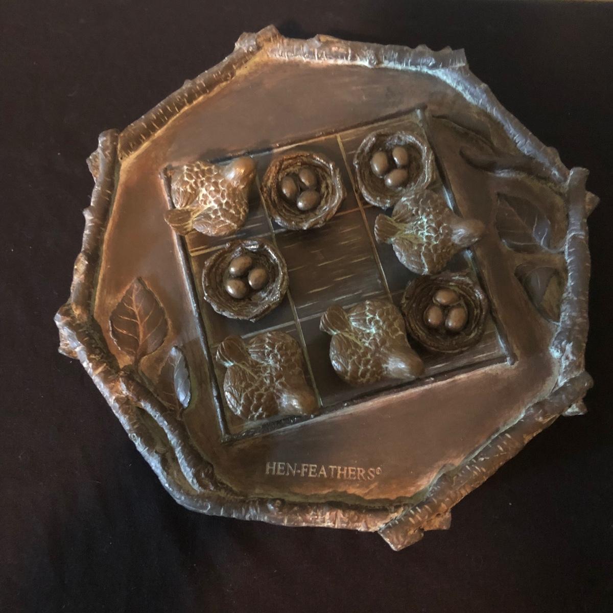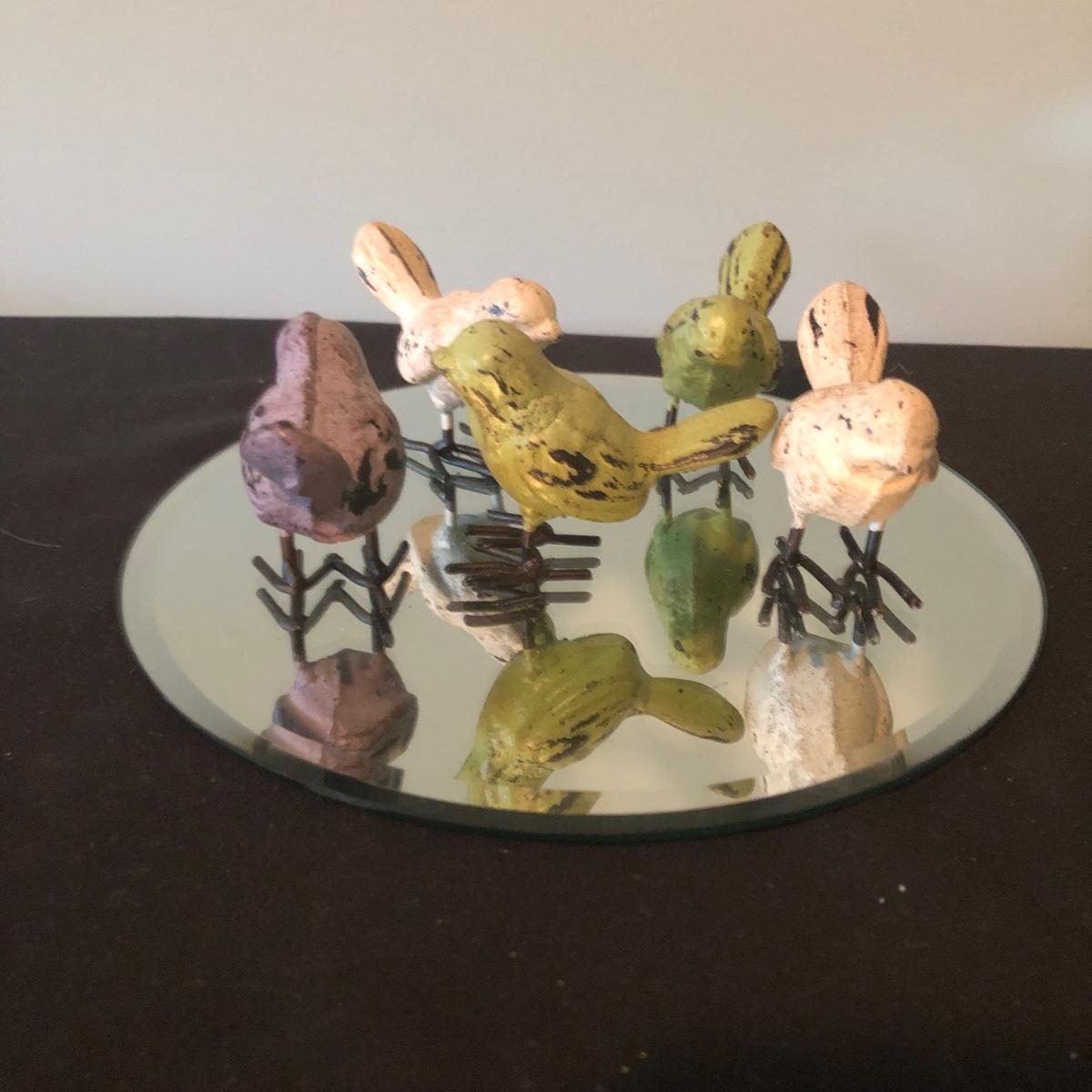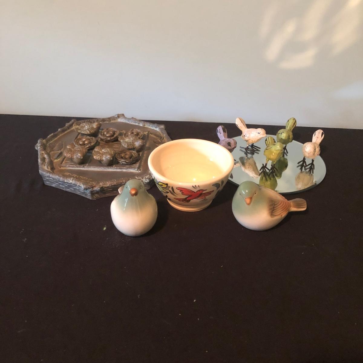 Lot includes five painted iron birds with mirror, Hen-Feathers tic tac toe set, small bowl and two ceramic birds. Hen feather board measures 10”D x 1.25” tall.
