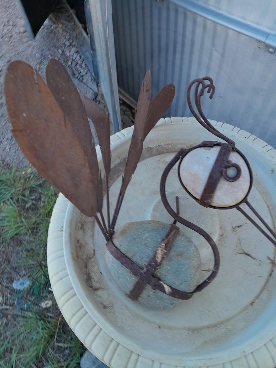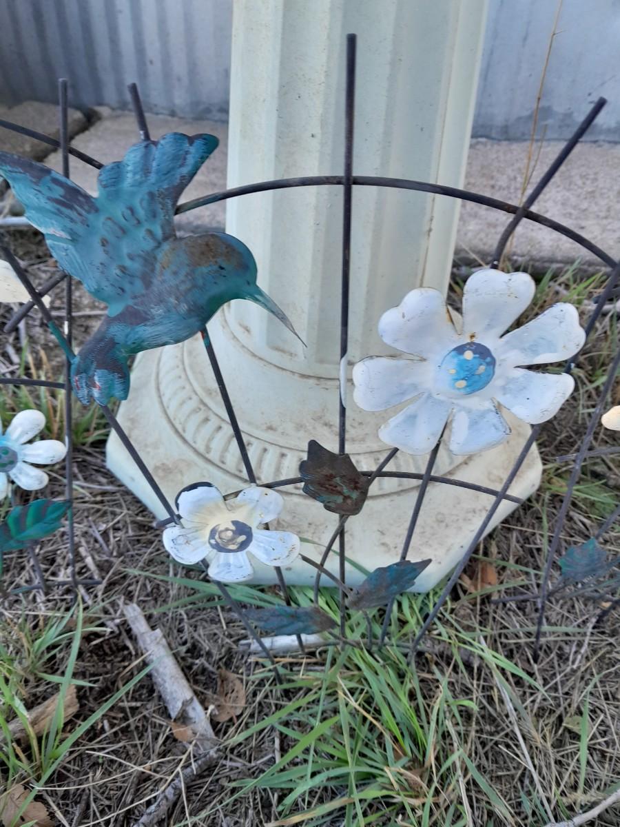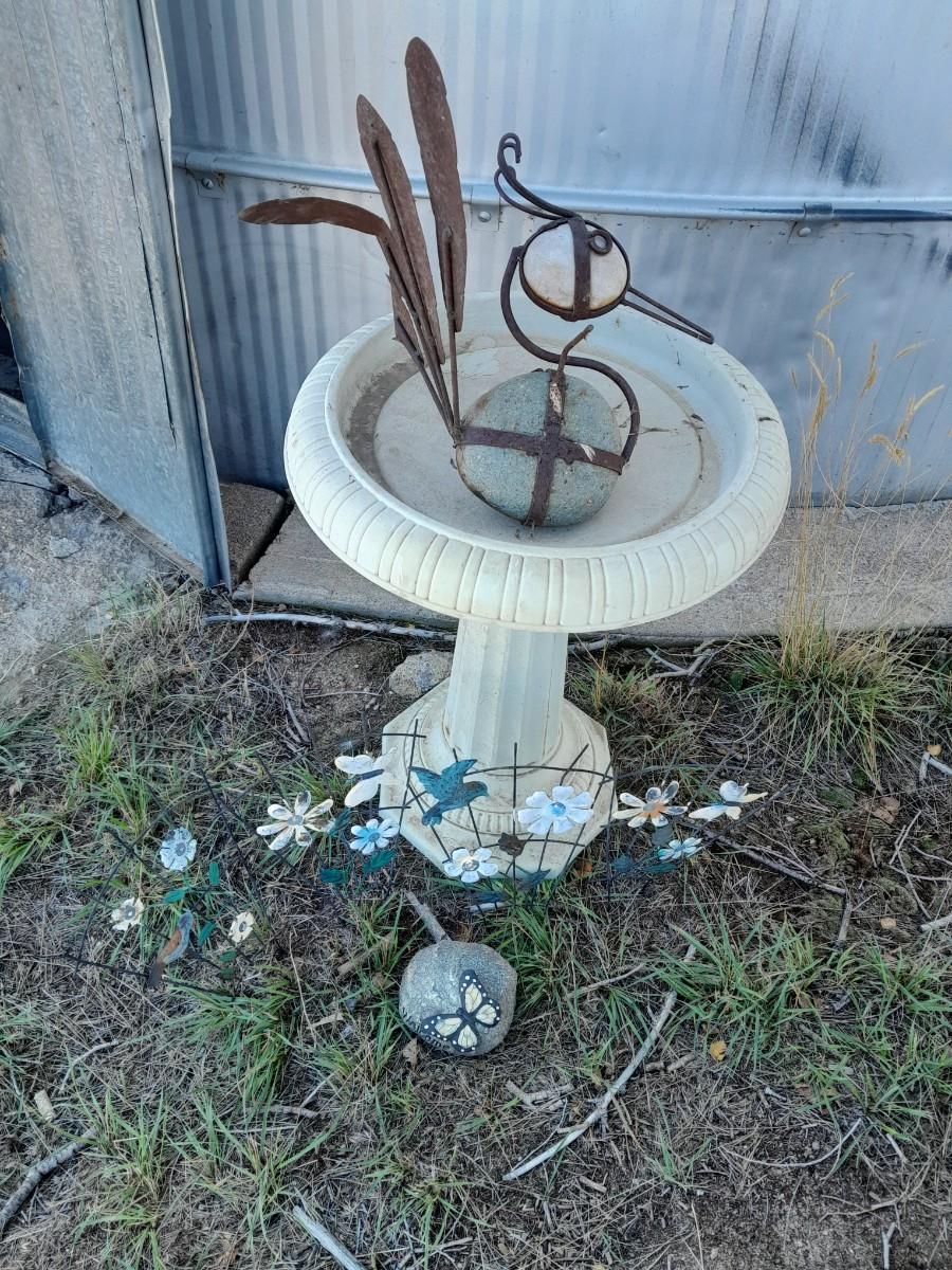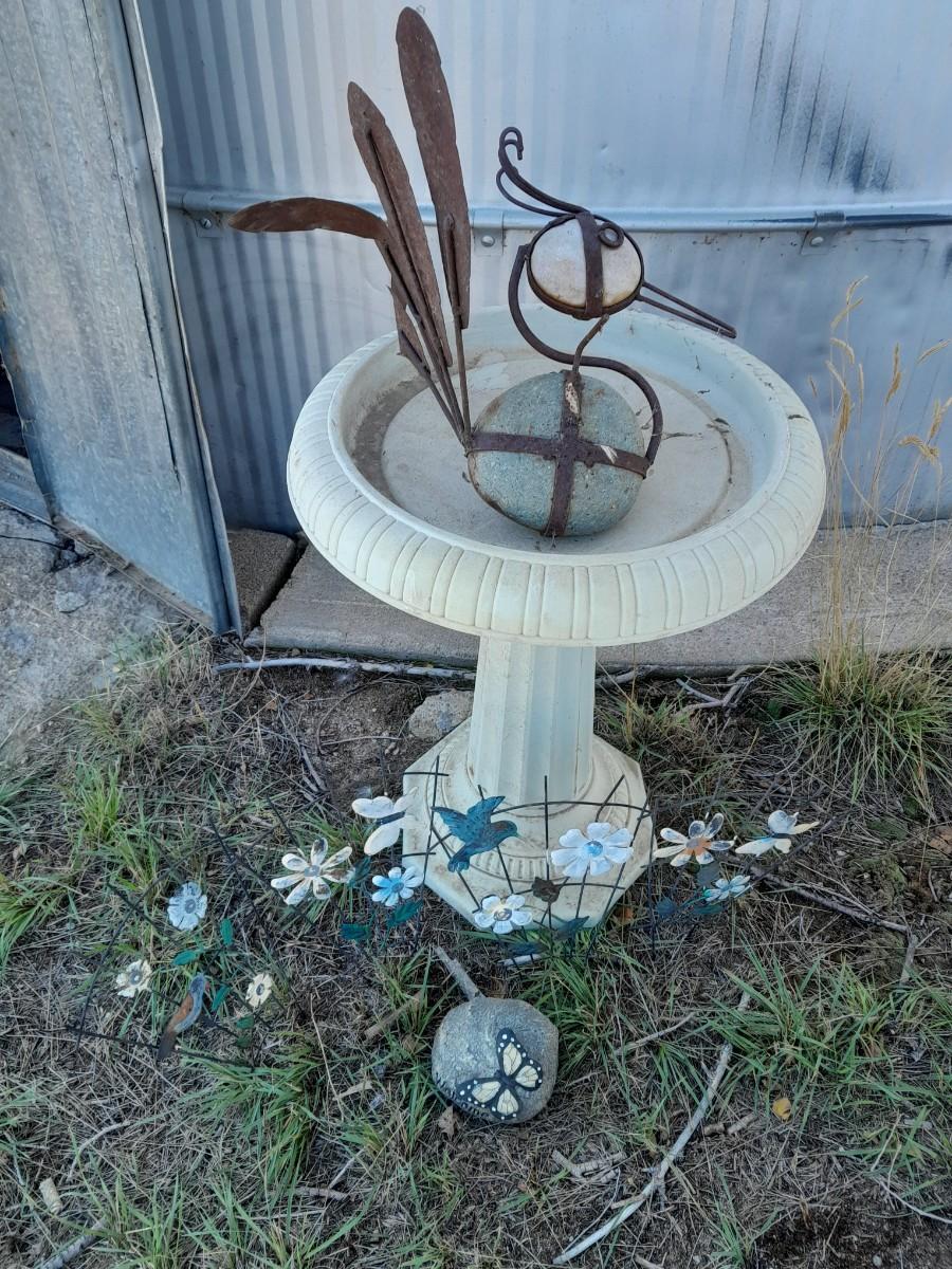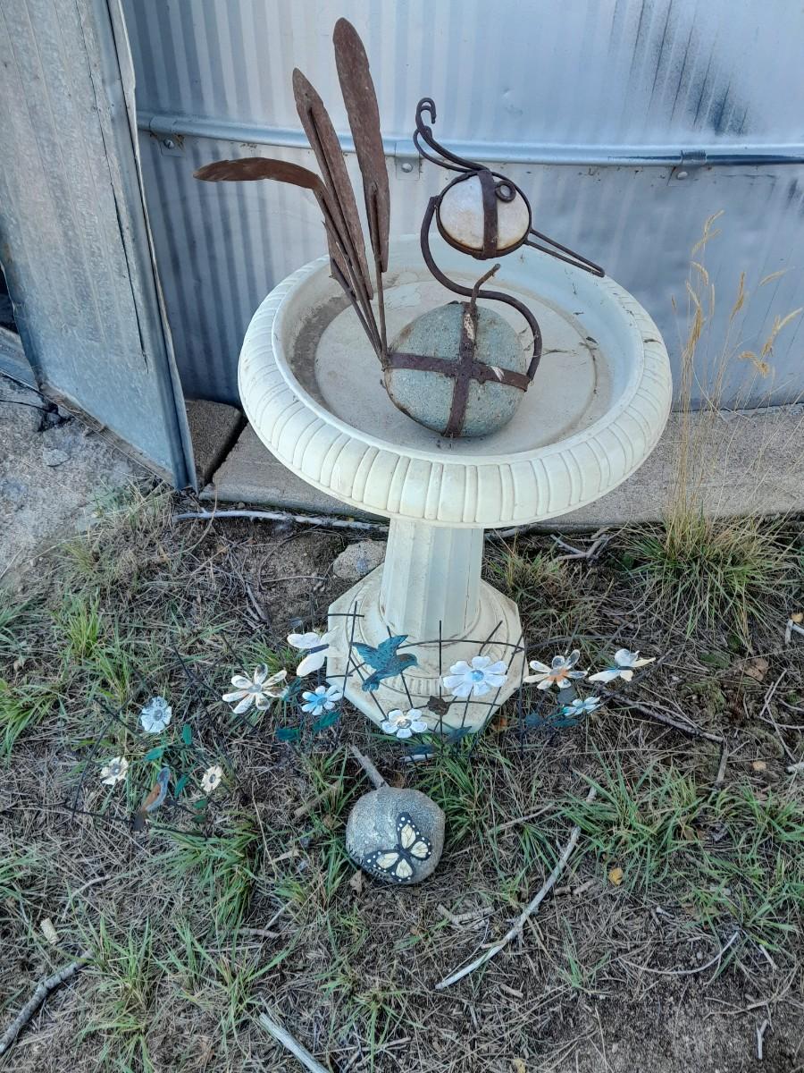 BIRD BATH 24" TALL WITH METAL FRAMED, ROCK CENTERED BIRD AND SMALL TRELLIS YARD / GARDEN DECORATIONS AND BUTTERFLY HIDE A KEY ROCK