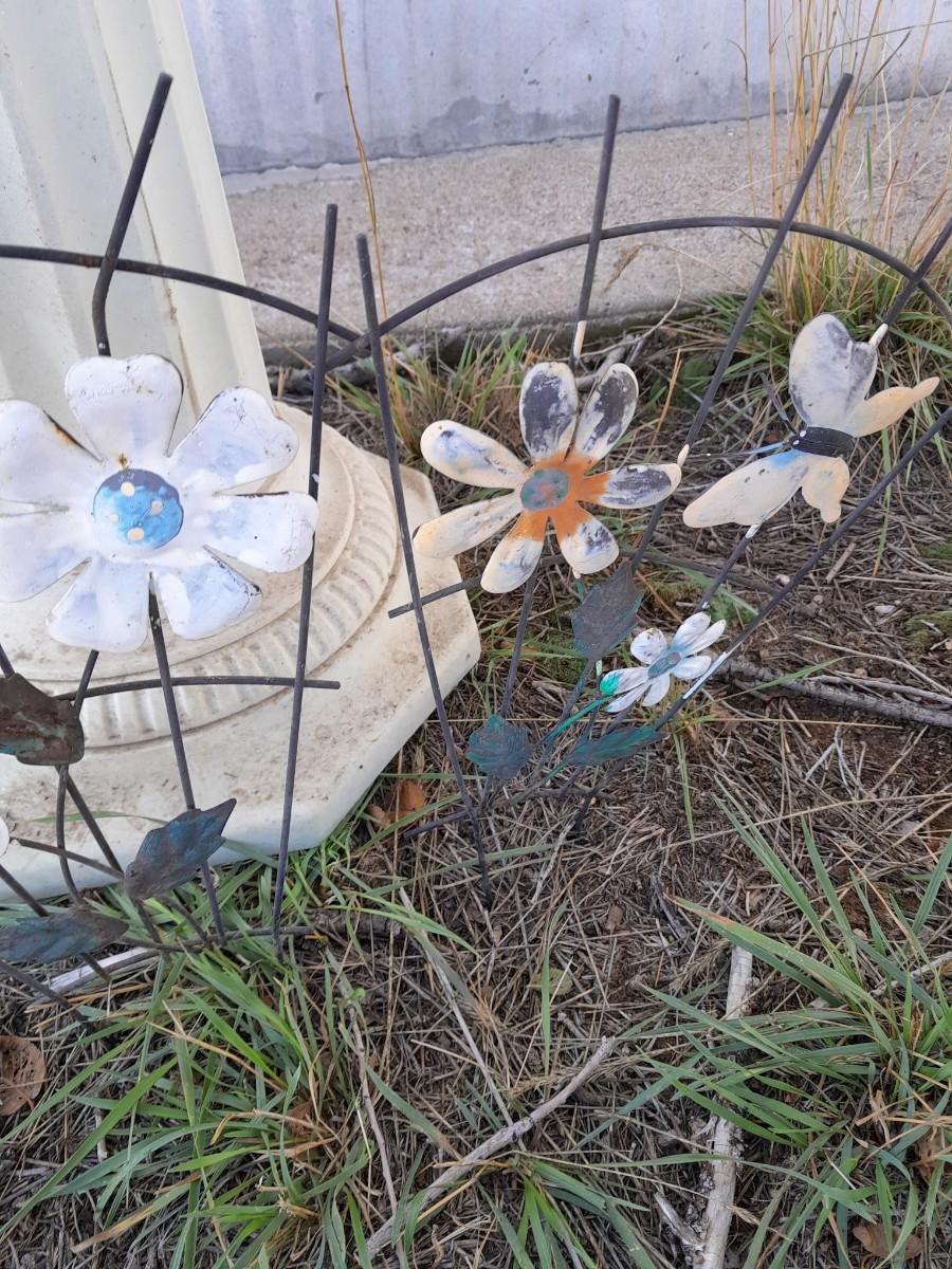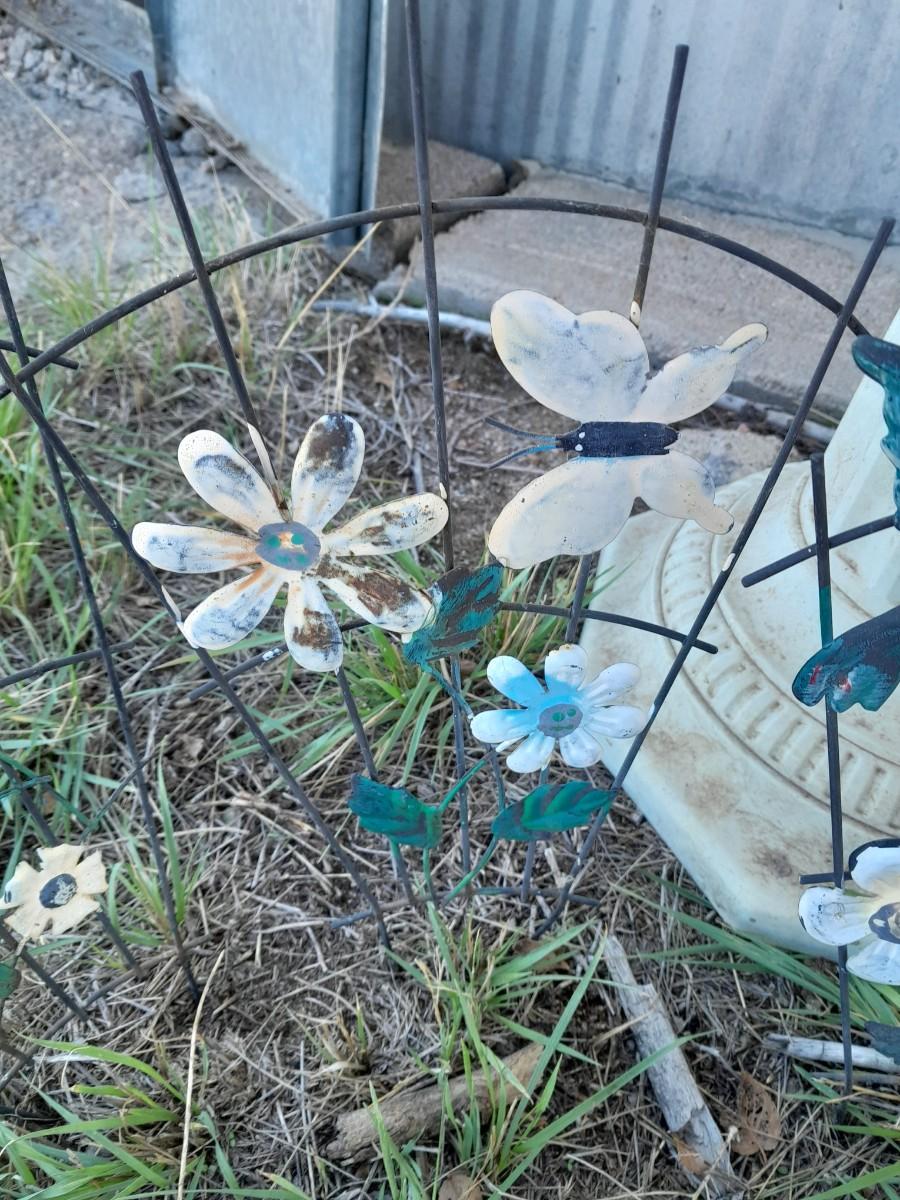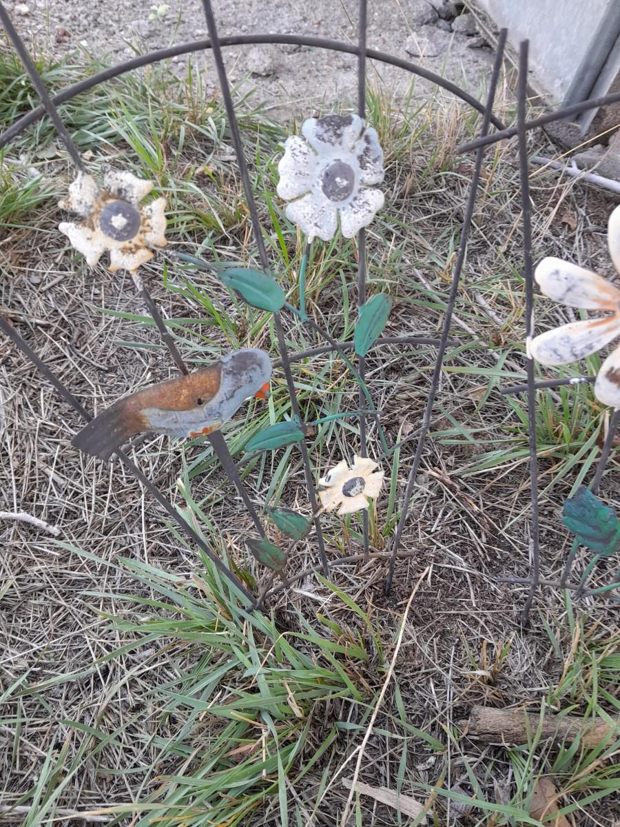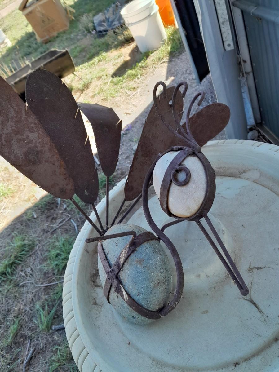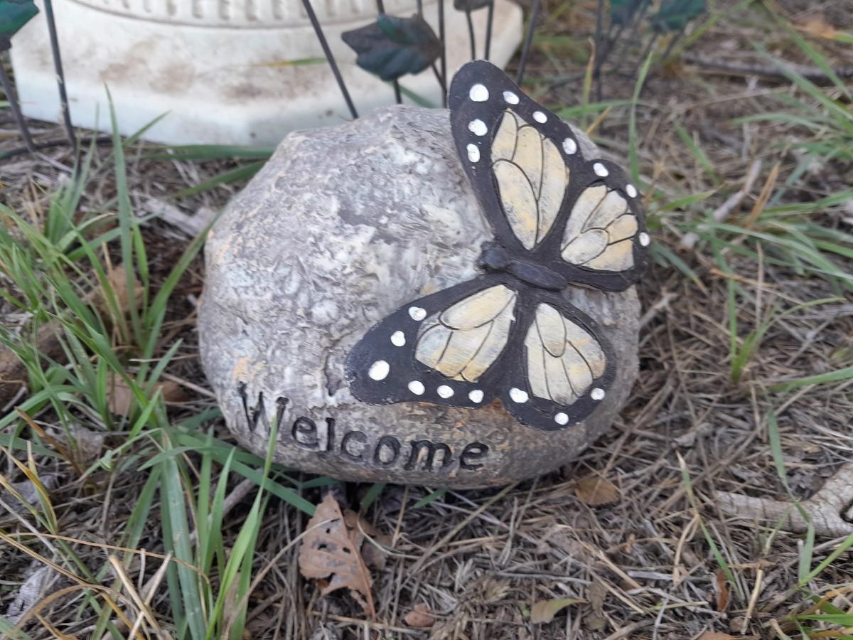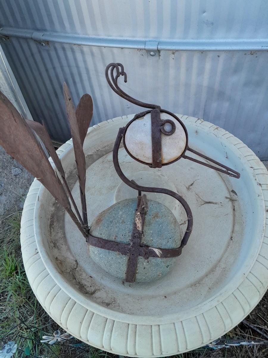 BIRD BATH 24" TALL WITH METAL FRAMED, ROCK CENTERED BIRD AND SMALL TRELLIS YARD / GARDEN DECORATIONS AND BUTTERFLY HIDE A KEY ROCK