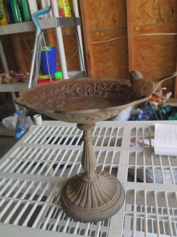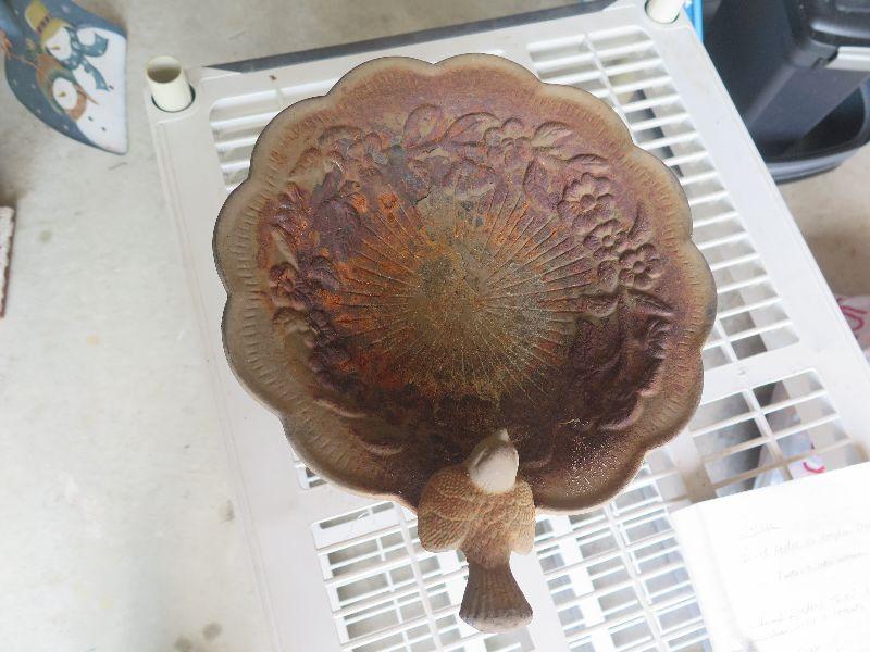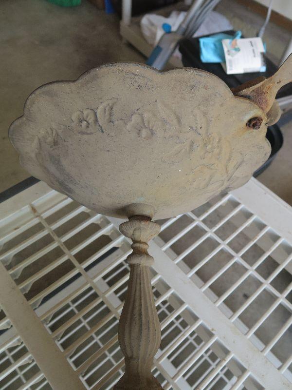 Iron bird bath, 11 inches tall. Fluted stand, bowl is detailed with flowers and a bird perched on rim. Inside bowl is rusty. **Please read Terms and Conditions before placing a bid. Pick up is Wednesday July 31st, from 2 pm to 7pm in Sicklerville. All sales are final. All sales are as is, where is. Please review all photos. Any props included in photos are not included in listing. All measurements are approximate.