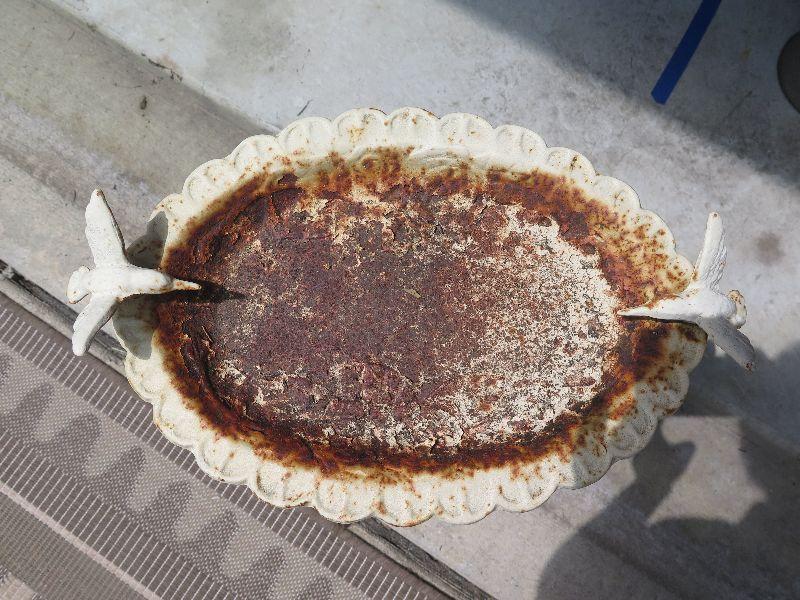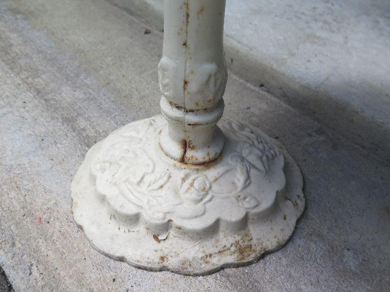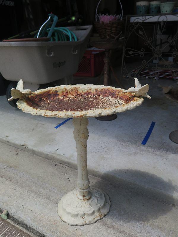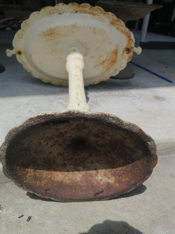 Scalloped rim, iron bird bath with scalloped base, 18 inches tall. Two birds attached on top. Rusty, but charming. **Please read Terms and Conditions before placing a bid. Pick up is Wednesday July 31st, from 2 pm to 7pm in Sicklerville. All sales are final. All sales are as is, where is. Please review all photos. Any props included in photos are not included in listing. All measurements are approximate.