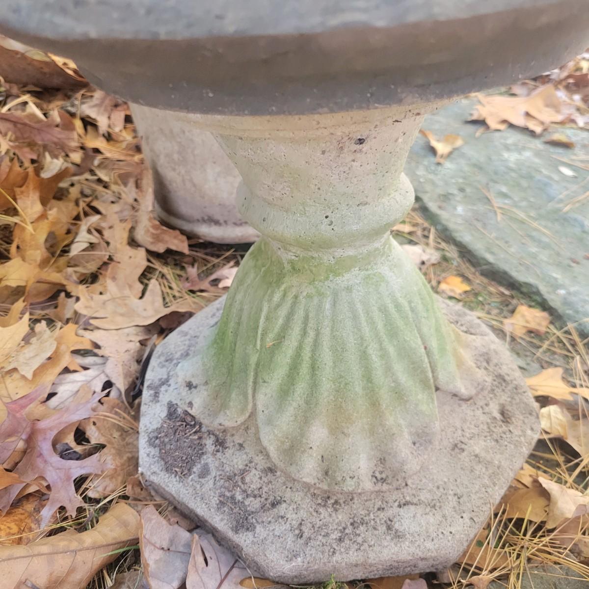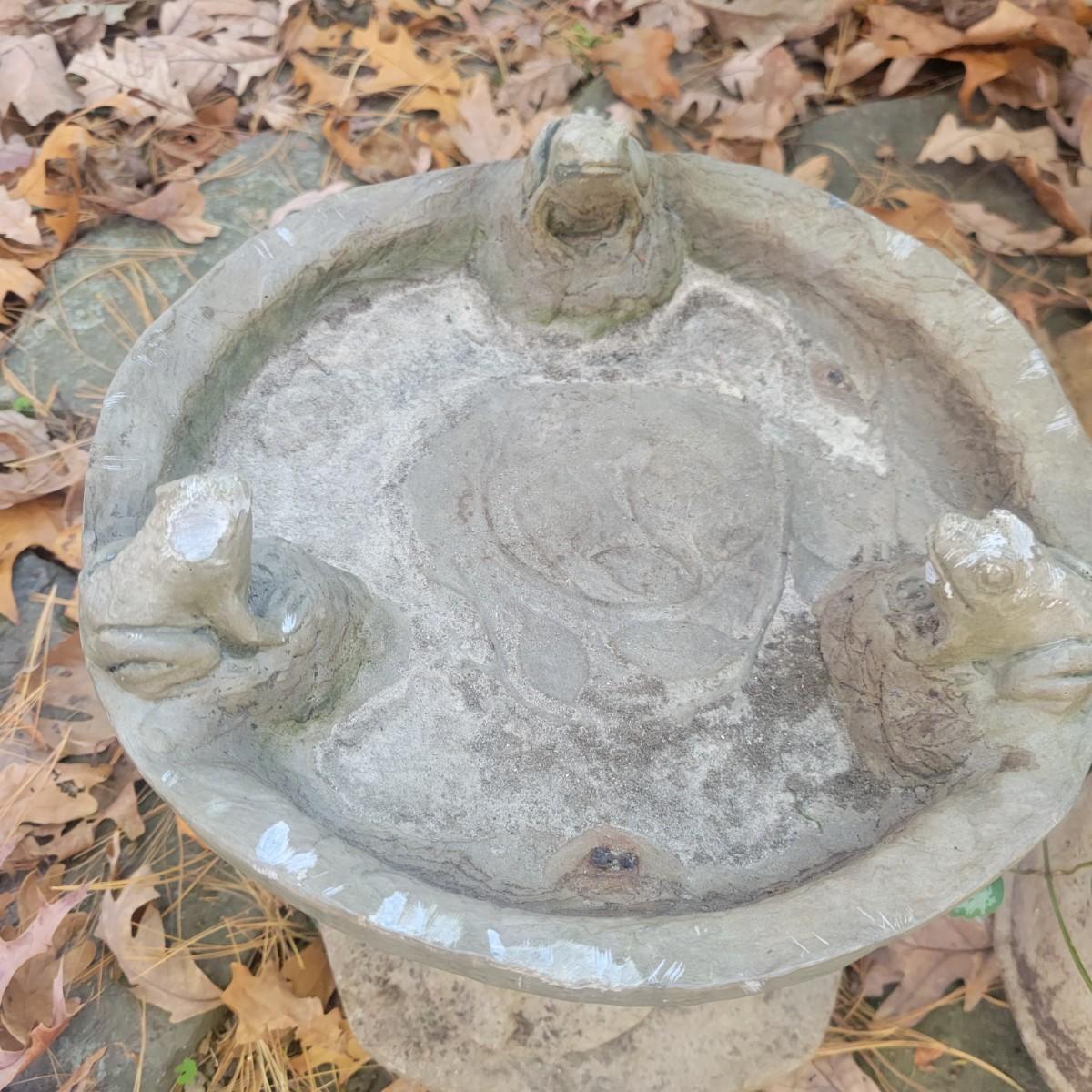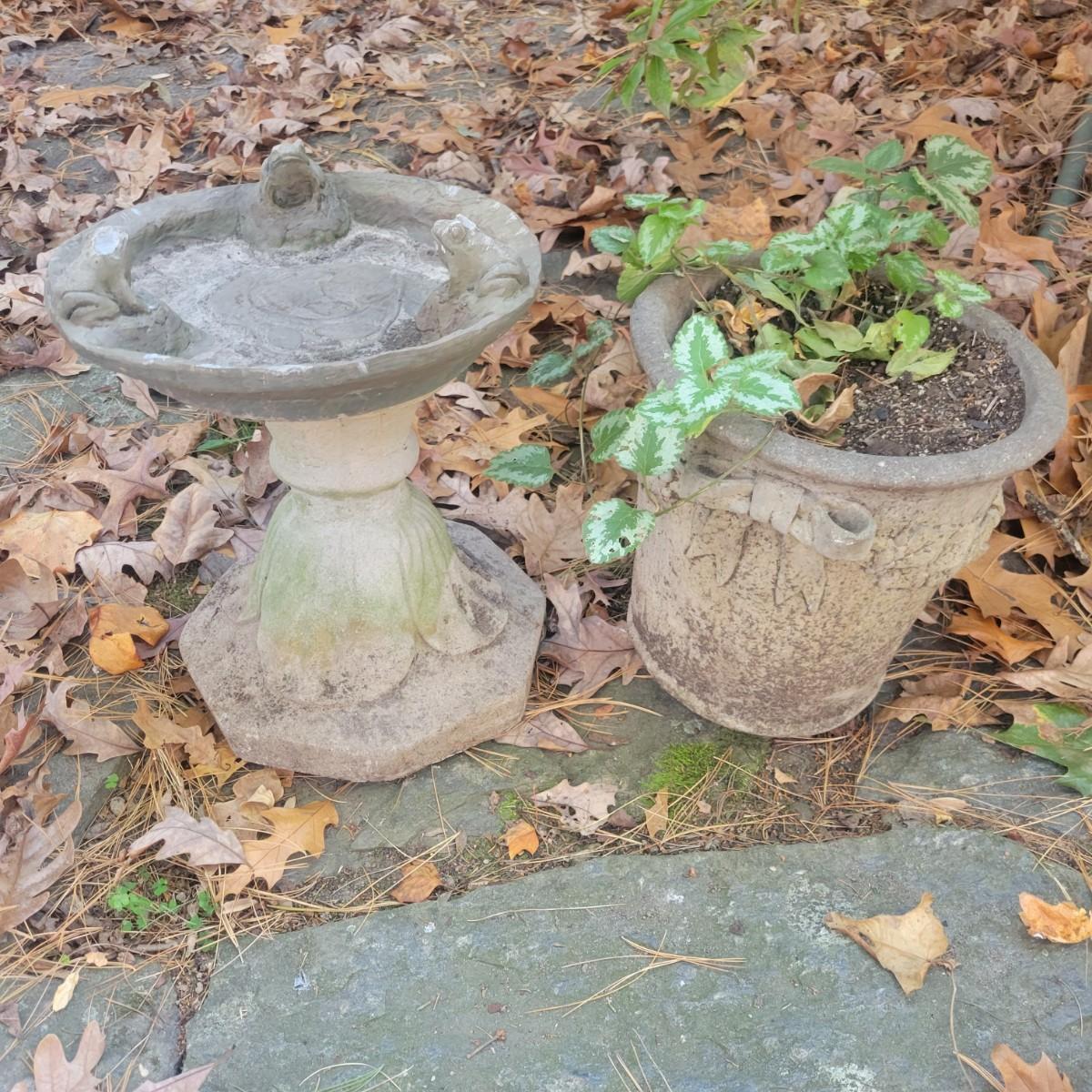 A bird bath that has a cement base and resin basin that has frogs on it. It measures approximately 12"D x 15"H. Also included is a cement planter that has bows and fruit as decoration. Local pickup only