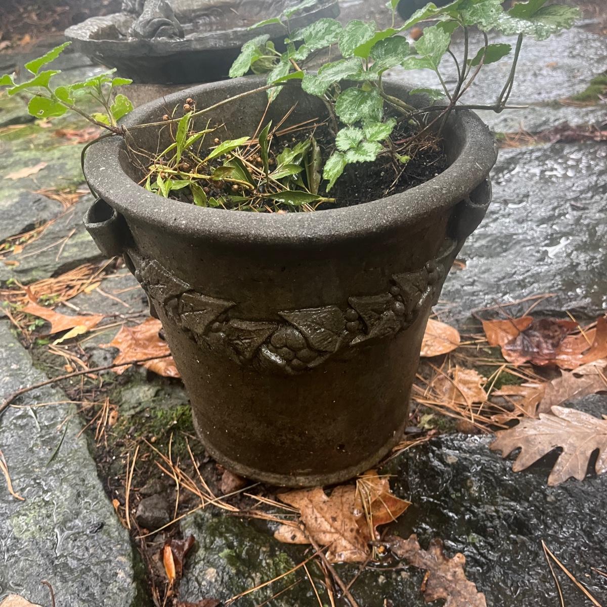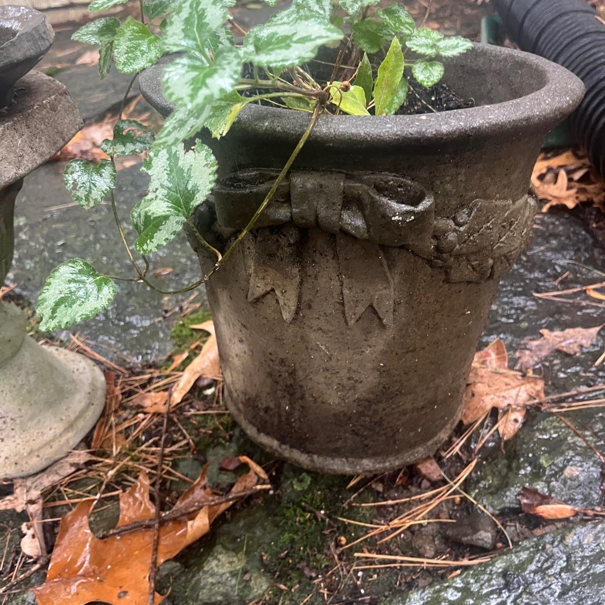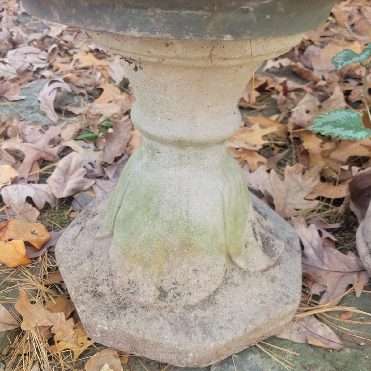 A bird bath that has a cement base and resin basin that has frogs on it. It measures approximately 12"D x 15"H. Also included is a cement planter that has bows and fruit as decoration. Local pickup only