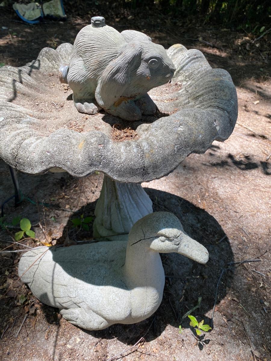Concrete Bird Bath, Concrete Duck, Rabbit Sprinkler, Bottle Tree As Pictured