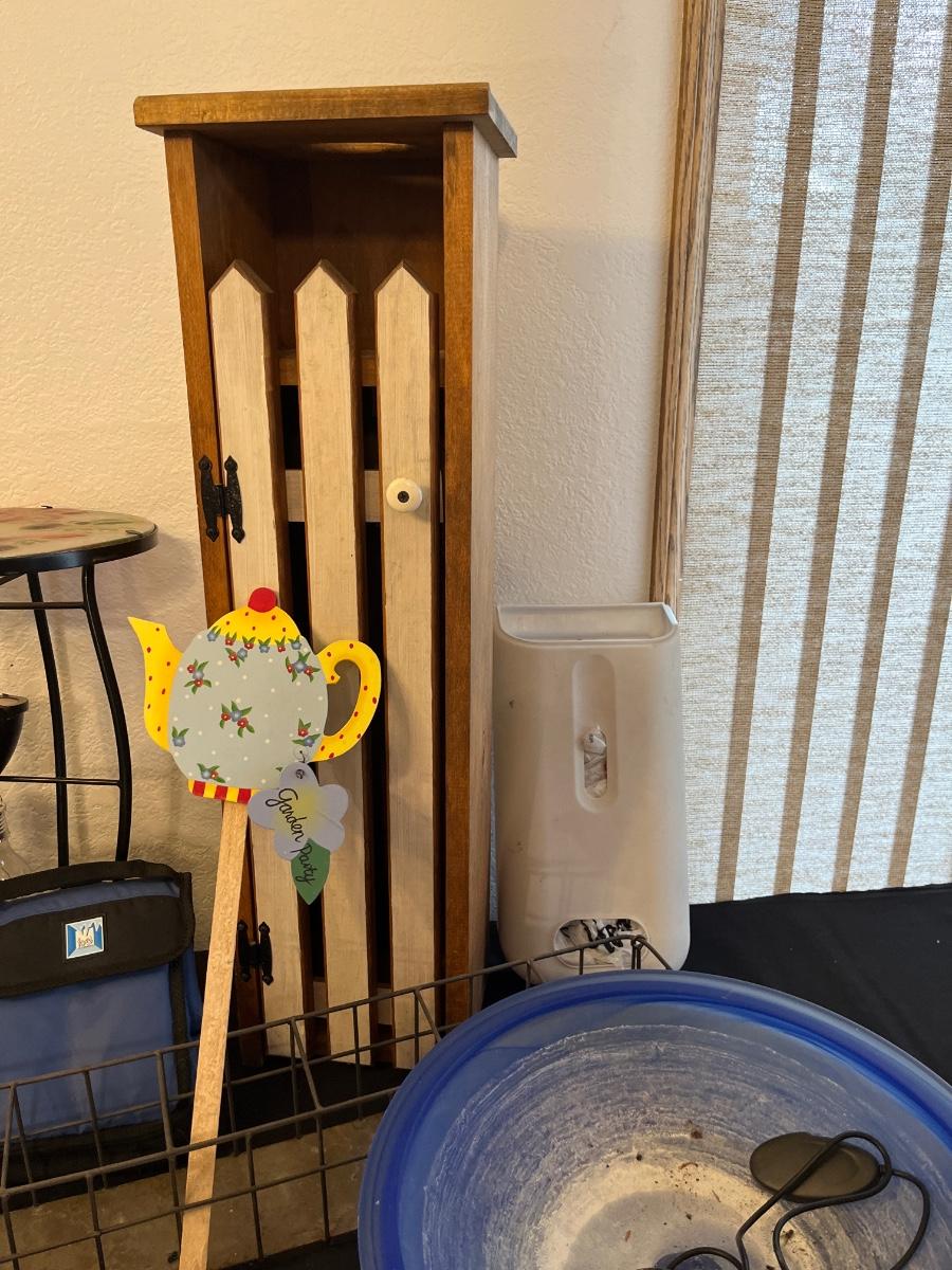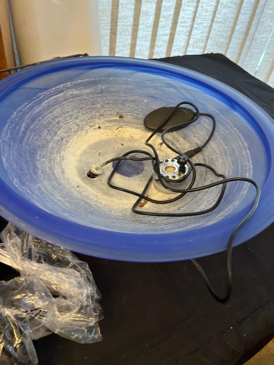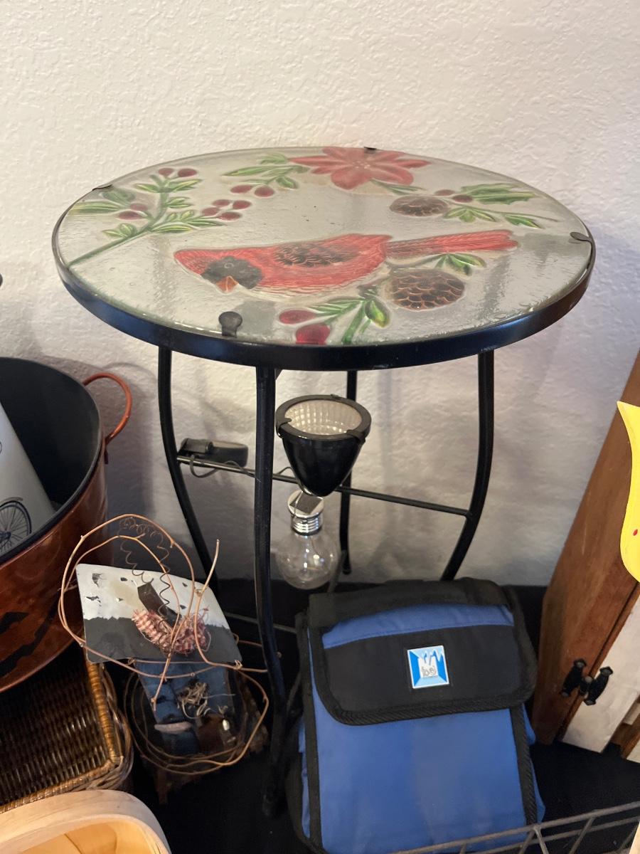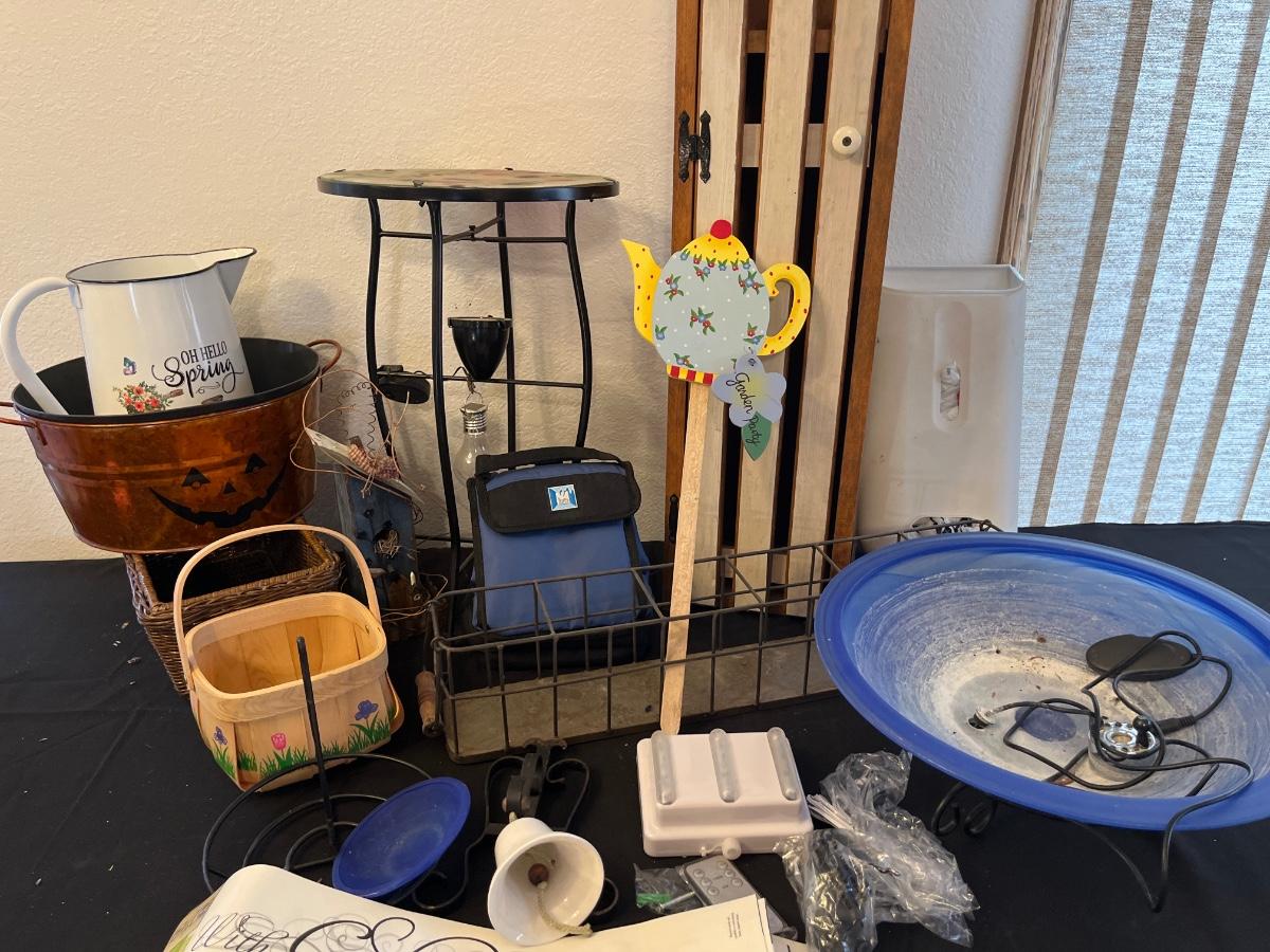 Bird bath with pump, cardinal table, cabinet, etc
