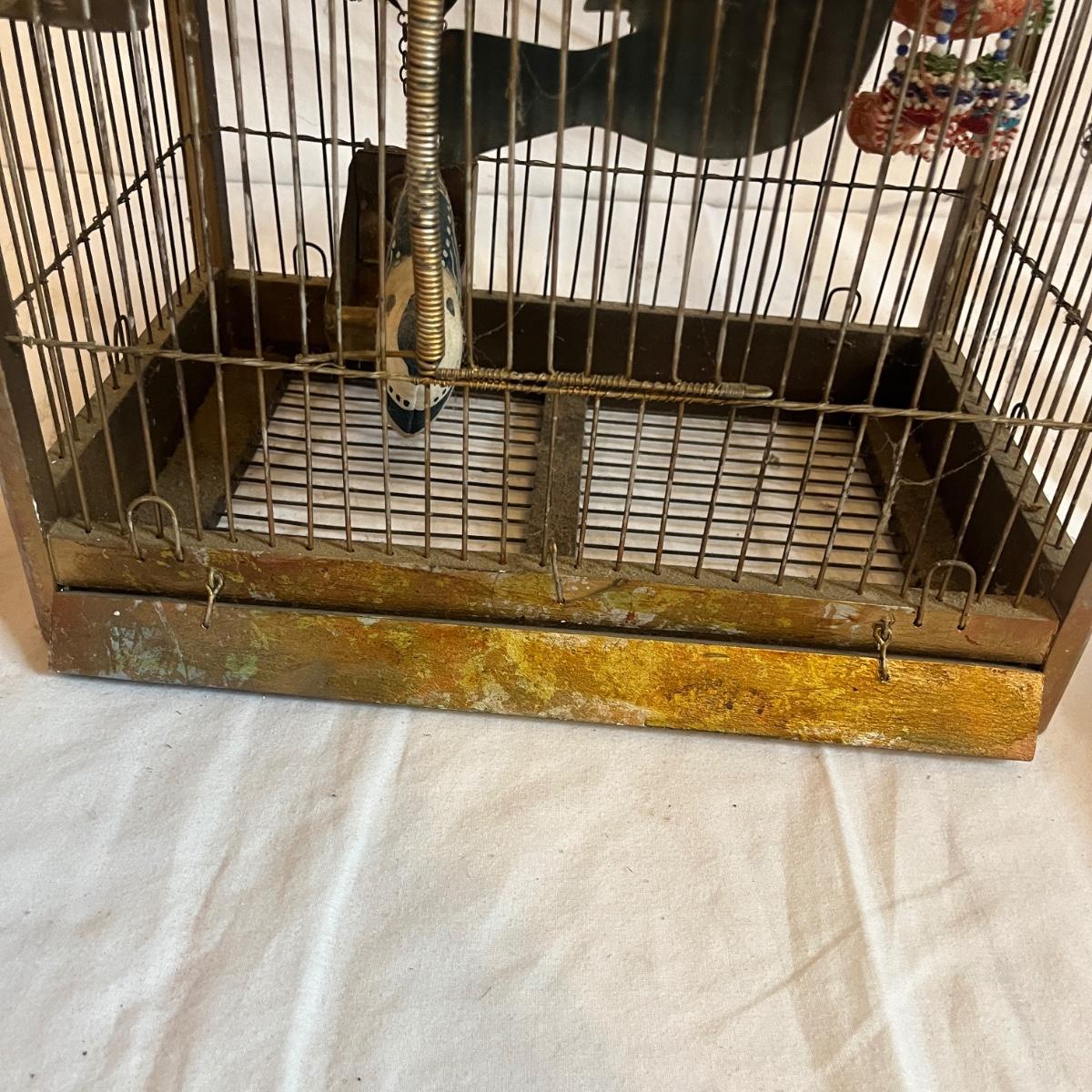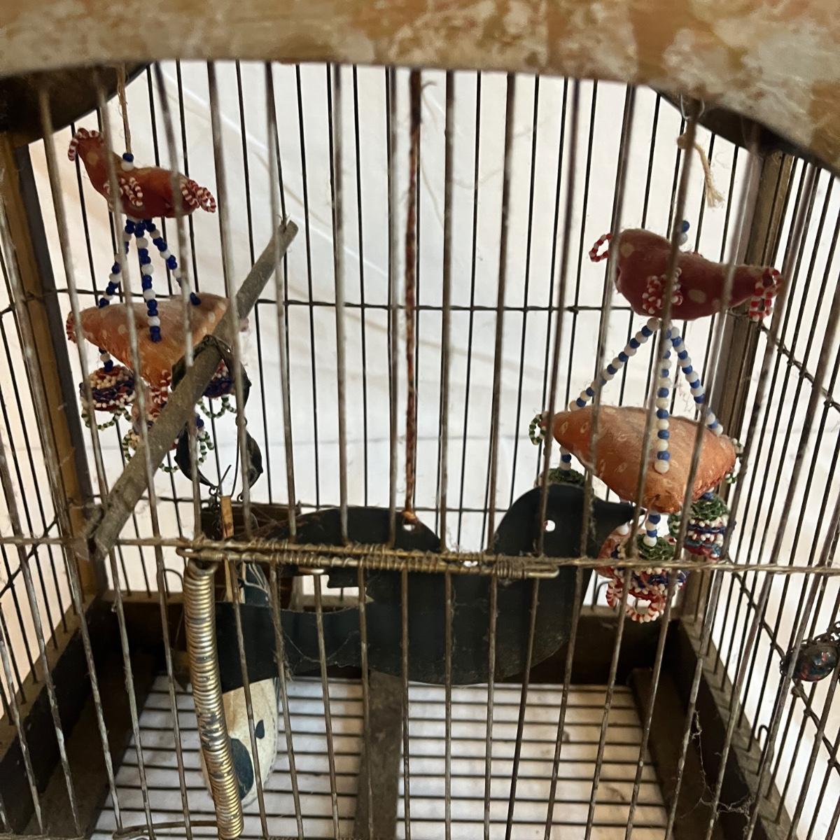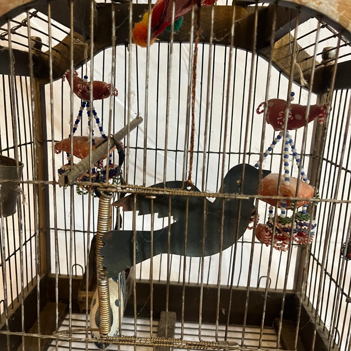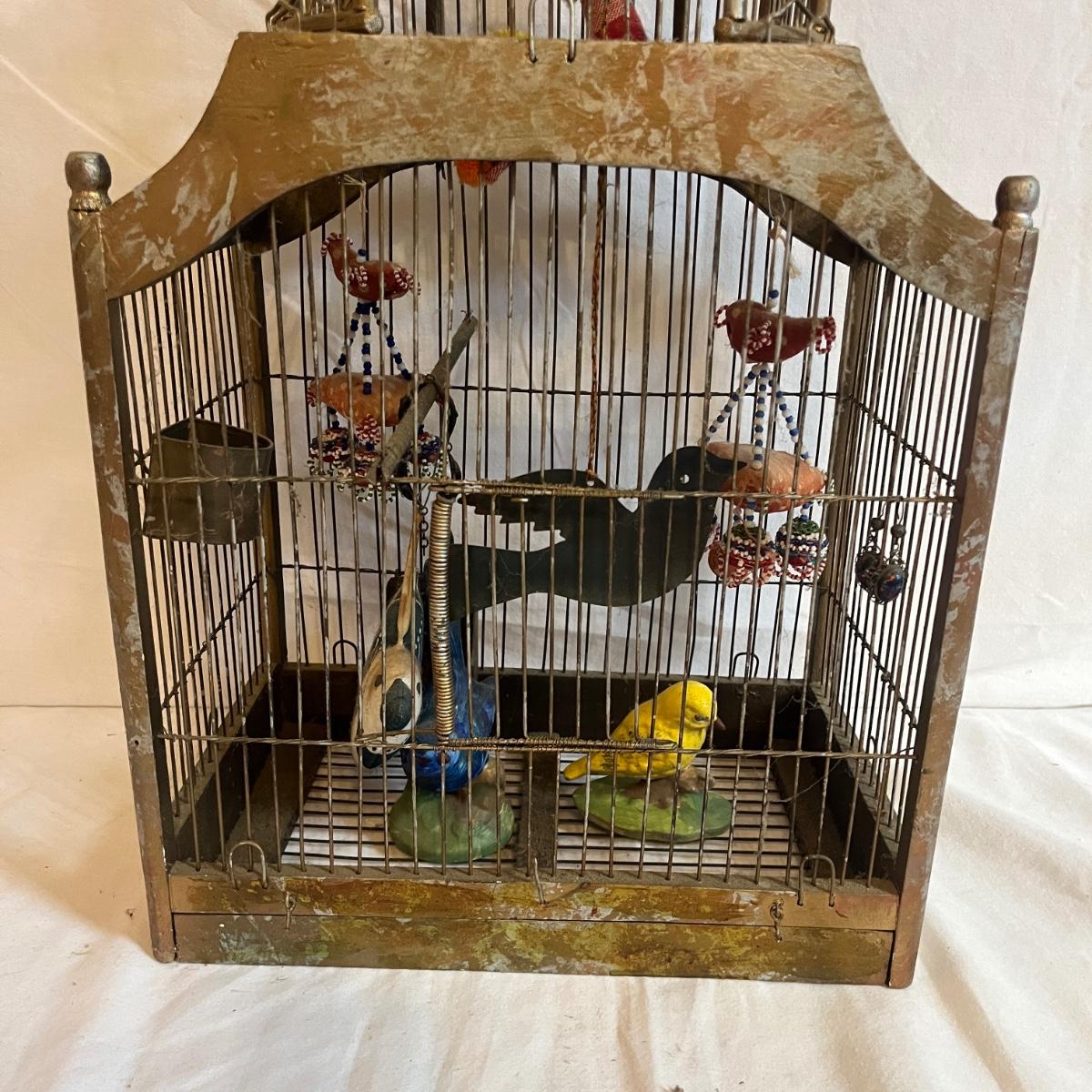 Lot includes a wooden framed birdcage with metal bars. Also includes two ceramic birds and fabric stuffed birds with one metal bird. Cage measures 14” x 9” x 33”H.