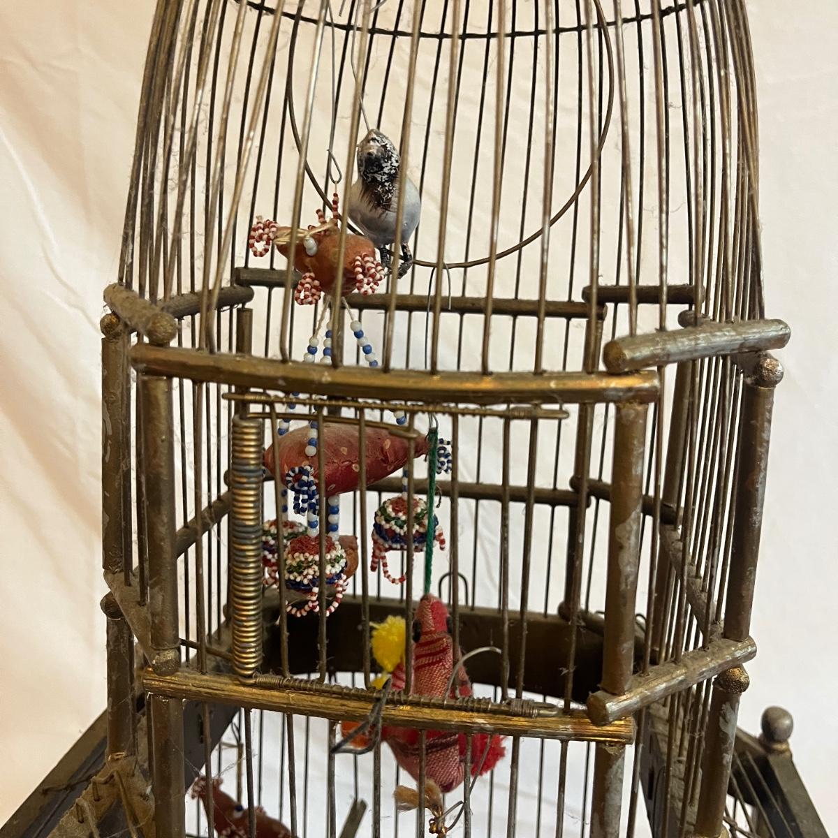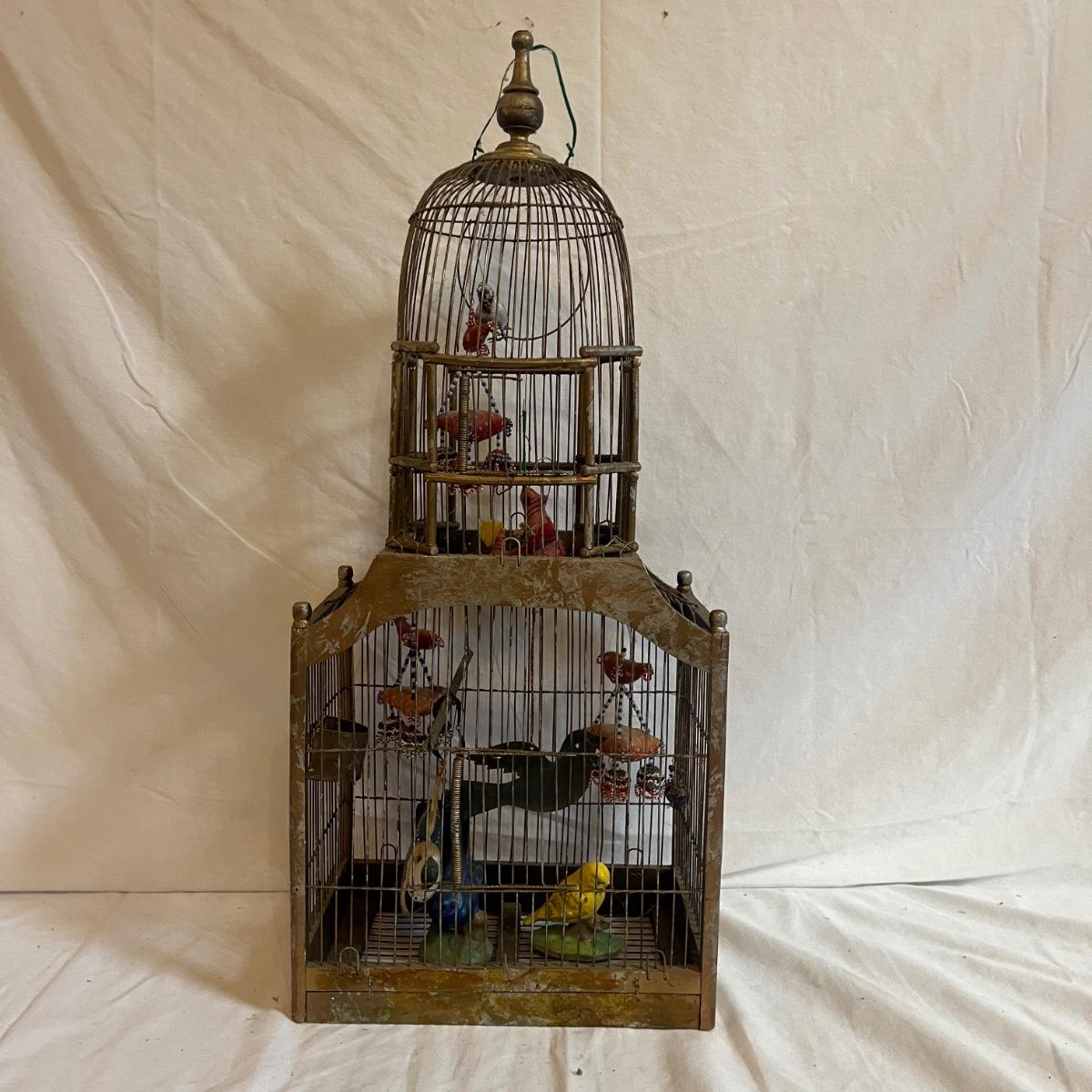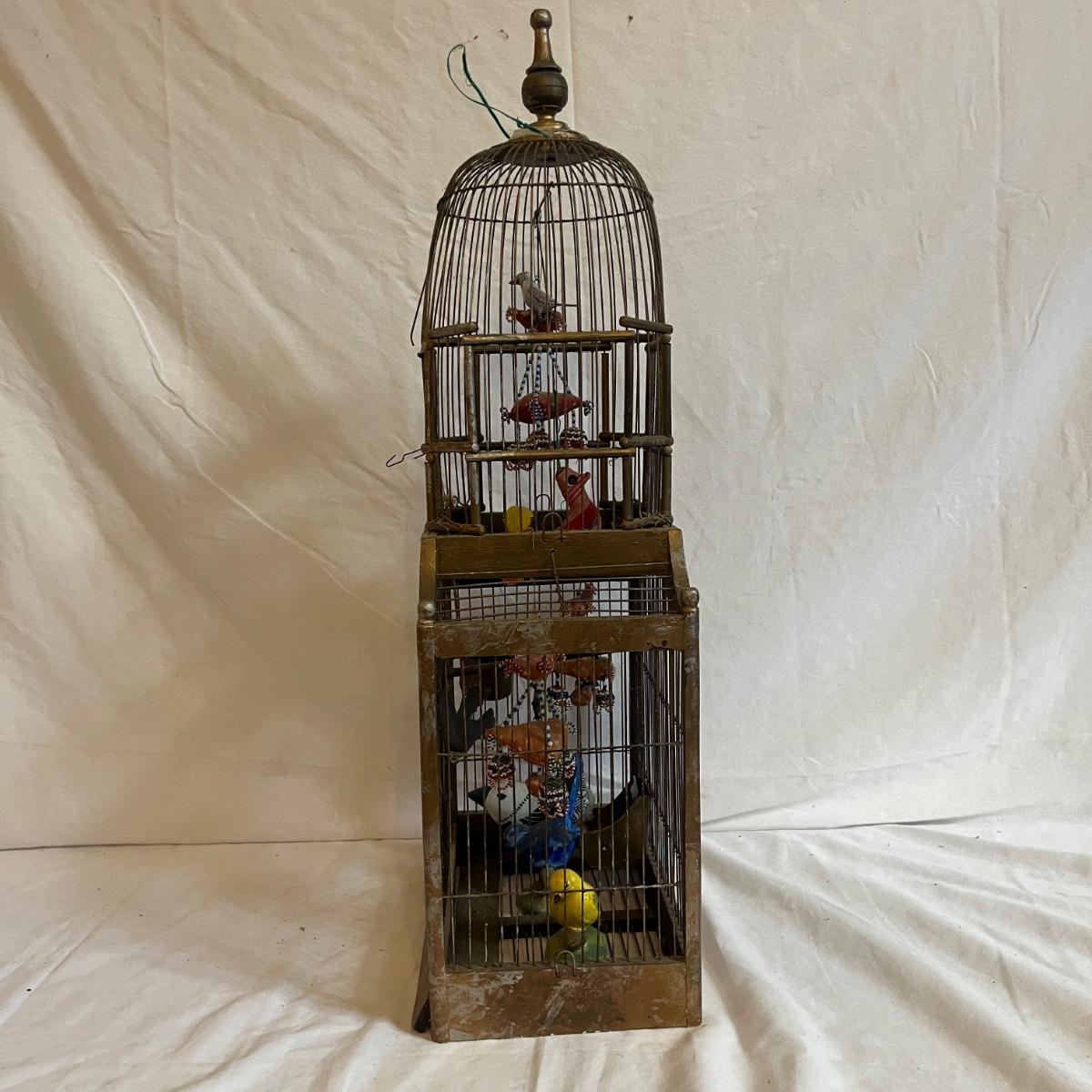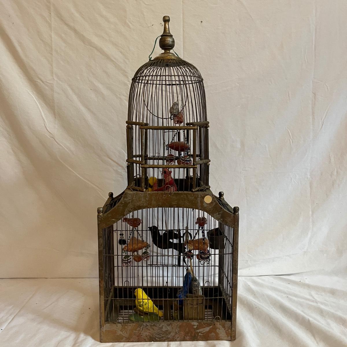 Lot includes a wooden framed birdcage with metal bars. Also includes two ceramic birds and fabric stuffed birds with one metal bird. Cage measures 14” x 9” x 33”H.