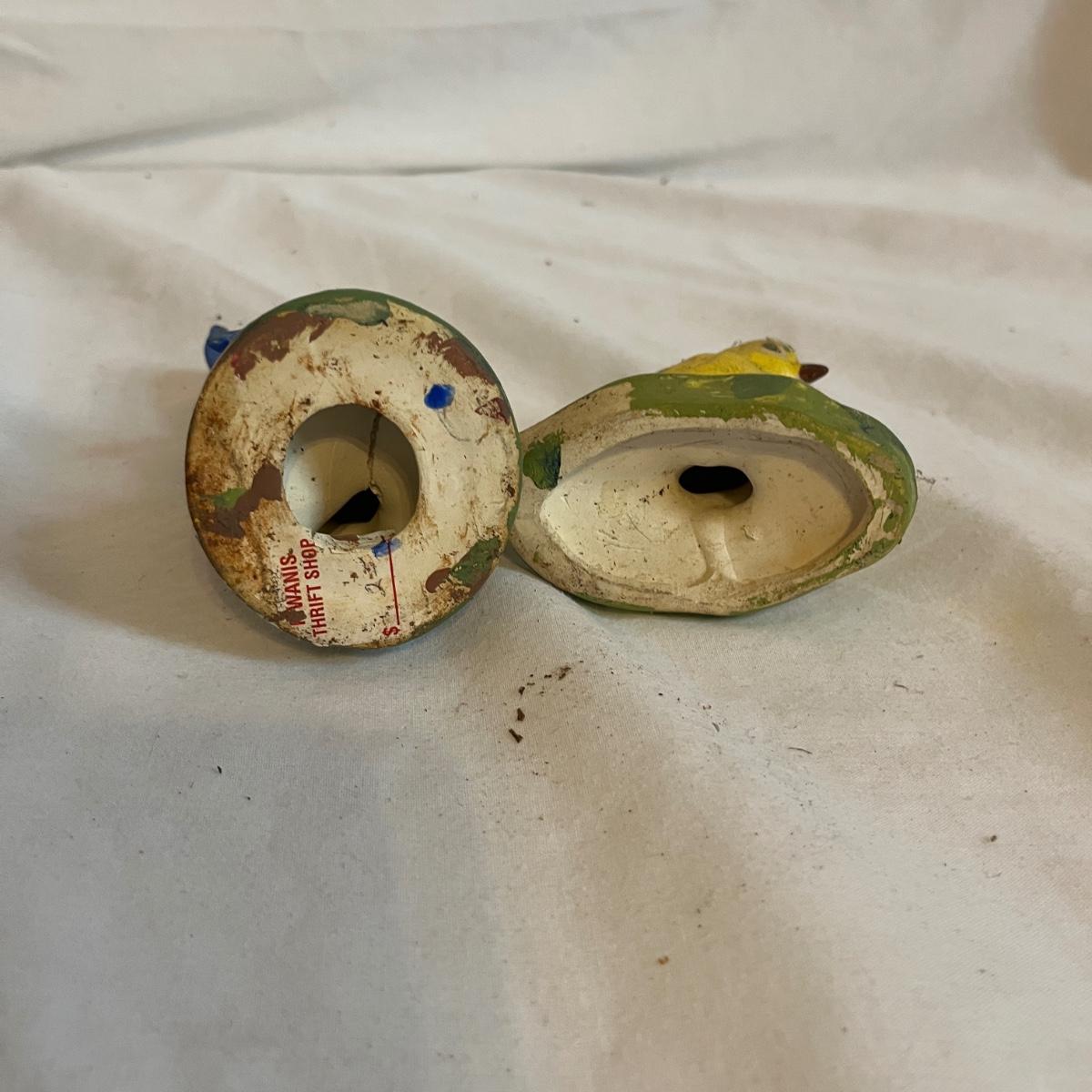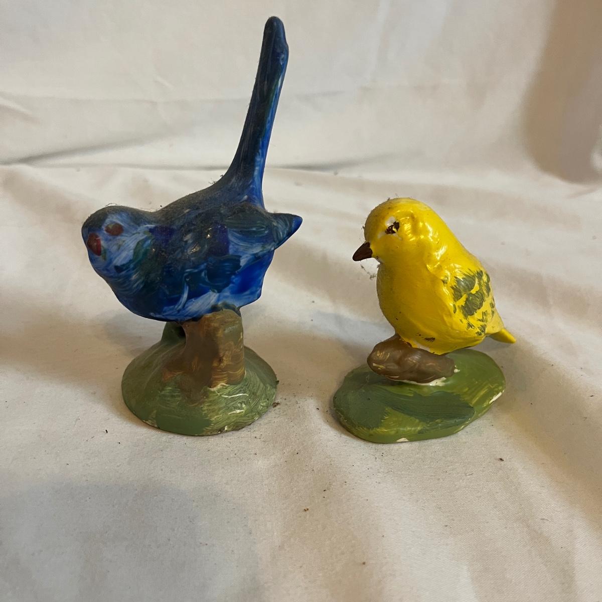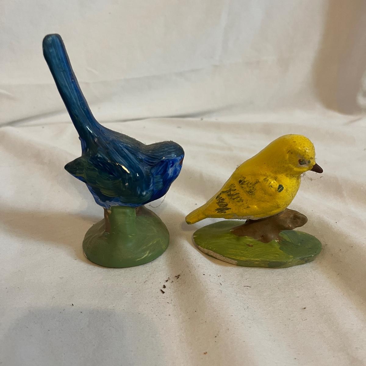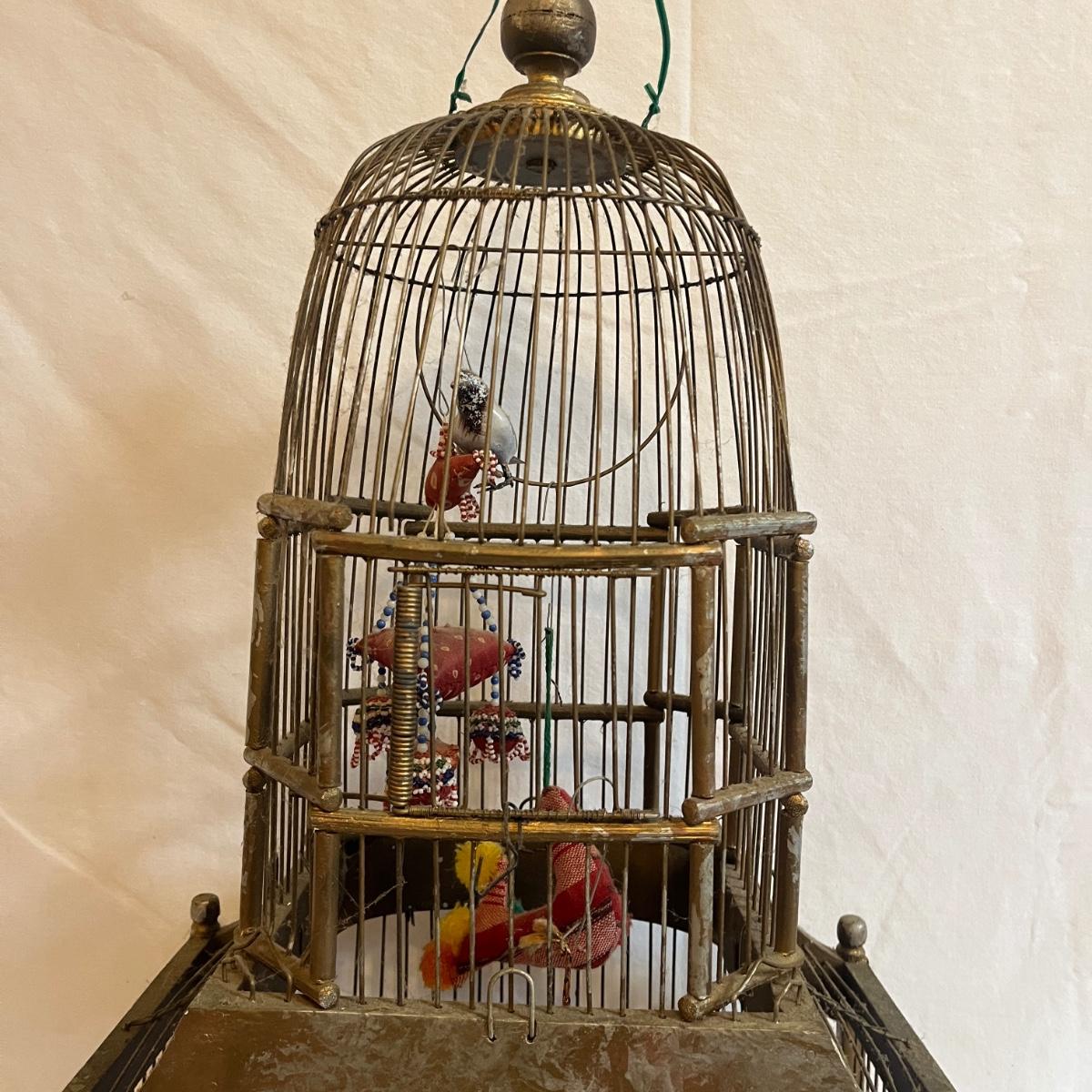 Lot includes a wooden framed birdcage with metal bars. Also includes two ceramic birds and fabric stuffed birds with one metal bird. Cage measures 14” x 9” x 33”H.