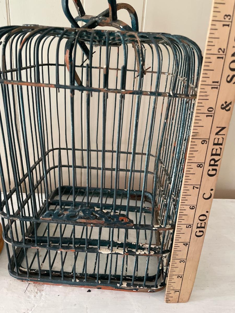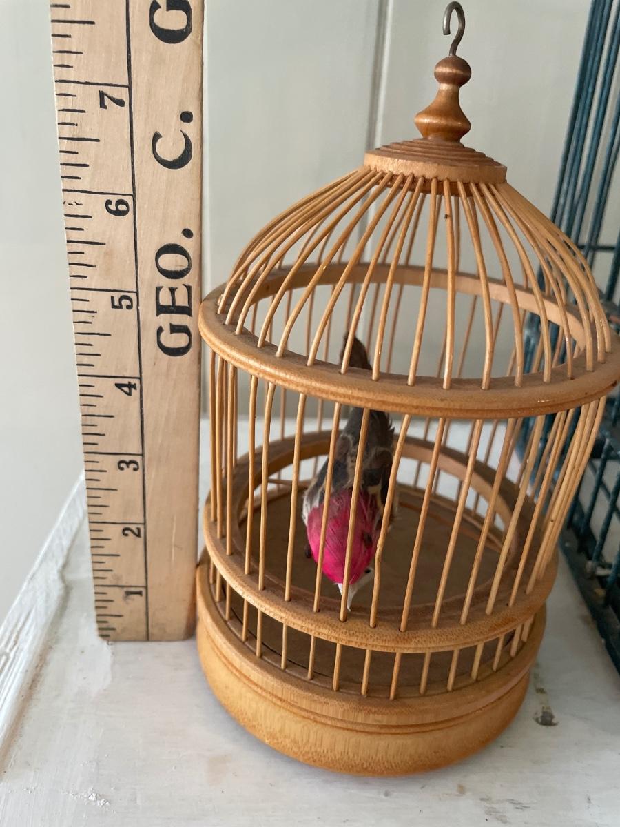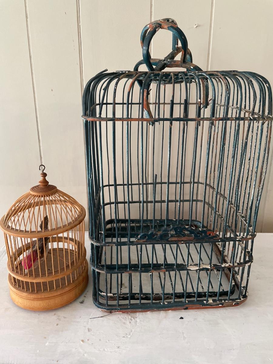 Painted wood bird cage and small wood cage with faux bird