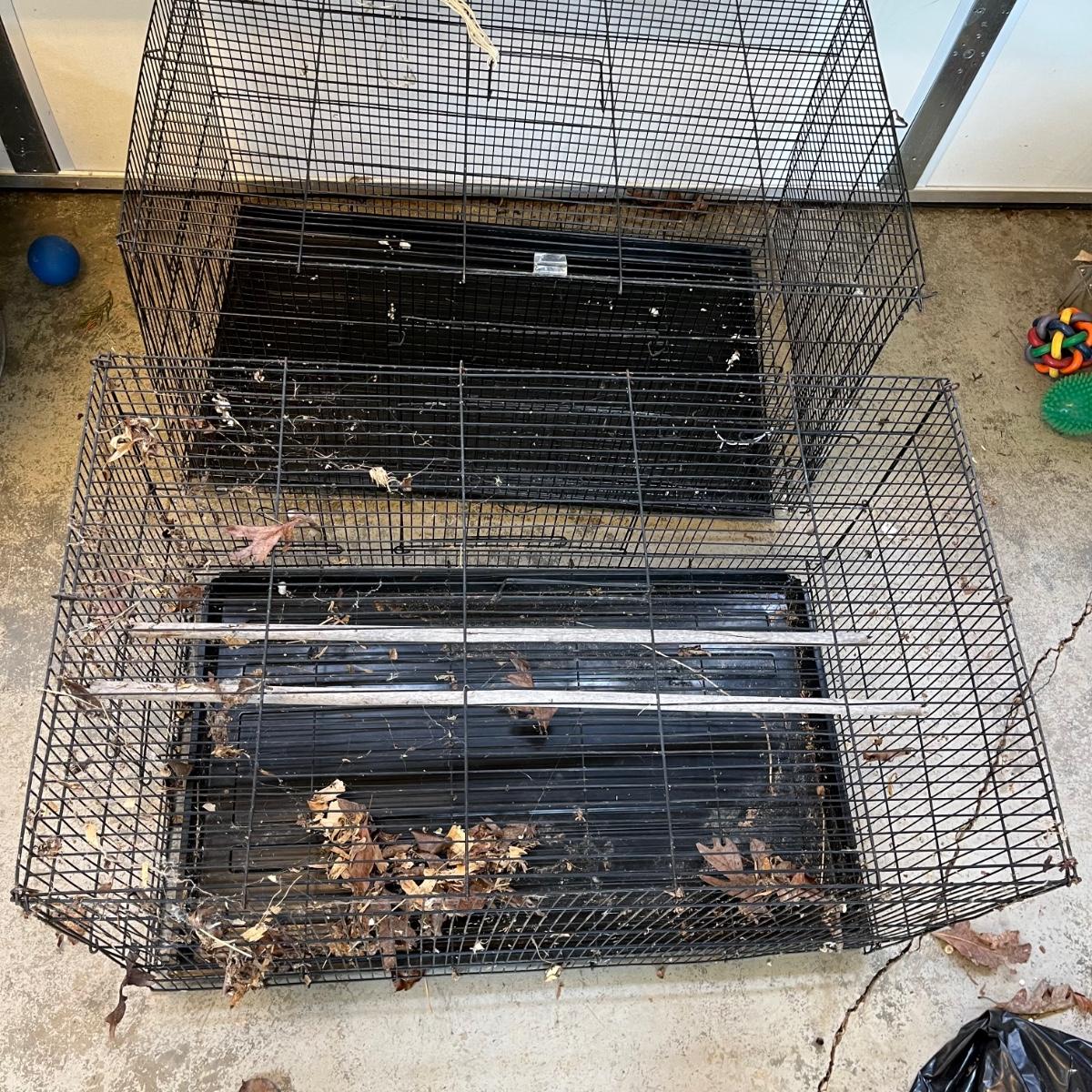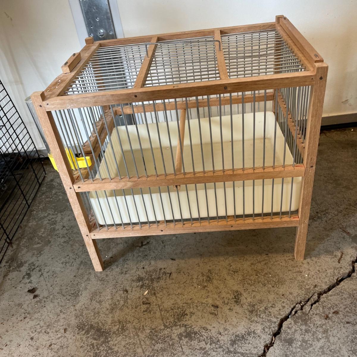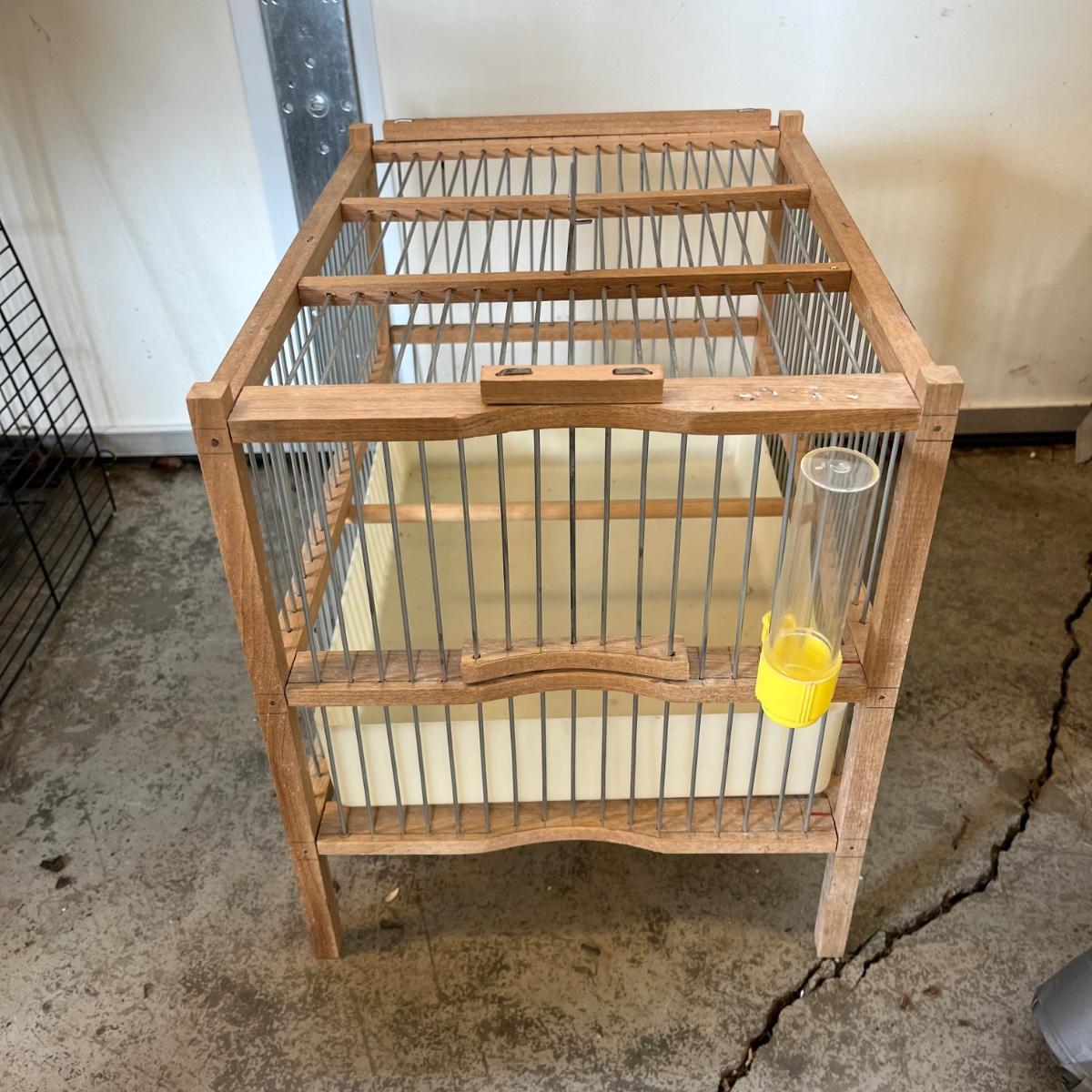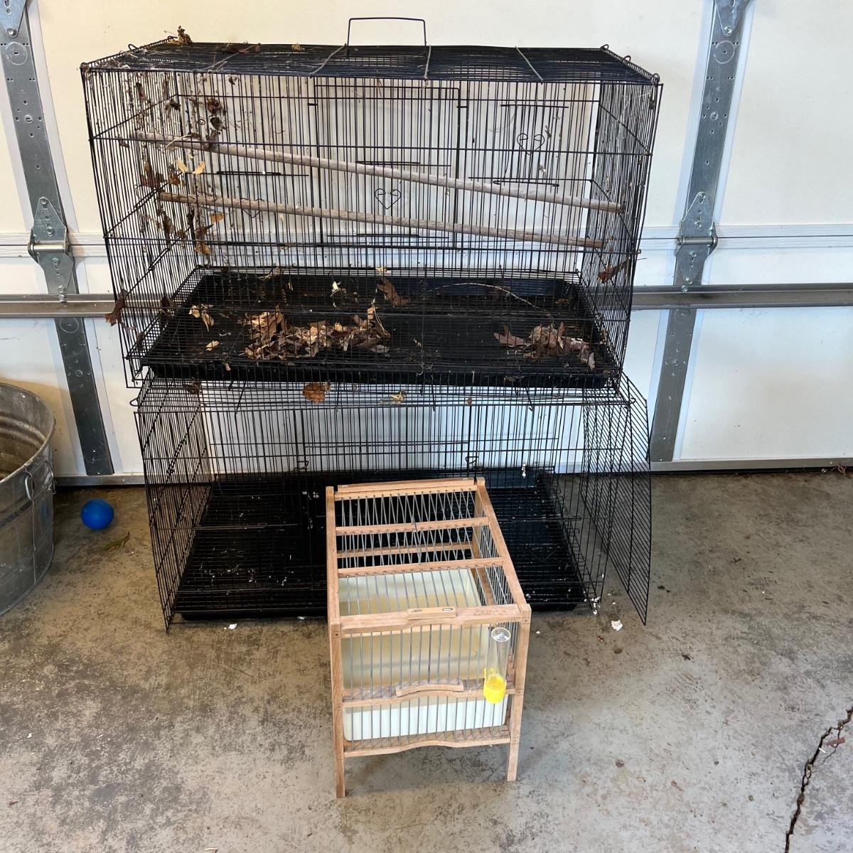 Lot includes a wooden framed bird cage that measures 10” x 13” x 12” and two collapsible metal bird cages that measure 17.5” x 29.5” x 17.5”. Two metal cages have leaves and cobwebs, and will need a good clean.