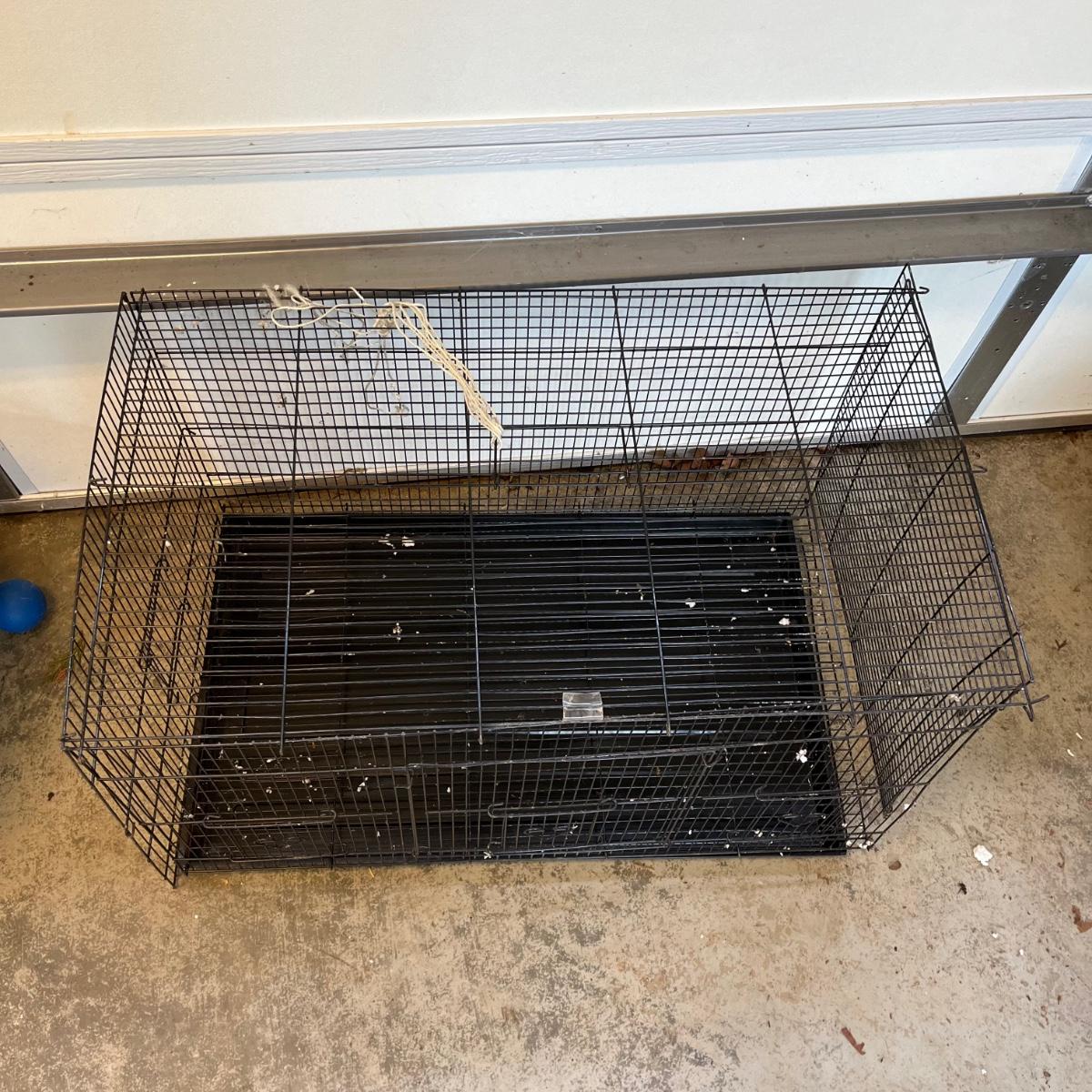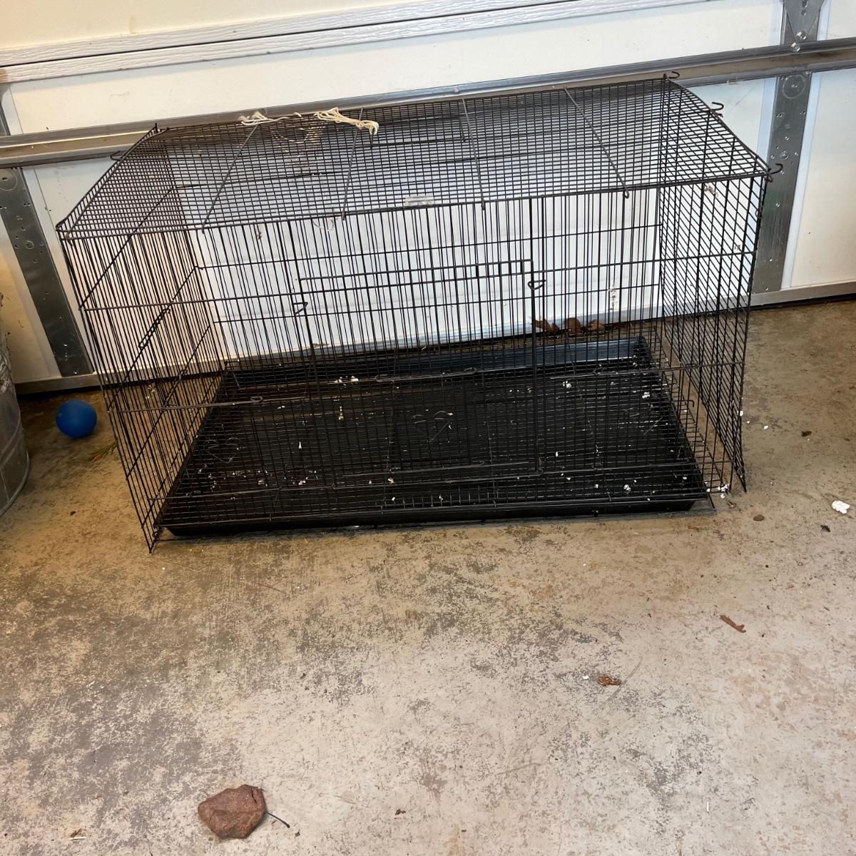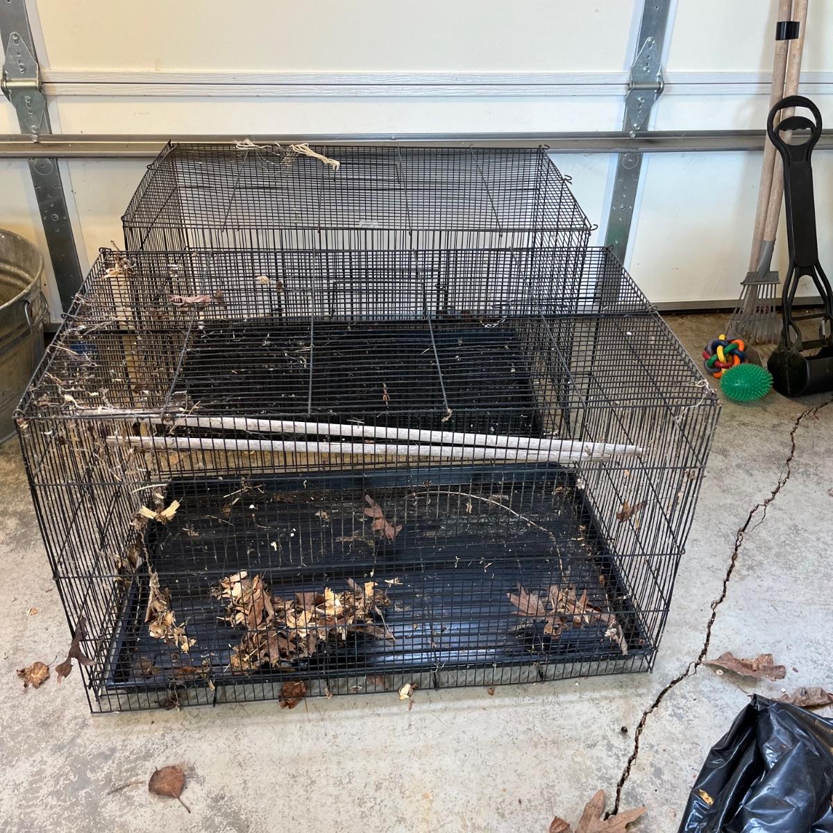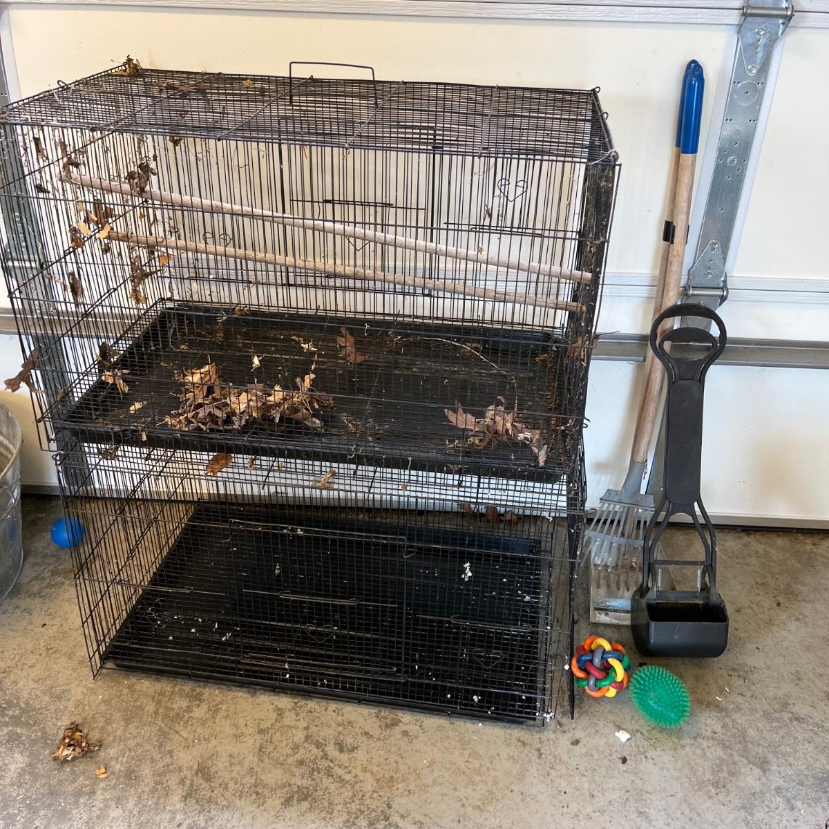 Lot includes a wooden framed bird cage that measures 10” x 13” x 12” and two collapsible metal bird cages that measure 17.5” x 29.5” x 17.5”. Two metal cages have leaves and cobwebs, and will need a good clean.
