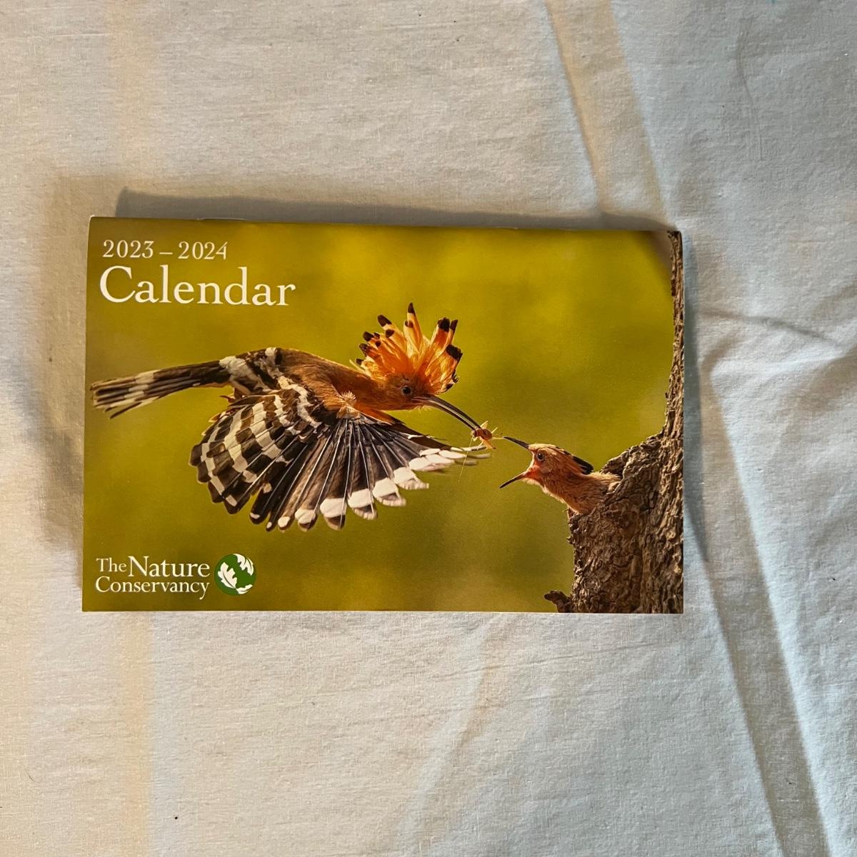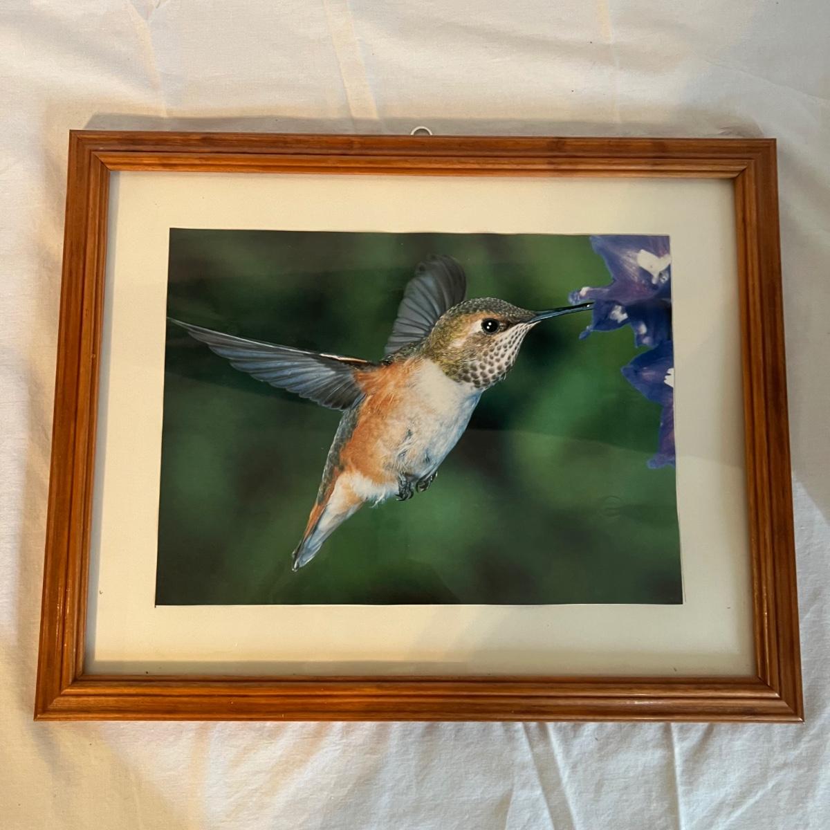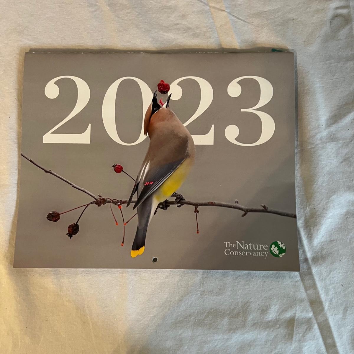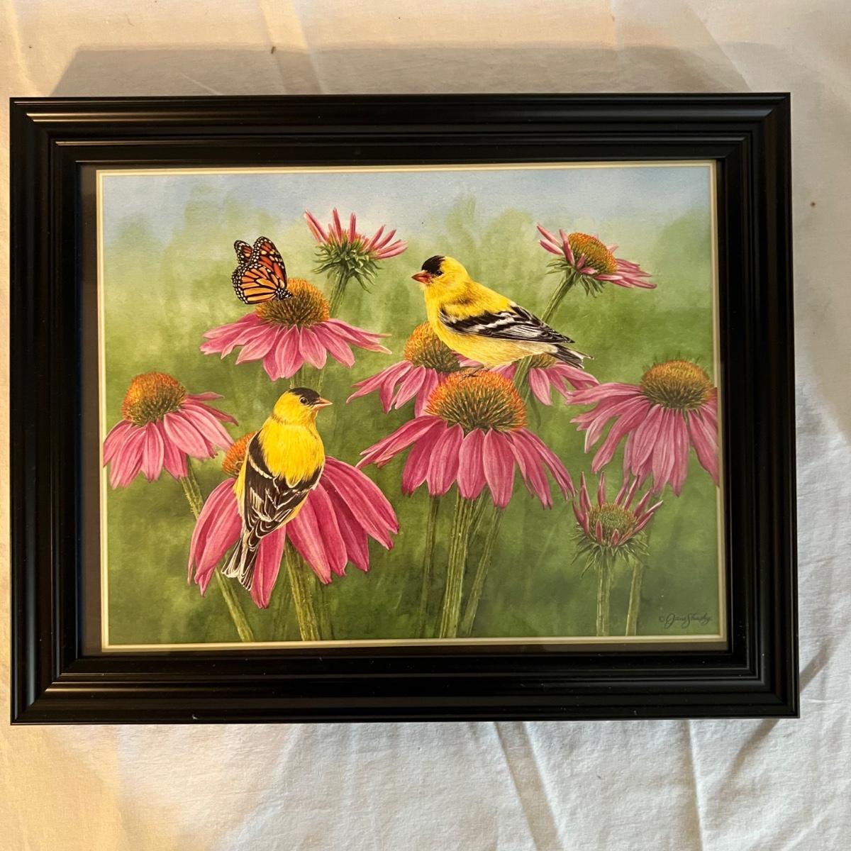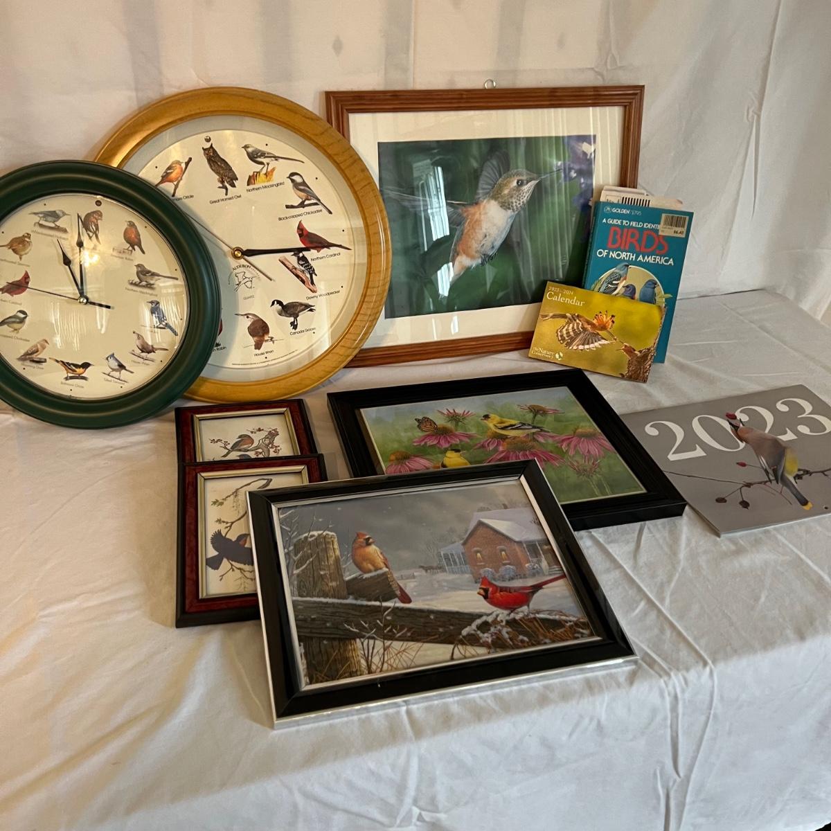 Bird themed clocks, the larger is 13”D and the smaller is 10”D. The larger one is working and the smaller one appears to have dead batteries. Two 2023 calendars with bird photos and four framed bird prints. The largest is 15” x 12”. The two smaller matching framed blue bird prints are 5.5” x 7.5”. Lastly, the Field Guide to Identities of Birds of North America book.
