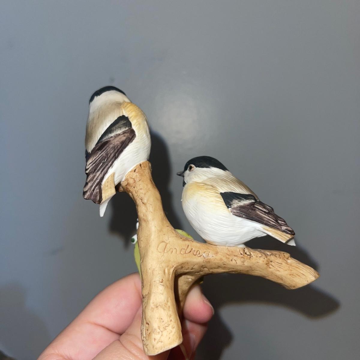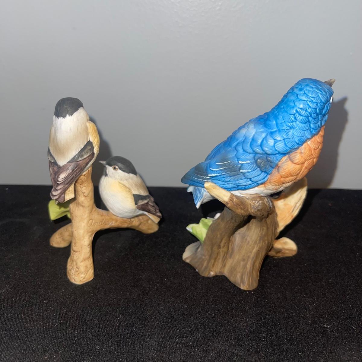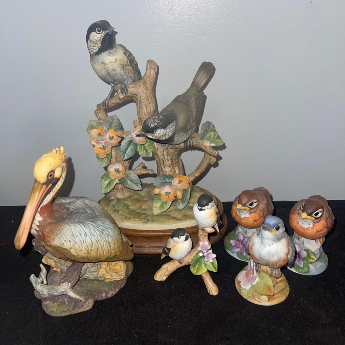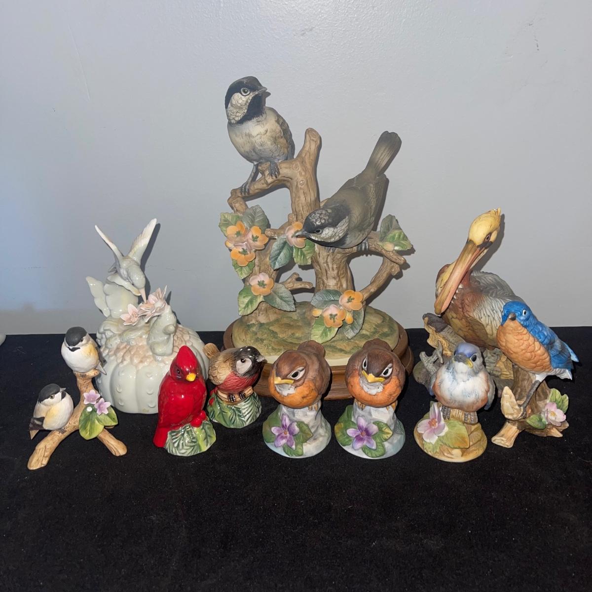 There are 10 birds in this lot! The Andrea by Sadek figurines in this collection include two robins, two bluebirds, a brown pelican, two small birds on a branch (each one’s tail has been broken), and a 10” tall figurine of two black capped chickadees with a wooden base-7 total. There is a pair of salt and pepper shakers by Fitz and Floyd. The remaining hummingbird is a musical box with the knob to turn it missing.