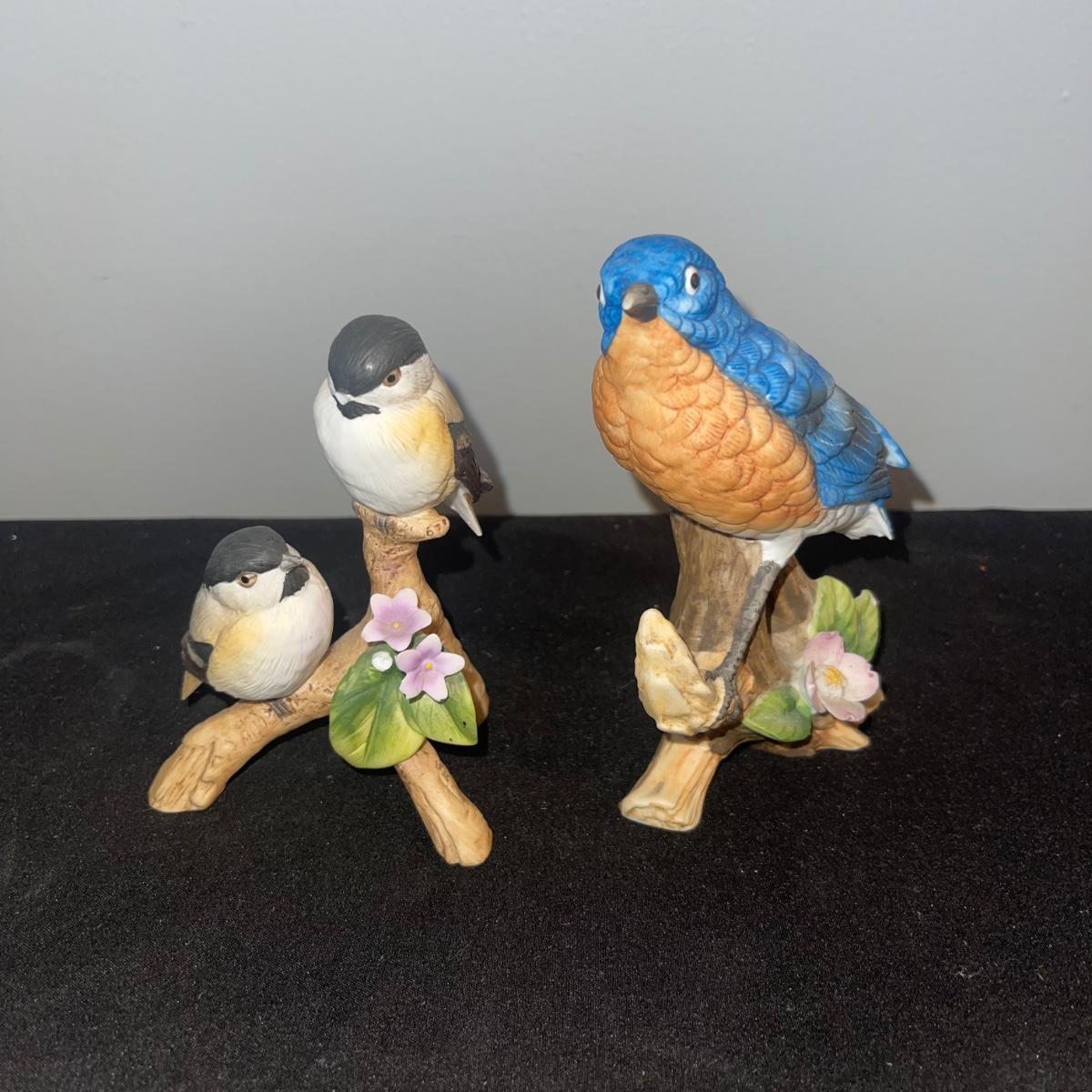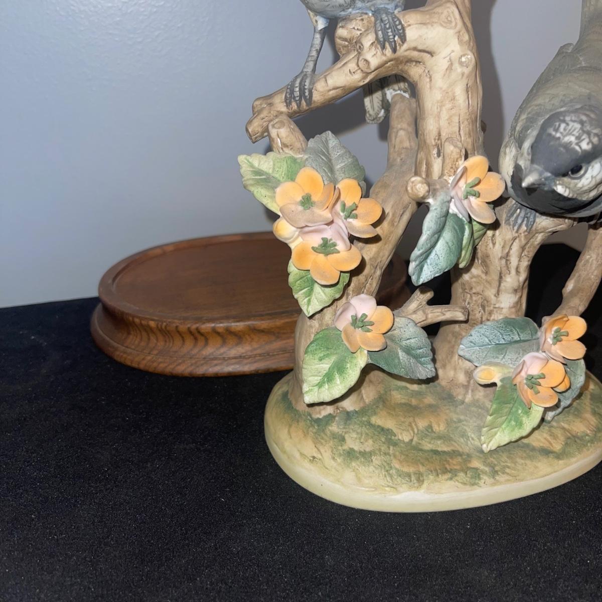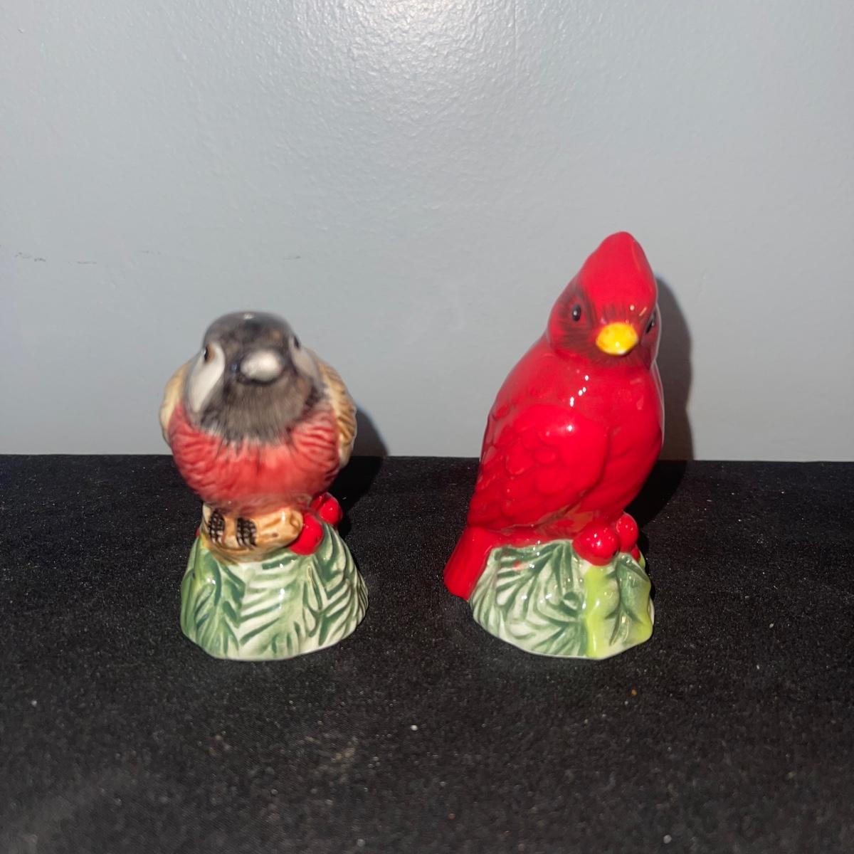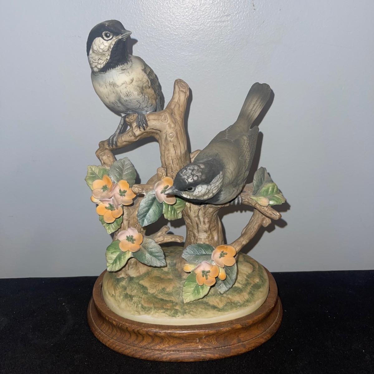 There are 10 birds in this lot! The Andrea by Sadek figurines in this collection include two robins, two bluebirds, a brown pelican, two small birds on a branch (each one’s tail has been broken), and a 10” tall figurine of two black capped chickadees with a wooden base-7 total. There is a pair of salt and pepper shakers by Fitz and Floyd. The remaining hummingbird is a musical box with the knob to turn it missing.