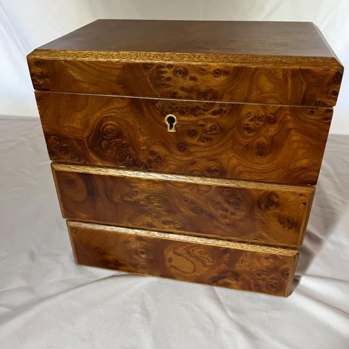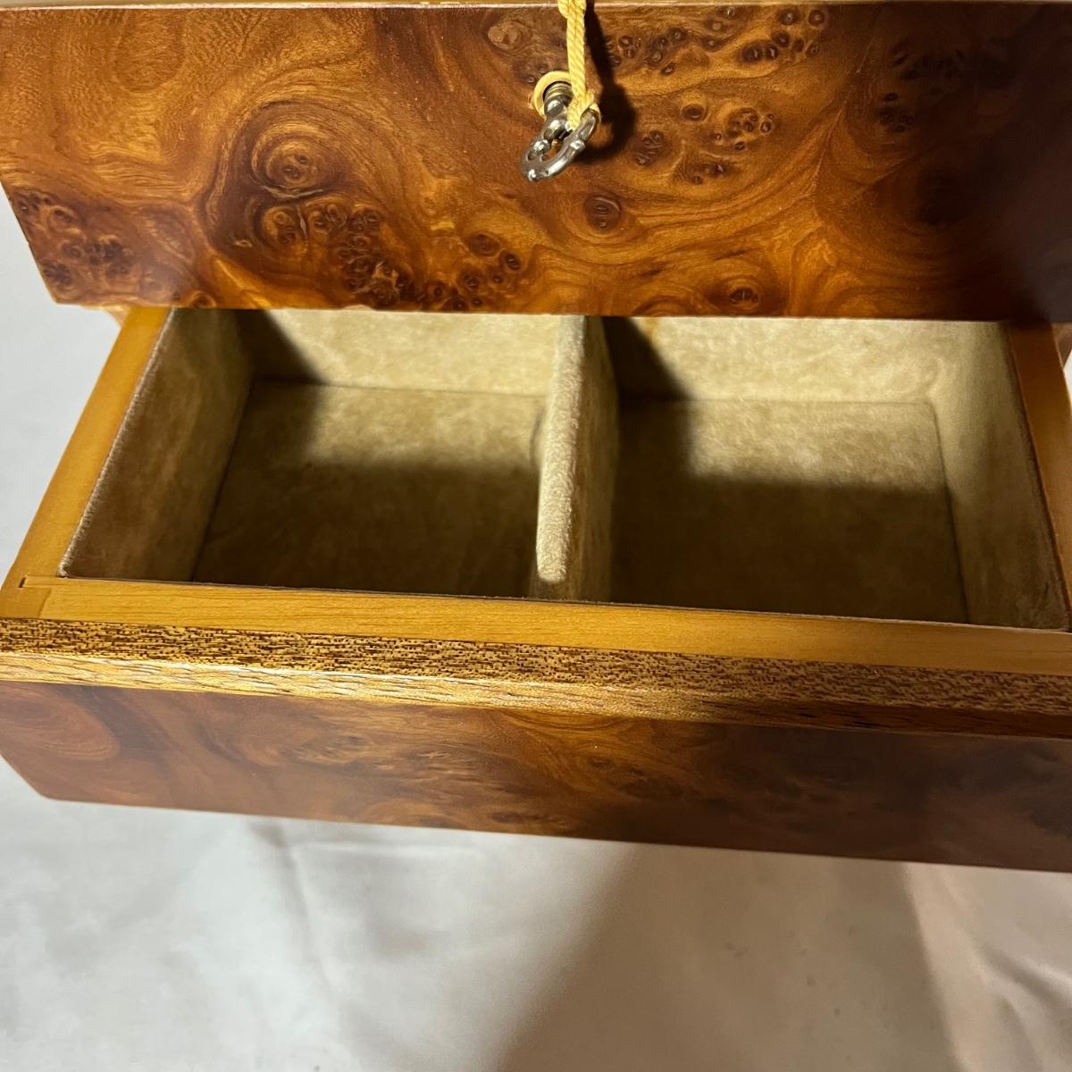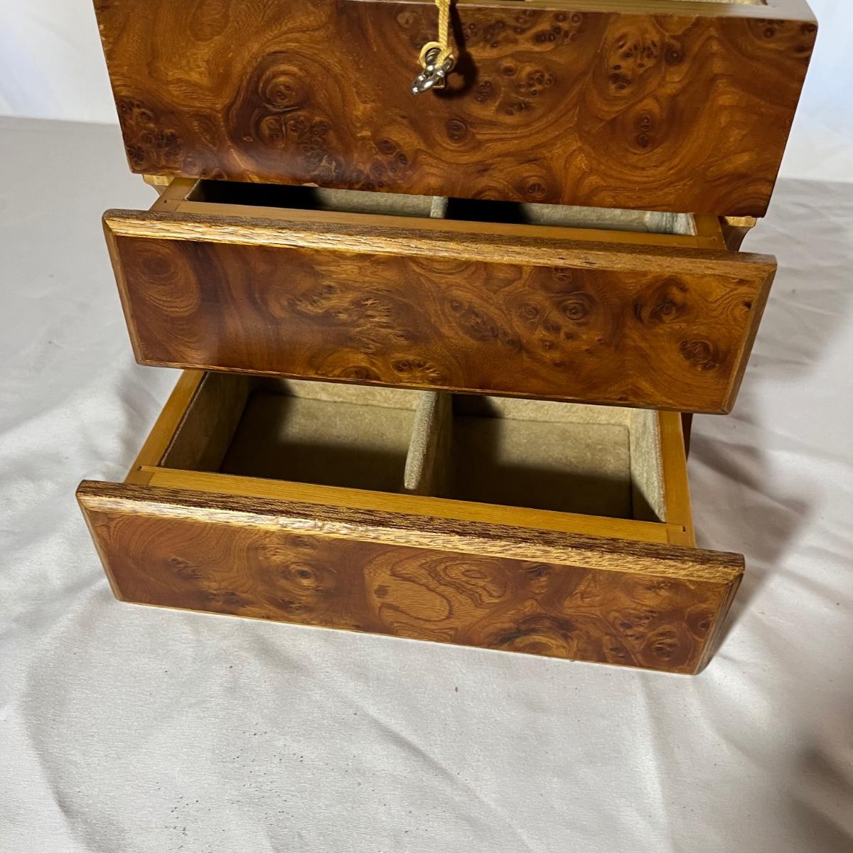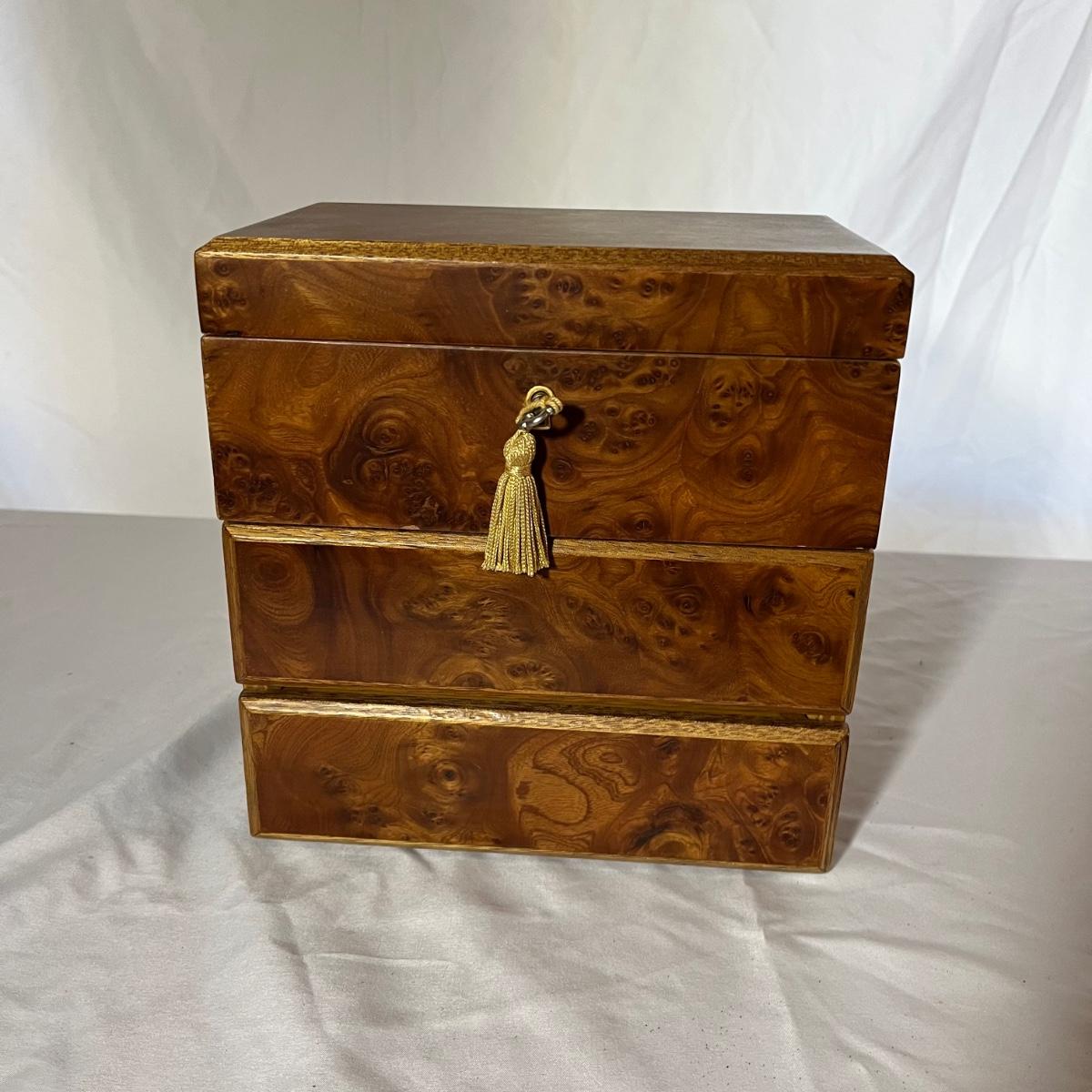 Lot includes a made in Italy jewelry box with bird’s eye maple veneer. Box has locking top and two drawers underneath. Box measures 4.75” x 7.5” x 8”. Key is included.