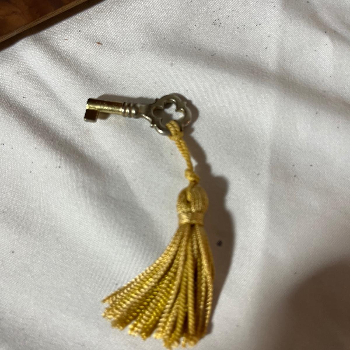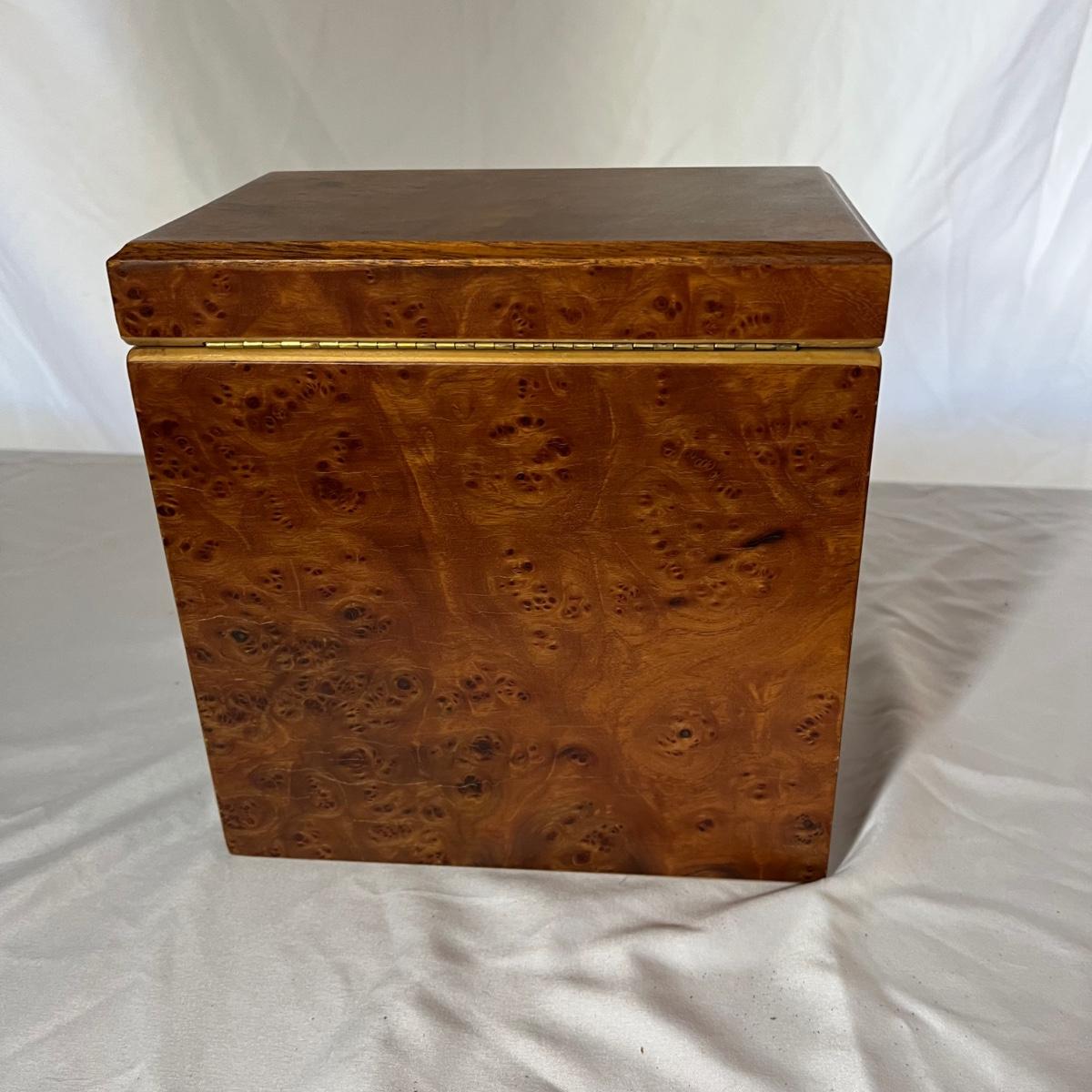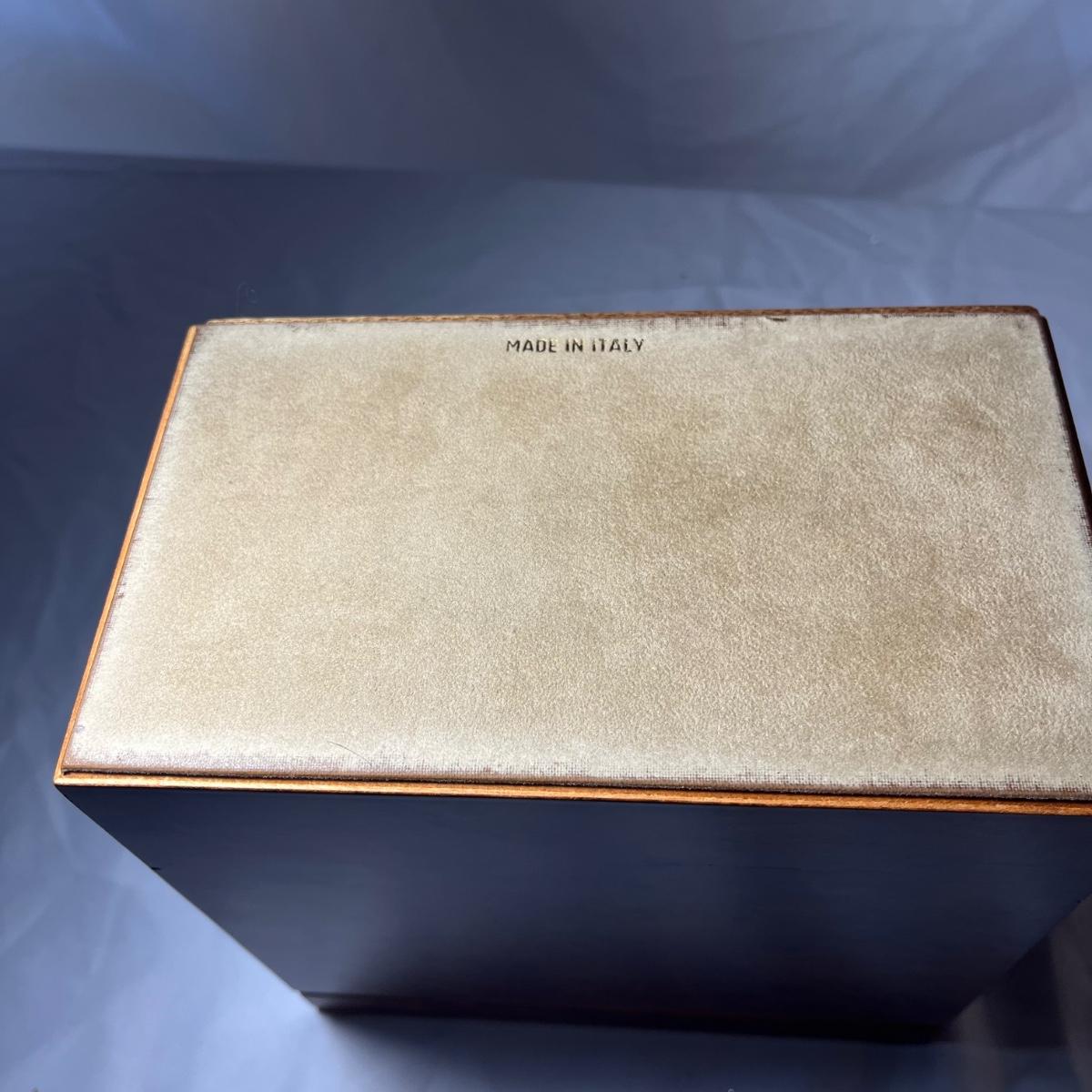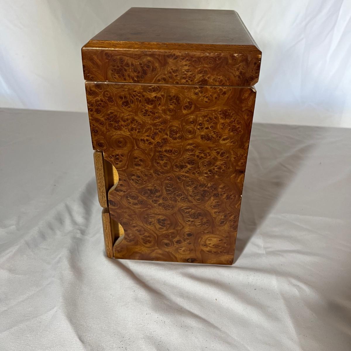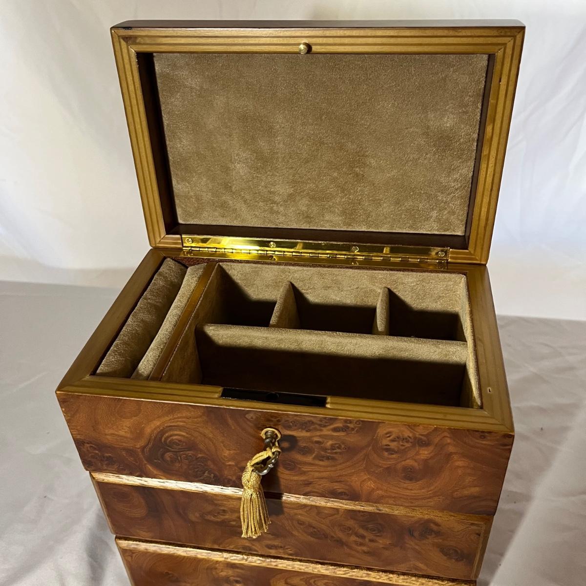 Lot includes a made in Italy jewelry box with bird’s eye maple veneer. Box has locking top and two drawers underneath. Box measures 4.75” x 7.5” x 8”. Key is included.