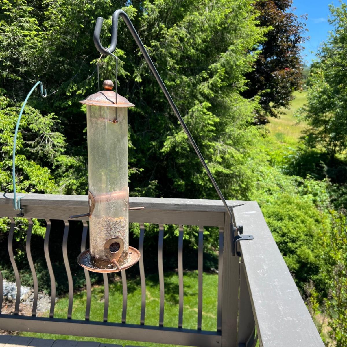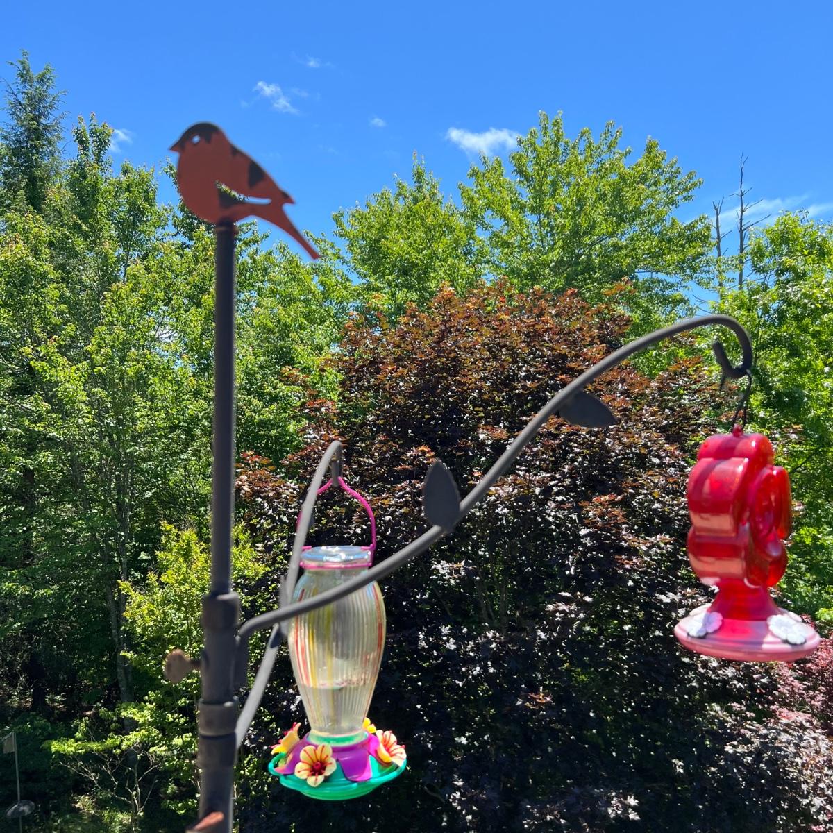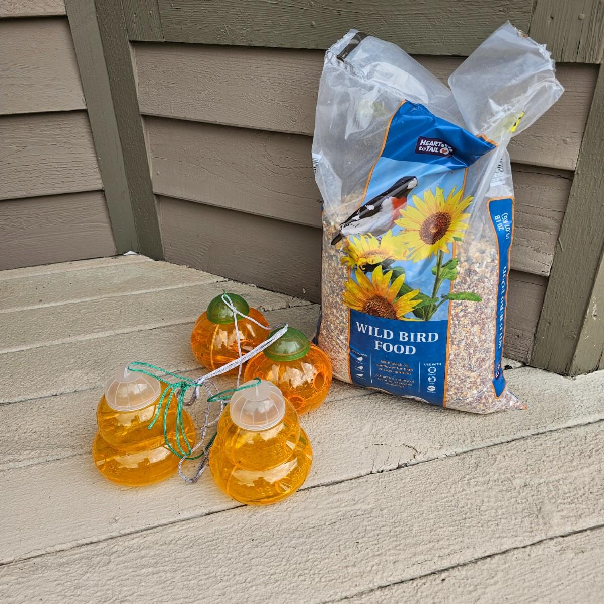 This lot includes a shepherds hook, three deck hanging poles and an assortment of bird (including hummingbird) feeders. Also includes a 20lb bag of food. Note by end of aunction all seed and fluid will probably have been consumed!.