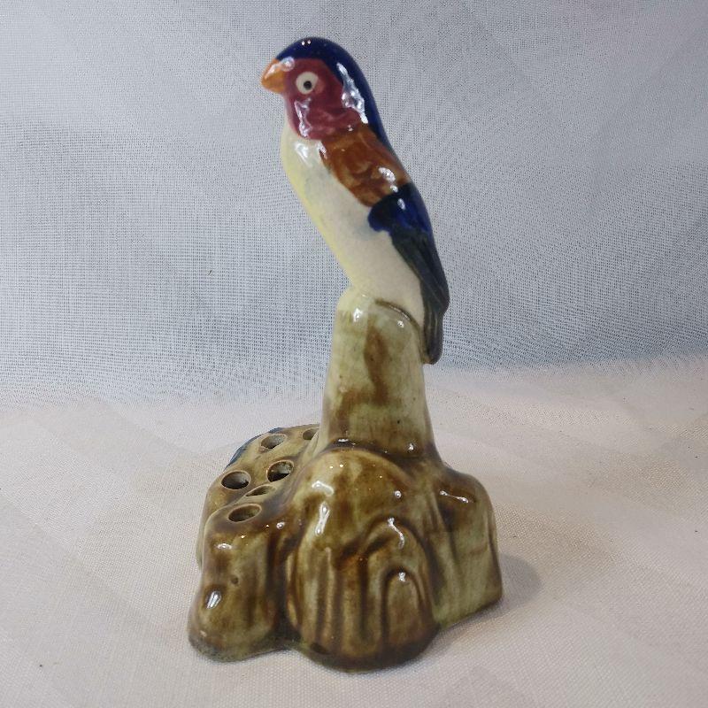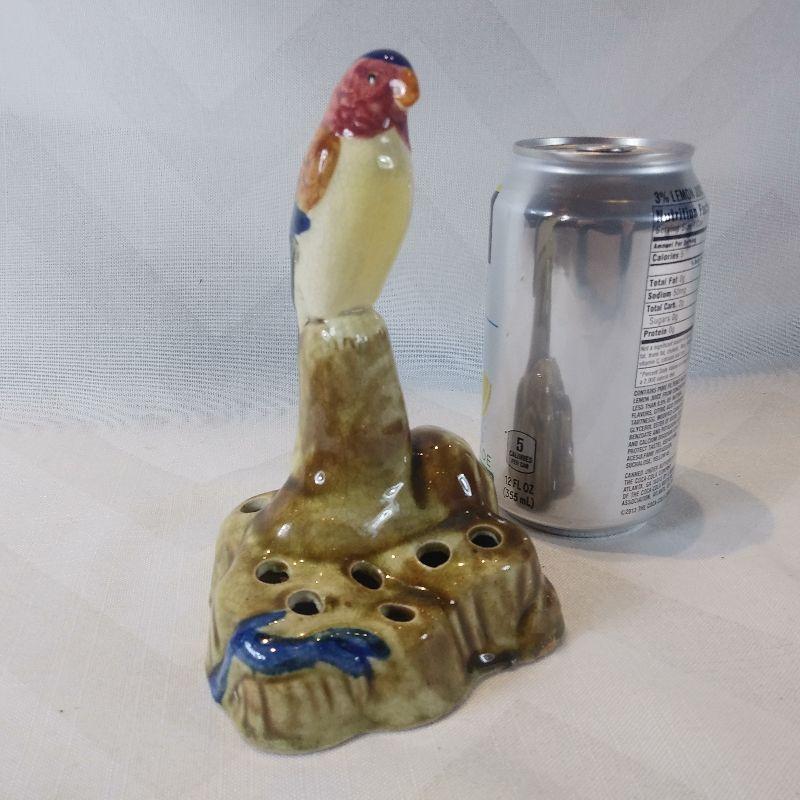 This auction lot is for a very unique flower frog. It is glazed ceramic and has a mark on the bottom that looks like it says Japan. It measures 6-inches tall and in very good condition. Too big for a pie bird but could be used in an aquarium. Nifty item.