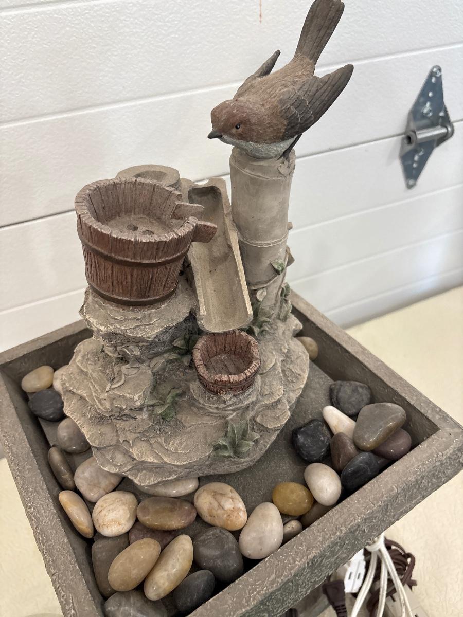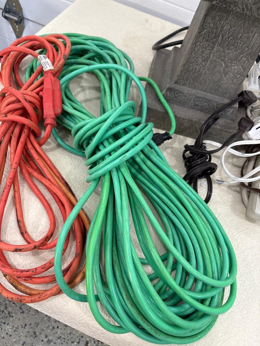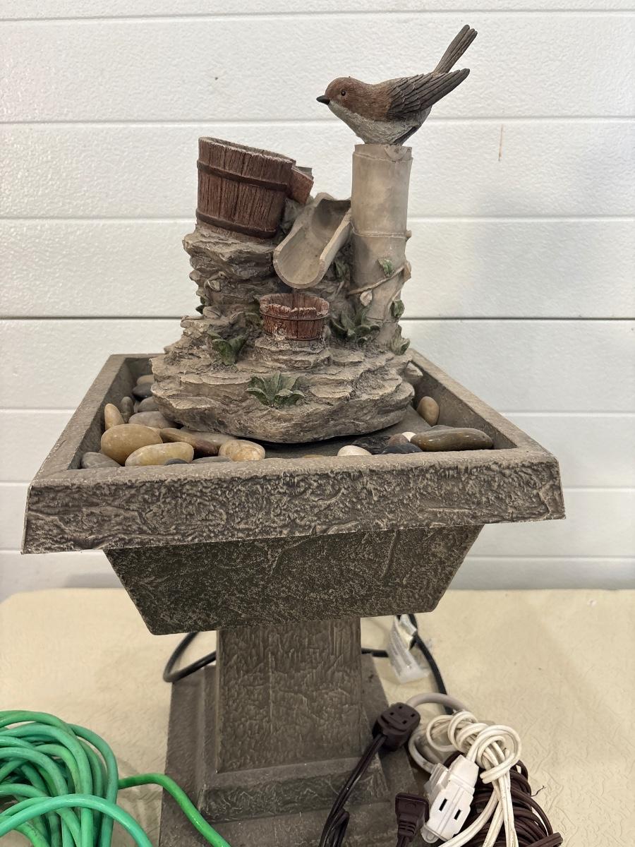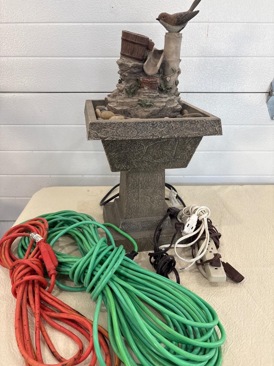 Bird decor fountain 25” x 12”. And assortment of extension cords.