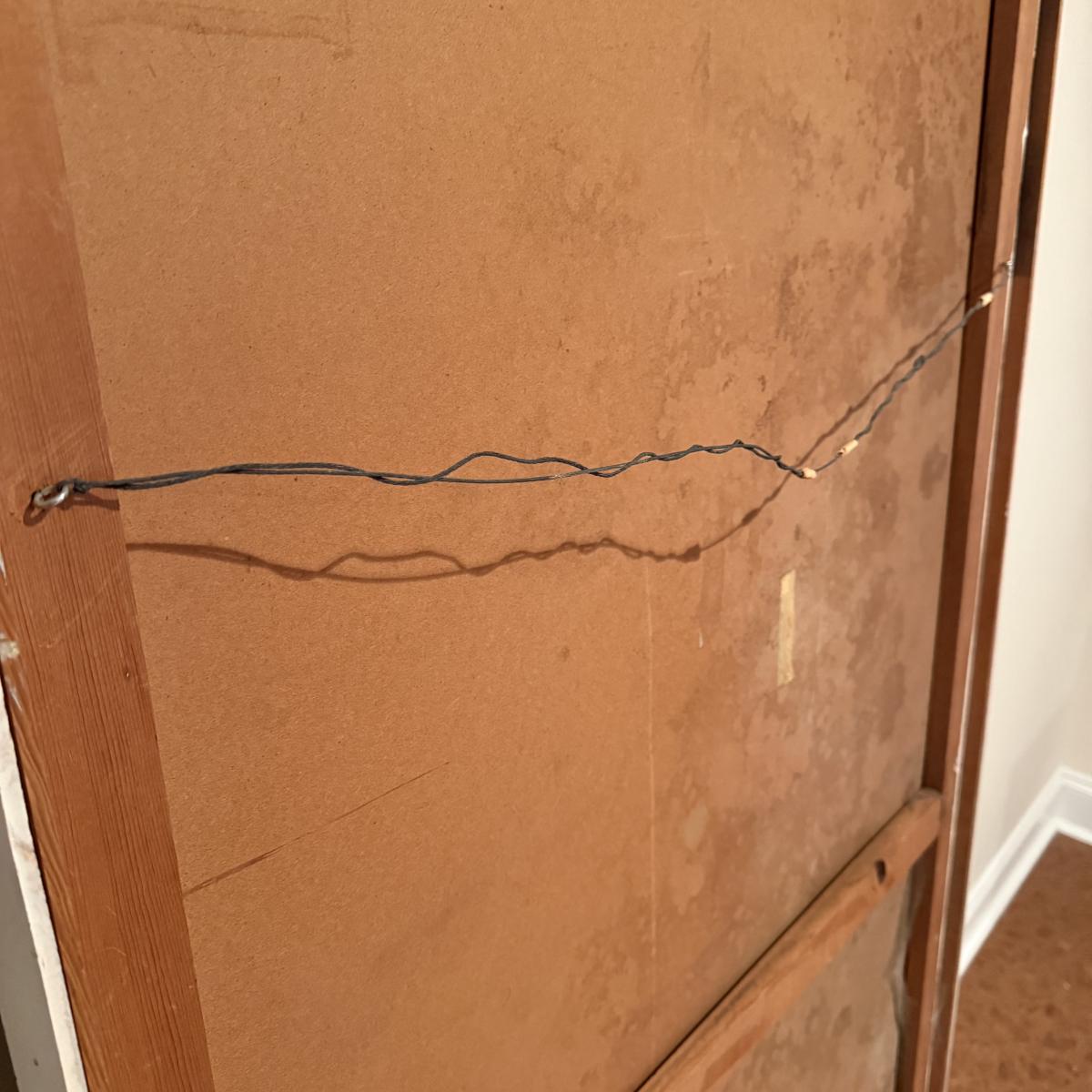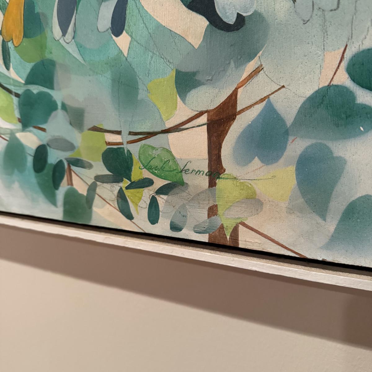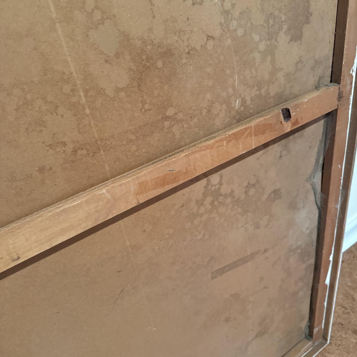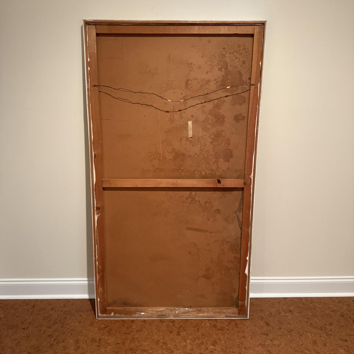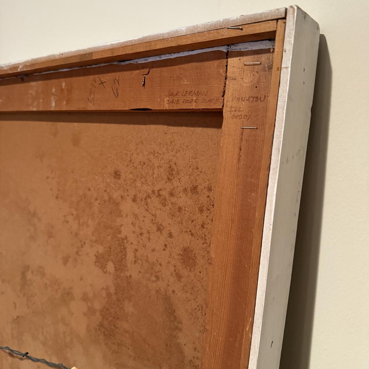 Large abstract painting that appears to be original art by Illinois artist Jack Lerman called Bird Hierarchy. This stunning piece appears to be on manufactured wood and is framed by a simple white wooden frame. This piece measures 34.5” x 63” and comes out 1.5” from the wall. There is a signature on the bottom right that reads ‘Jack Lerman’. This piece does have hardware on the back to be hung. There is what appears to be some mold on the back, see pictures for details. Shipping available. Shipping certain items can be costly. We suggest contacting our preferred local shipping provider, Postage Express, with dimensions and getting an estimate before bidding: (828) 255-9250 or shipping@postageexpressnc.com