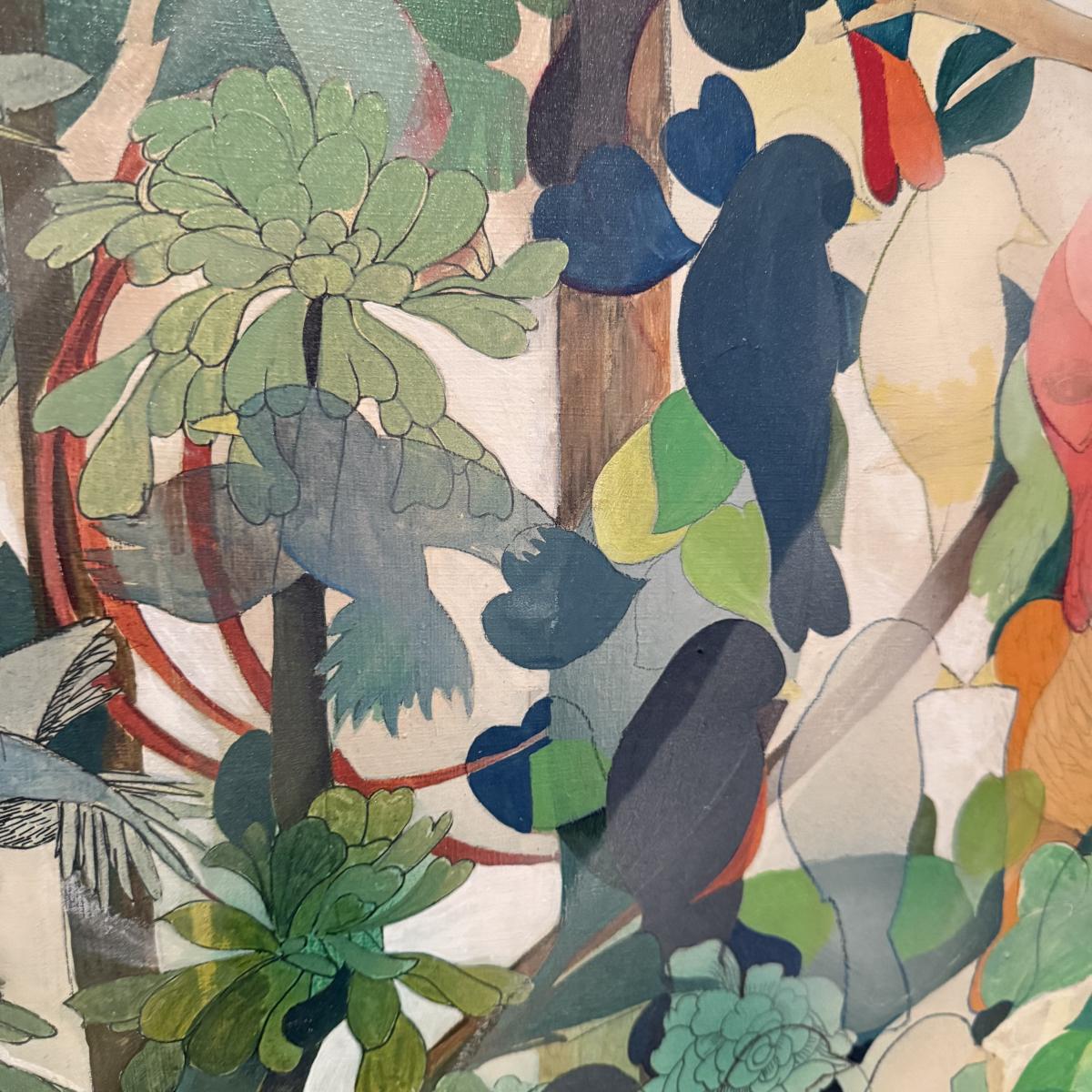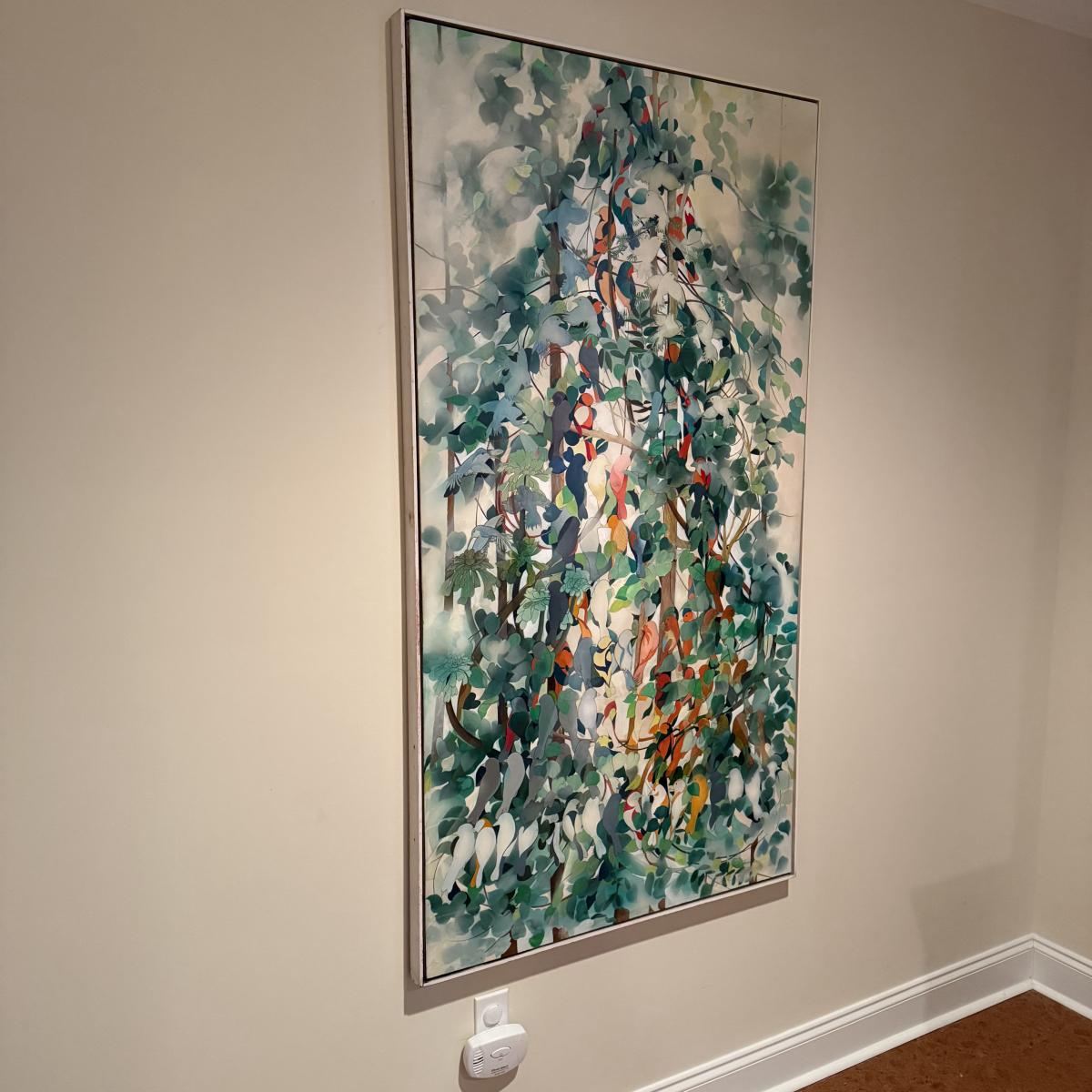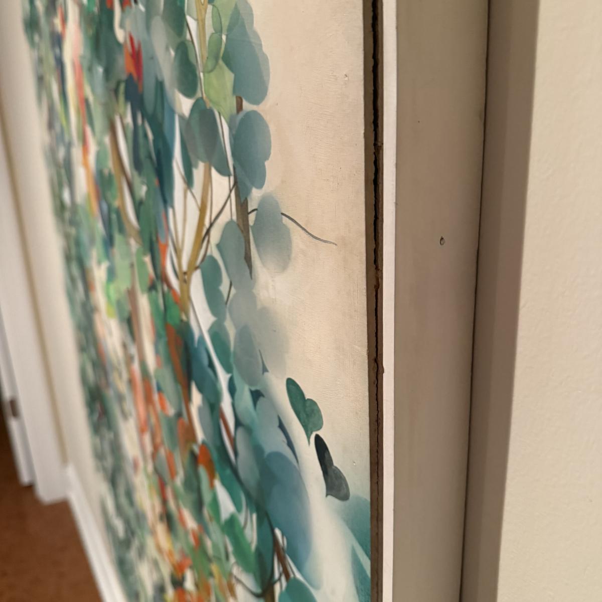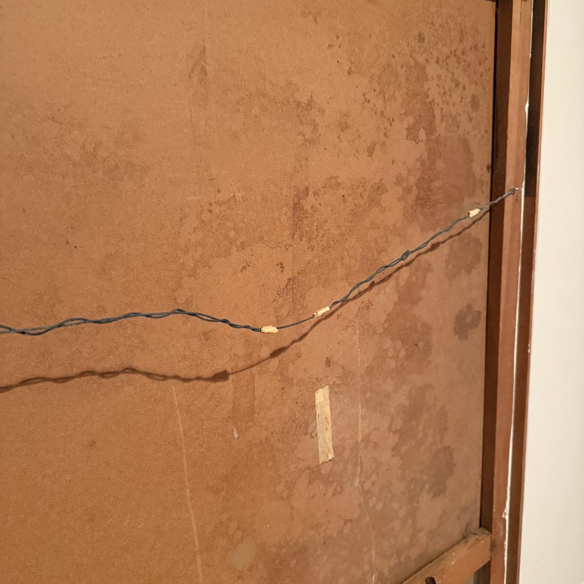 Large abstract painting that appears to be original art by Illinois artist Jack Lerman called Bird Hierarchy. This stunning piece appears to be on manufactured wood and is framed by a simple white wooden frame. This piece measures 34.5” x 63” and comes out 1.5” from the wall. There is a signature on the bottom right that reads ‘Jack Lerman’. This piece does have hardware on the back to be hung. There is what appears to be some mold on the back, see pictures for details. Shipping available. Shipping certain items can be costly. We suggest contacting our preferred local shipping provider, Postage Express, with dimensions and getting an estimate before bidding: (828) 255-9250 or shipping@postageexpressnc.com