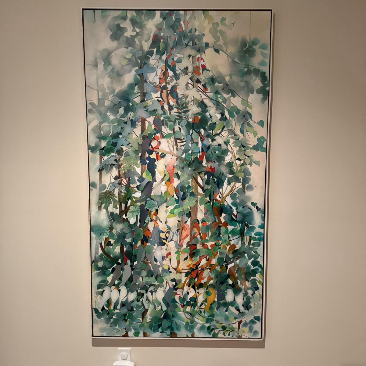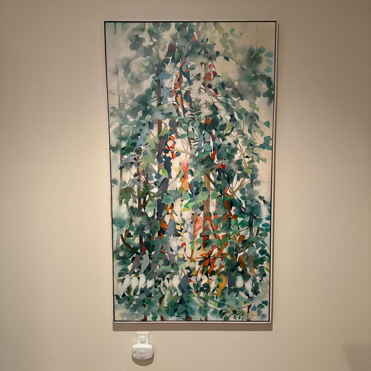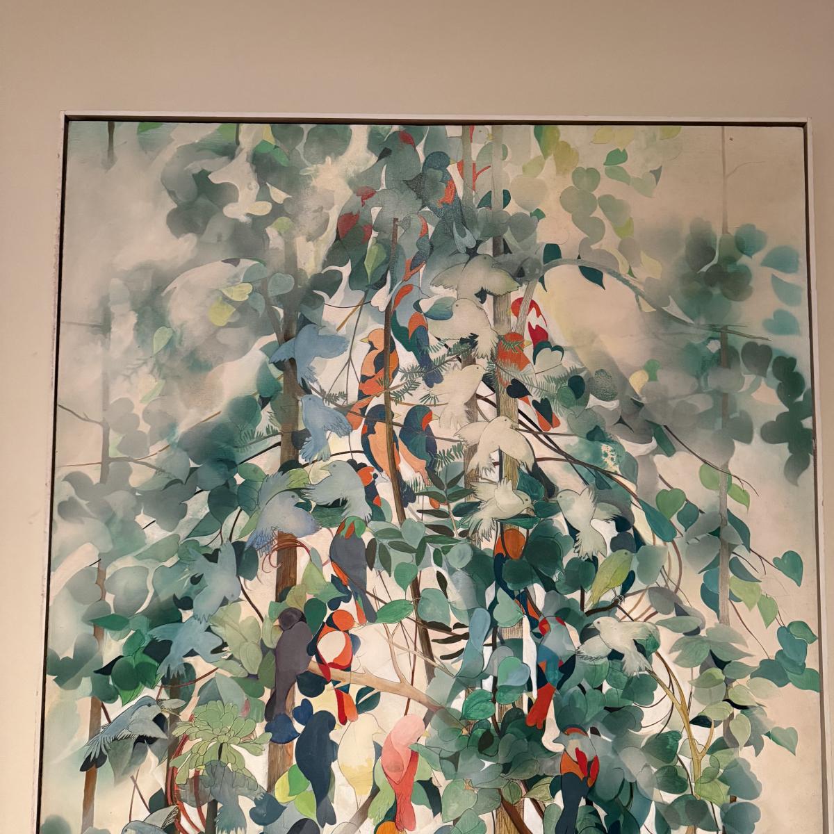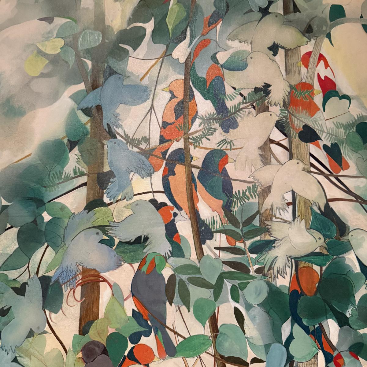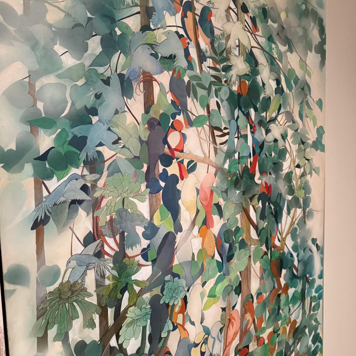 Large abstract painting that appears to be original art by Illinois artist Jack Lerman called Bird Hierarchy. This stunning piece appears to be on manufactured wood and is framed by a simple white wooden frame. This piece measures 34.5” x 63” and comes out 1.5” from the wall. There is a signature on the bottom right that reads ‘Jack Lerman’. This piece does have hardware on the back to be hung. There is what appears to be some mold on the back, see pictures for details. Shipping available. Shipping certain items can be costly. We suggest contacting our preferred local shipping provider, Postage Express, with dimensions and getting an estimate before bidding: (828) 255-9250 or shipping@postageexpressnc.com