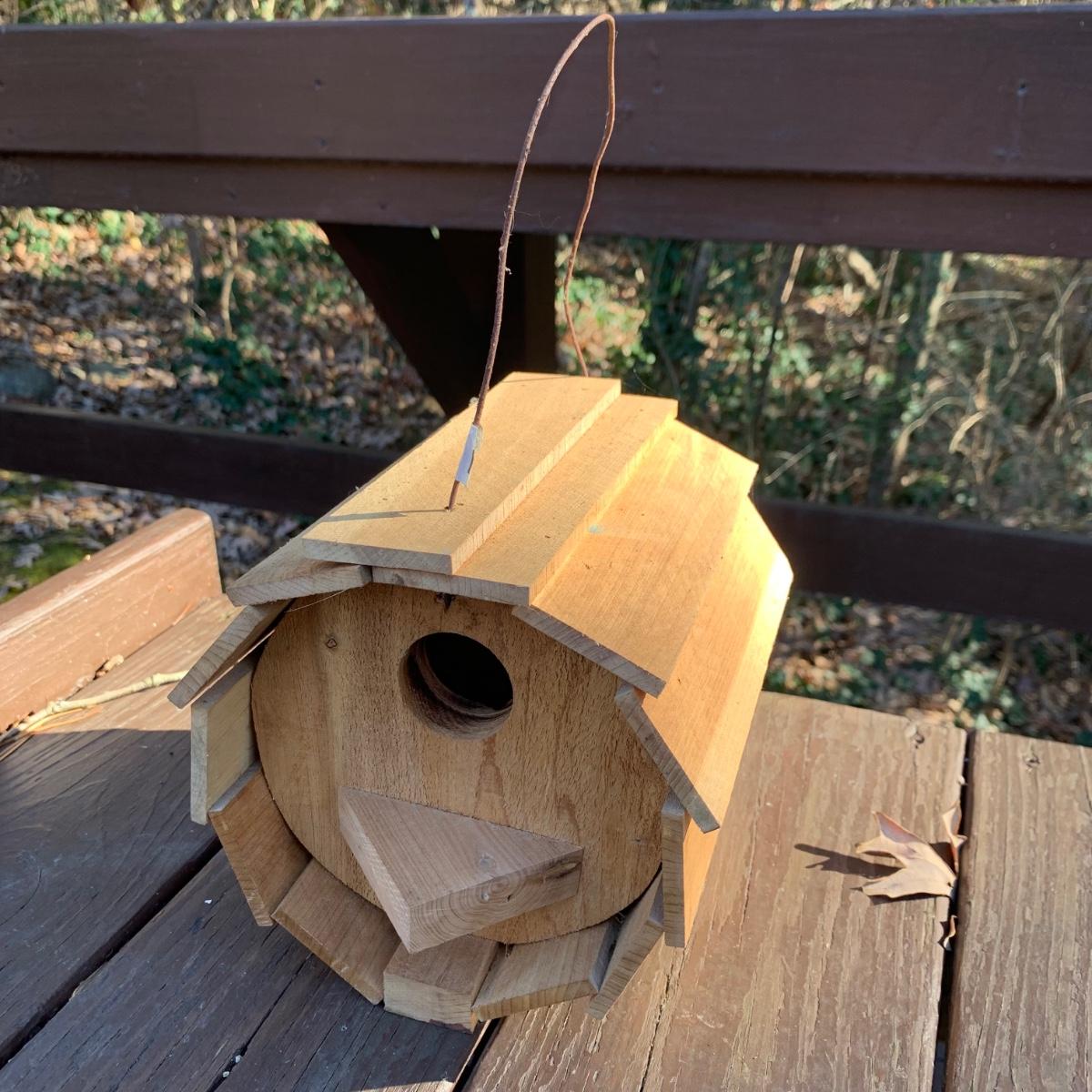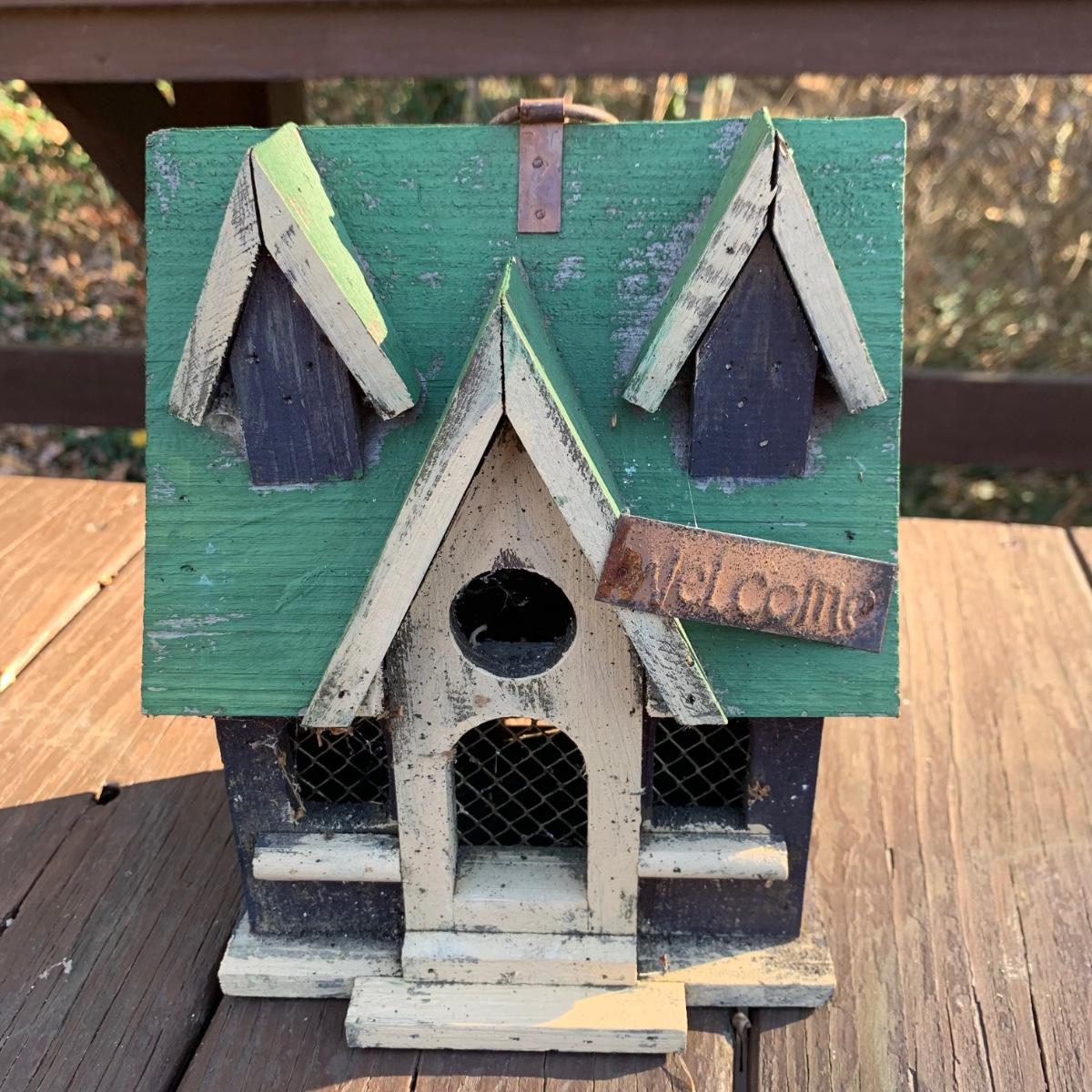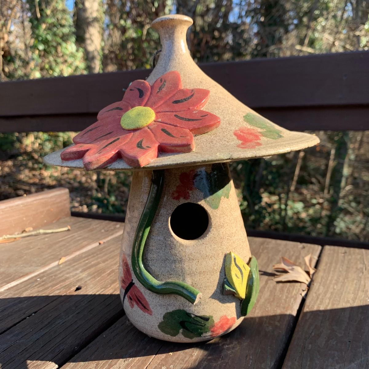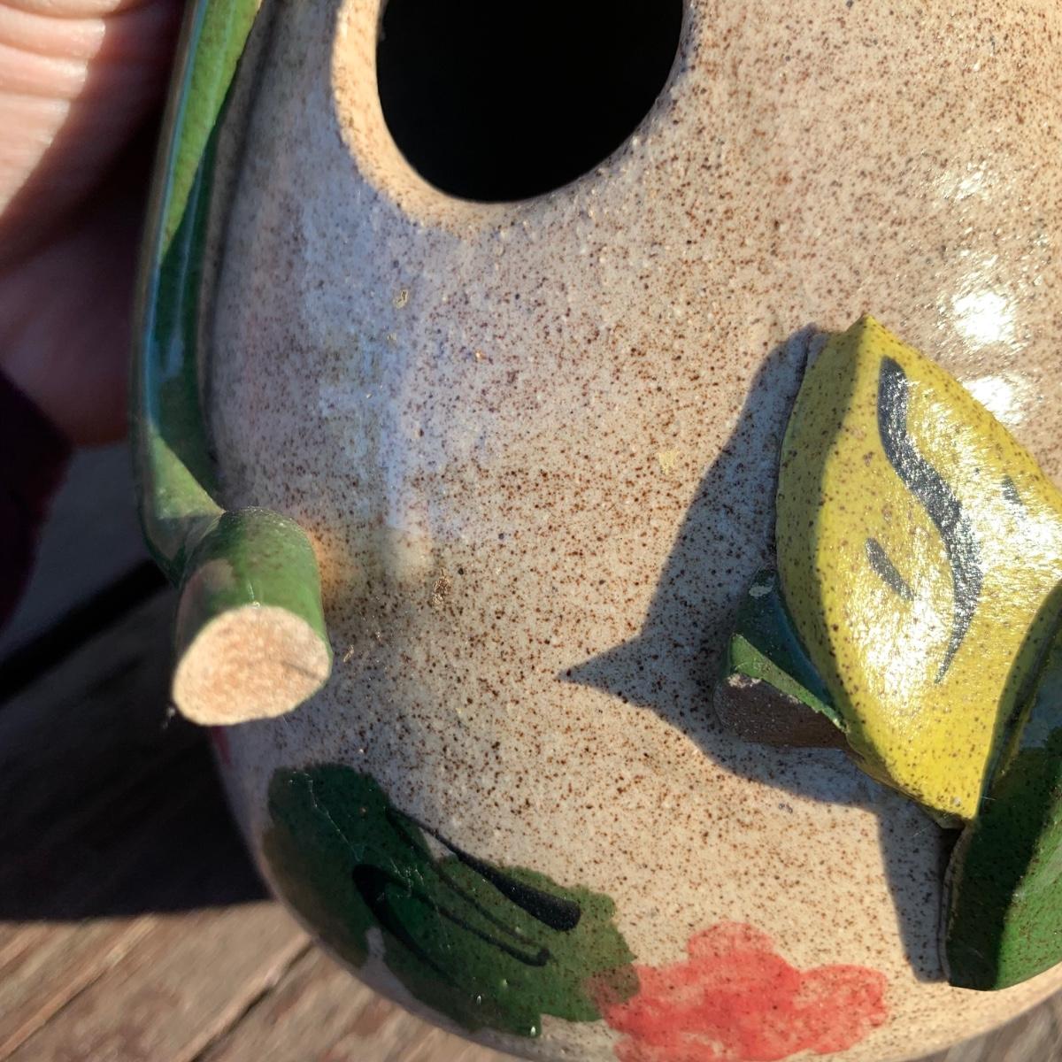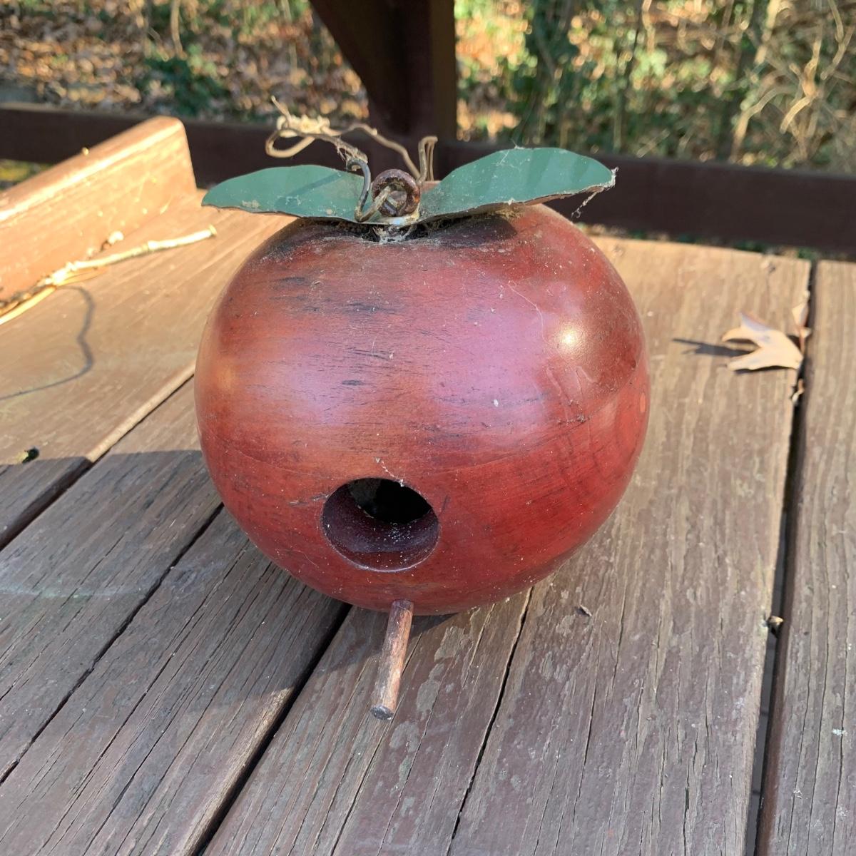 A collection of five decorative and functional bird houses. Two are ceramic and three are wood. The ceramic houses are signed. The wooden apple has metal leaves. The cylindrical ceramic house with the bird on top has a crack that appears to have been previously repaired. This one measures approximately 4.5”D x 10”H to the top of the bird. There are a couple small chips in the top of other ceramic bird house and it appears that a piece is broken off of the front. These bird houses have all been used; they are dusty and some have remnants of previous bird and wasp nests.
