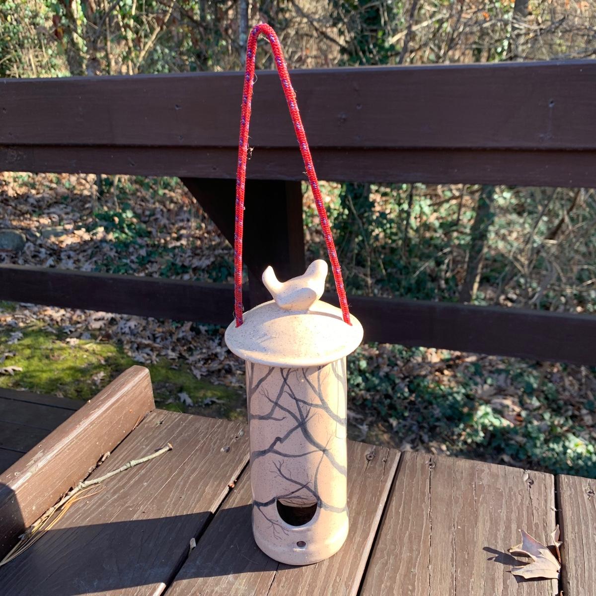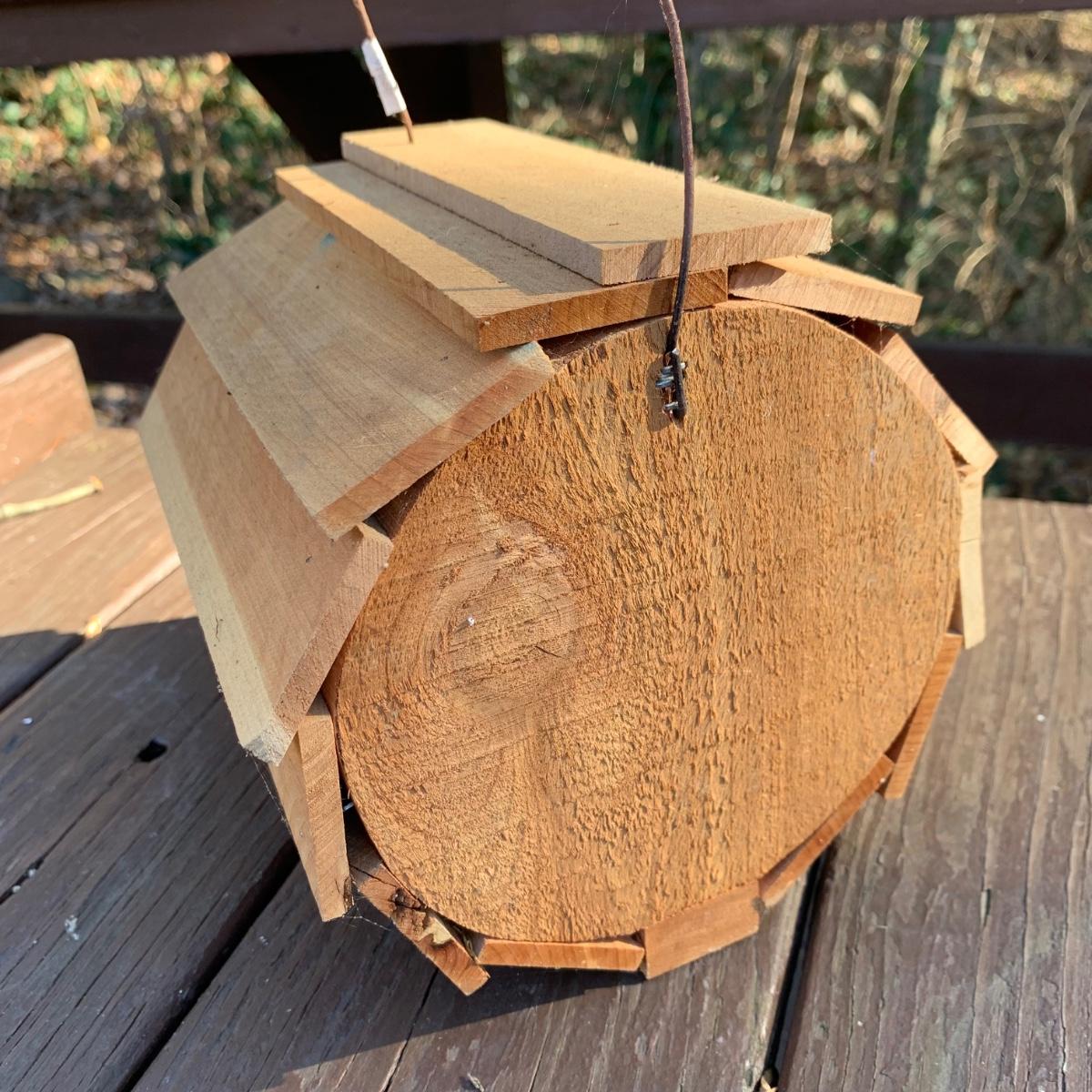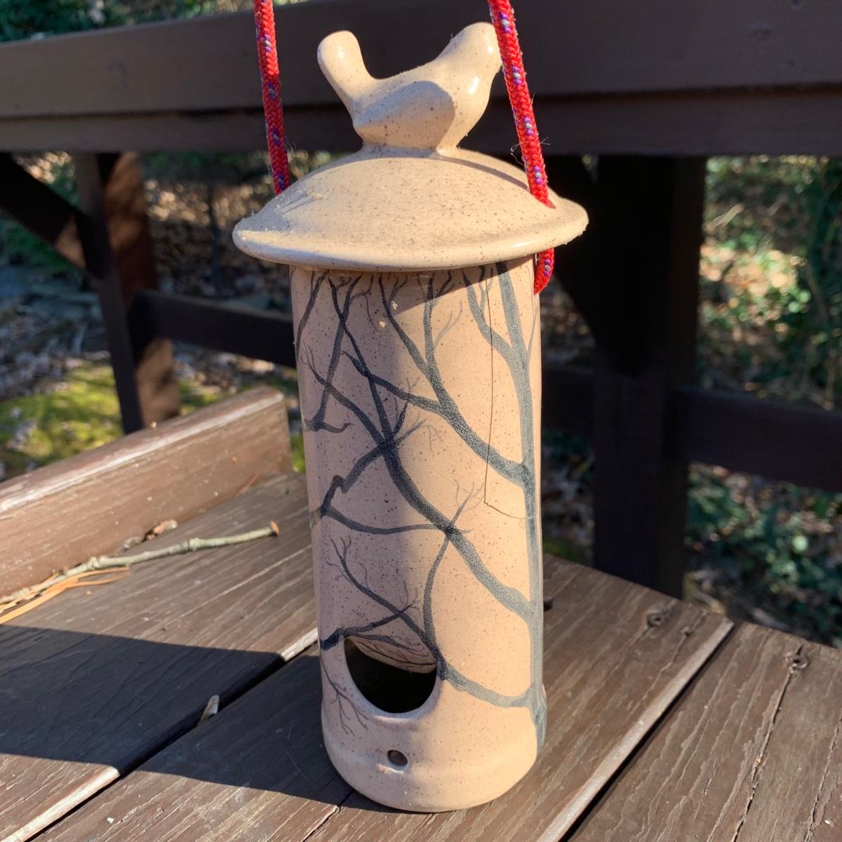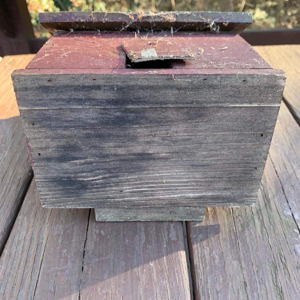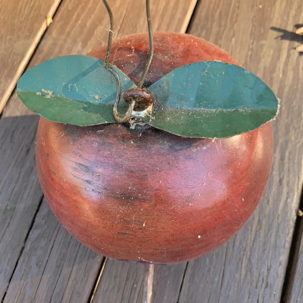 A collection of five decorative and functional bird houses. Two are ceramic and three are wood. The ceramic houses are signed. The wooden apple has metal leaves. The cylindrical ceramic house with the bird on top has a crack that appears to have been previously repaired. This one measures approximately 4.5”D x 10”H to the top of the bird. There are a couple small chips in the top of other ceramic bird house and it appears that a piece is broken off of the front. These bird houses have all been used; they are dusty and some have remnants of previous bird and wasp nests.