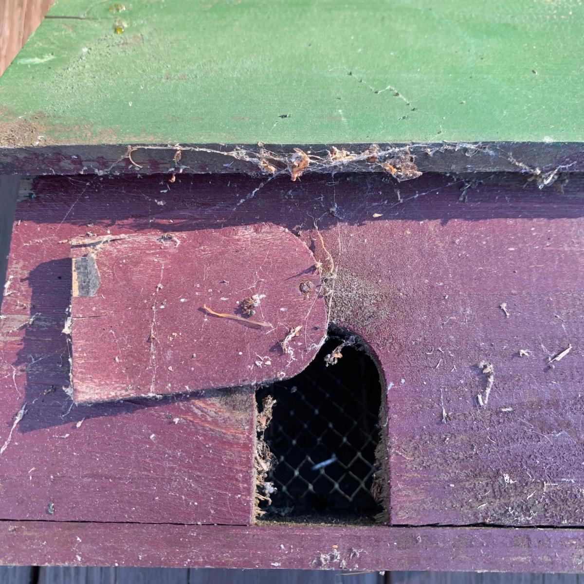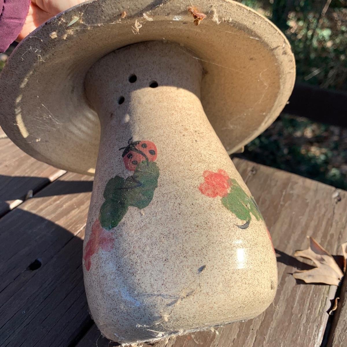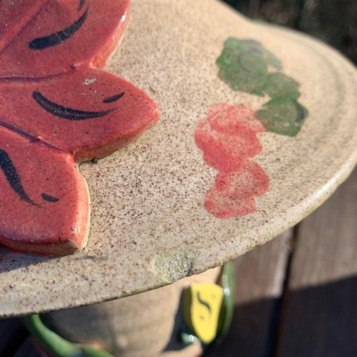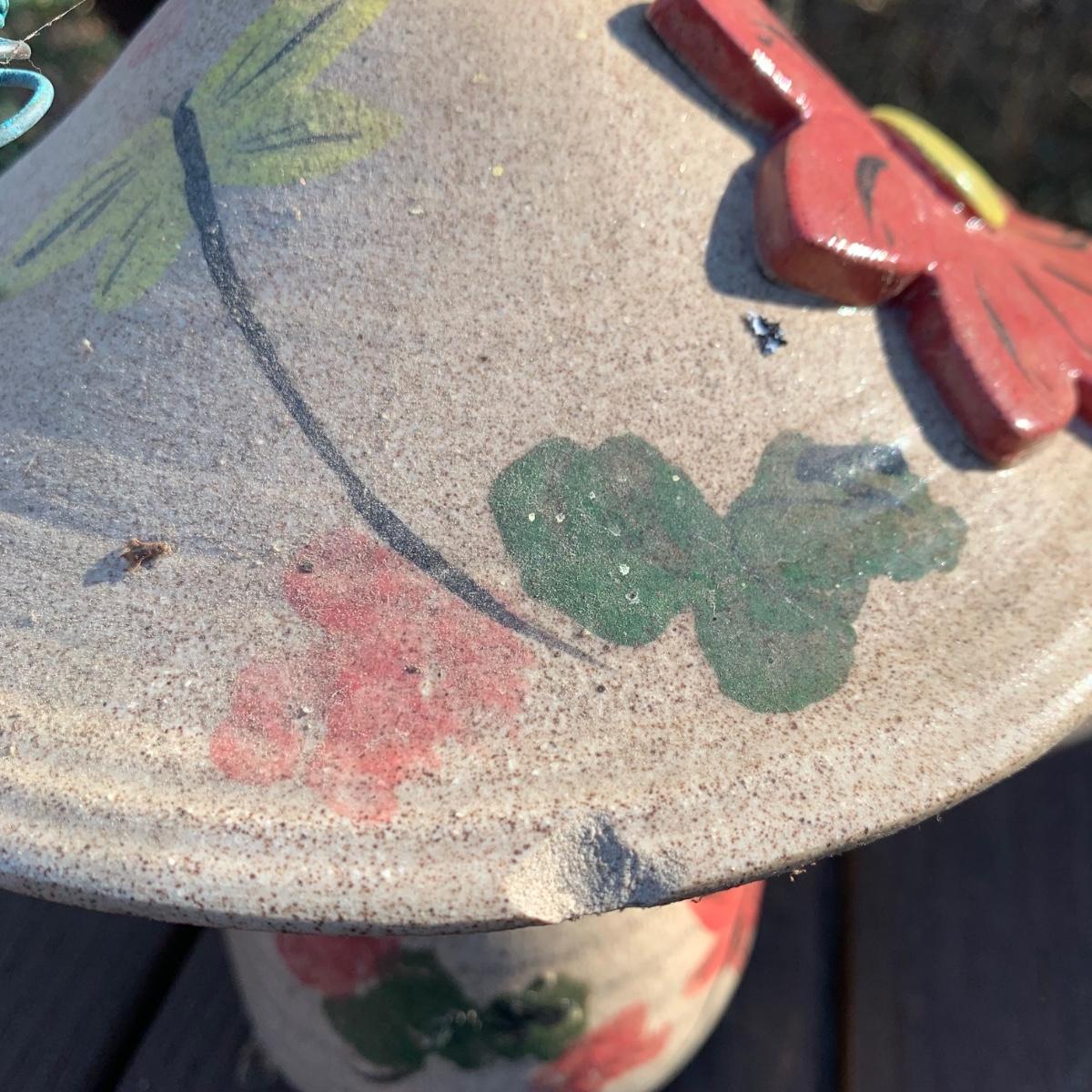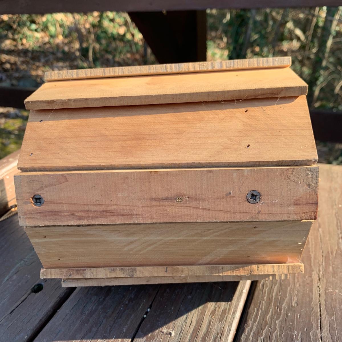 A collection of five decorative and functional bird houses. Two are ceramic and three are wood. The ceramic houses are signed. The wooden apple has metal leaves. The cylindrical ceramic house with the bird on top has a crack that appears to have been previously repaired. This one measures approximately 4.5”D x 10”H to the top of the bird. There are a couple small chips in the top of other ceramic bird house and it appears that a piece is broken off of the front. These bird houses have all been used; they are dusty and some have remnants of previous bird and wasp nests.