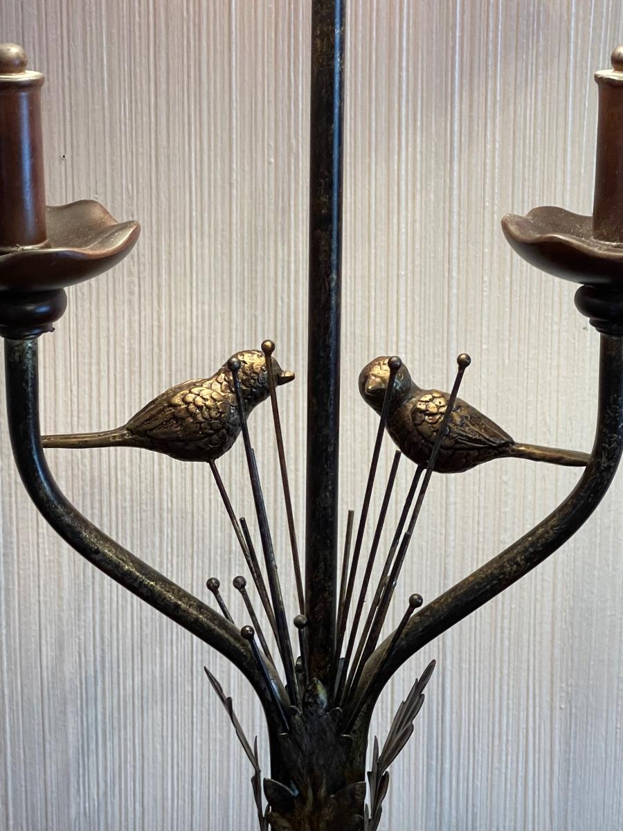 Base is resin and the Birds are Metal ~ 30" High with a 14" x 10" Shade