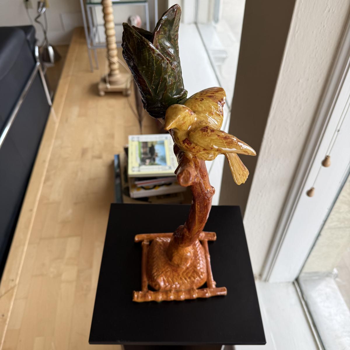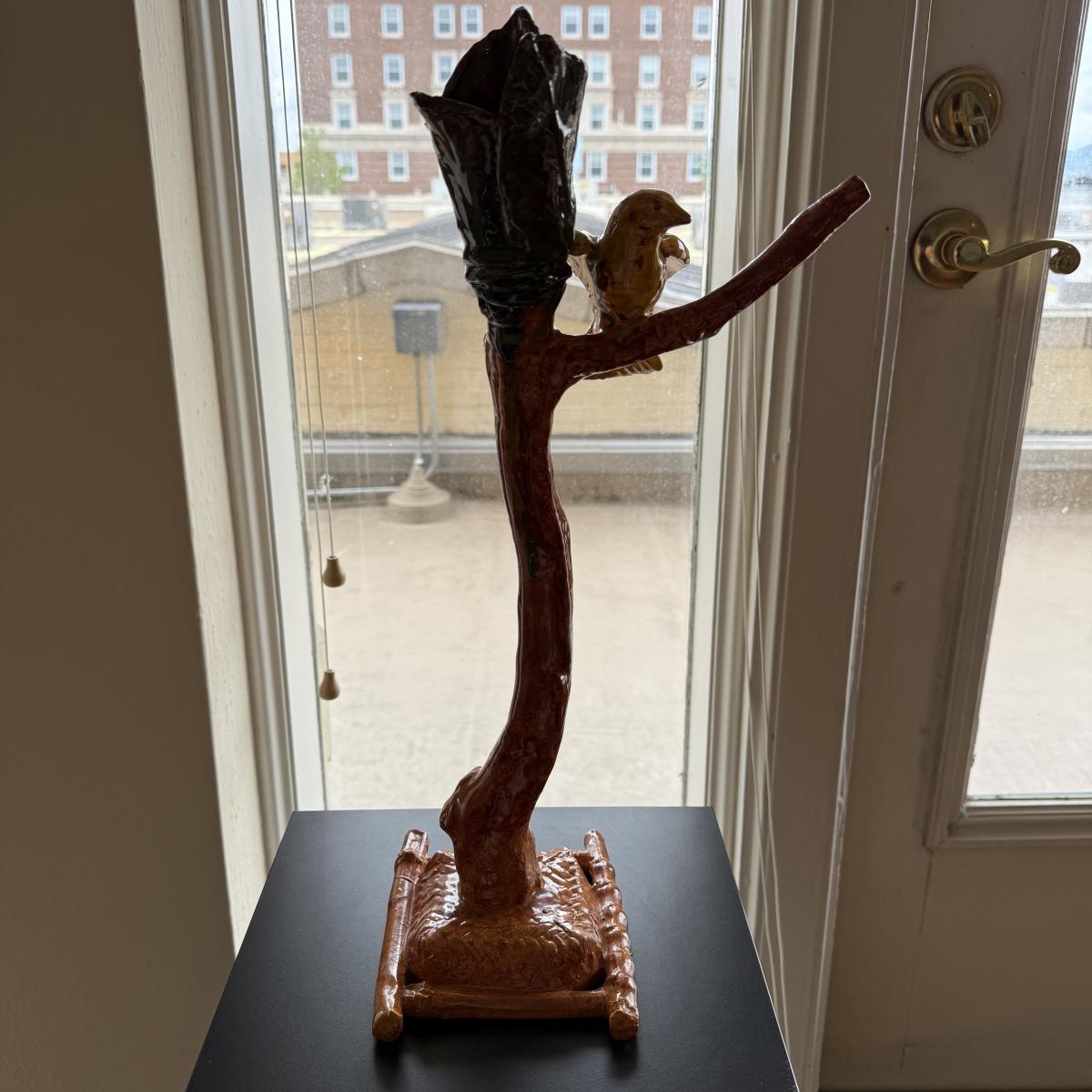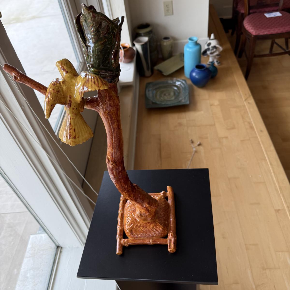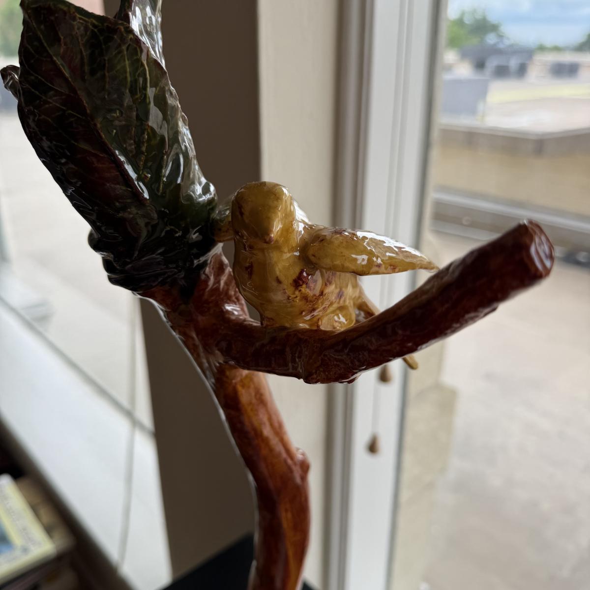 This lot contains a precious ceramic sculpture of a bird resting on a branch, labeled "Changstrom" on the bottom, likely indicating artist Beth Changstrom. This piece measures 5.5” x 6.5” x 18.25”H. The sculpture comes with a stand made of engineered wood. The stand has a removable top and measures 11.5” x 11.5” x 30.5”H.