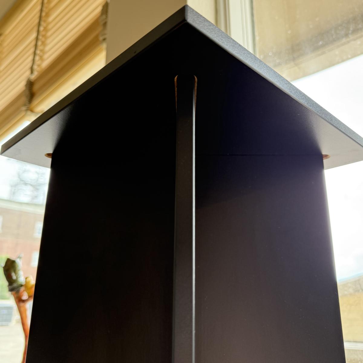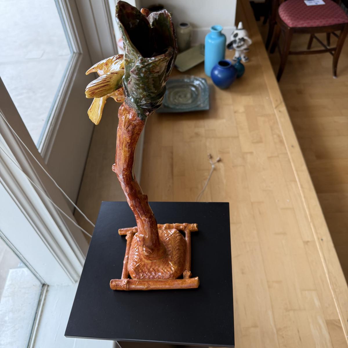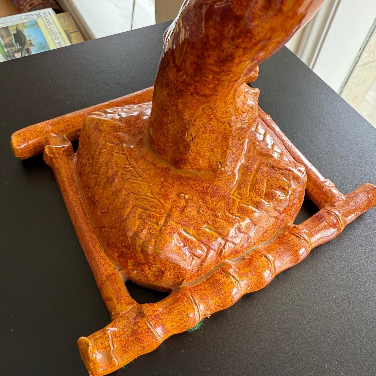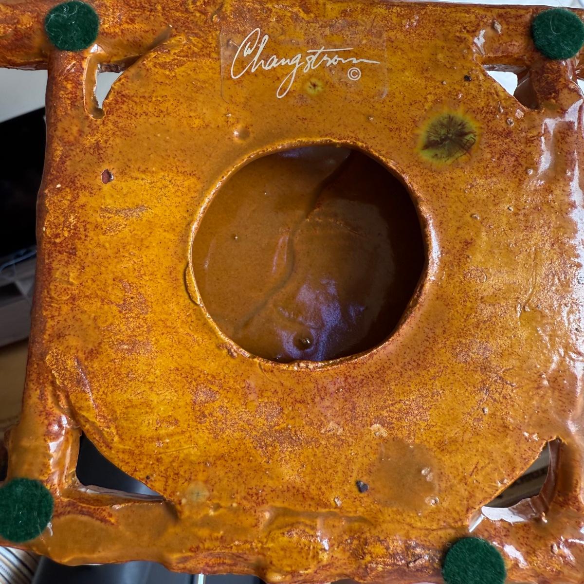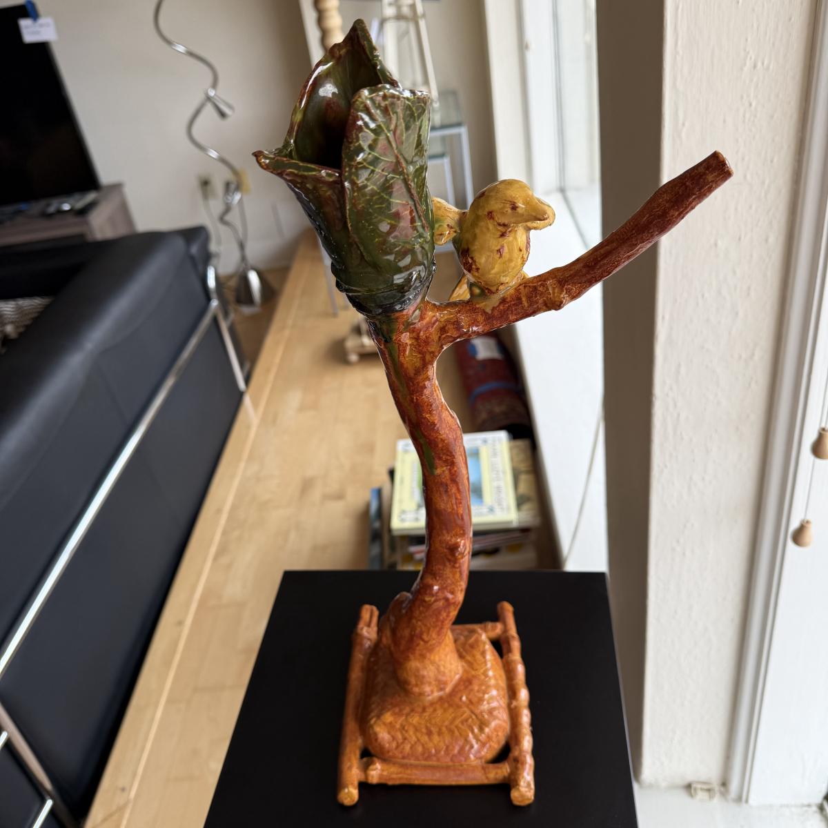 This lot contains a precious ceramic sculpture of a bird resting on a branch, labeled "Changstrom" on the bottom, likely indicating artist Beth Changstrom. This piece measures 5.5” x 6.5” x 18.25”H. The sculpture comes with a stand made of engineered wood. The stand has a removable top and measures 11.5” x 11.5” x 30.5”H.