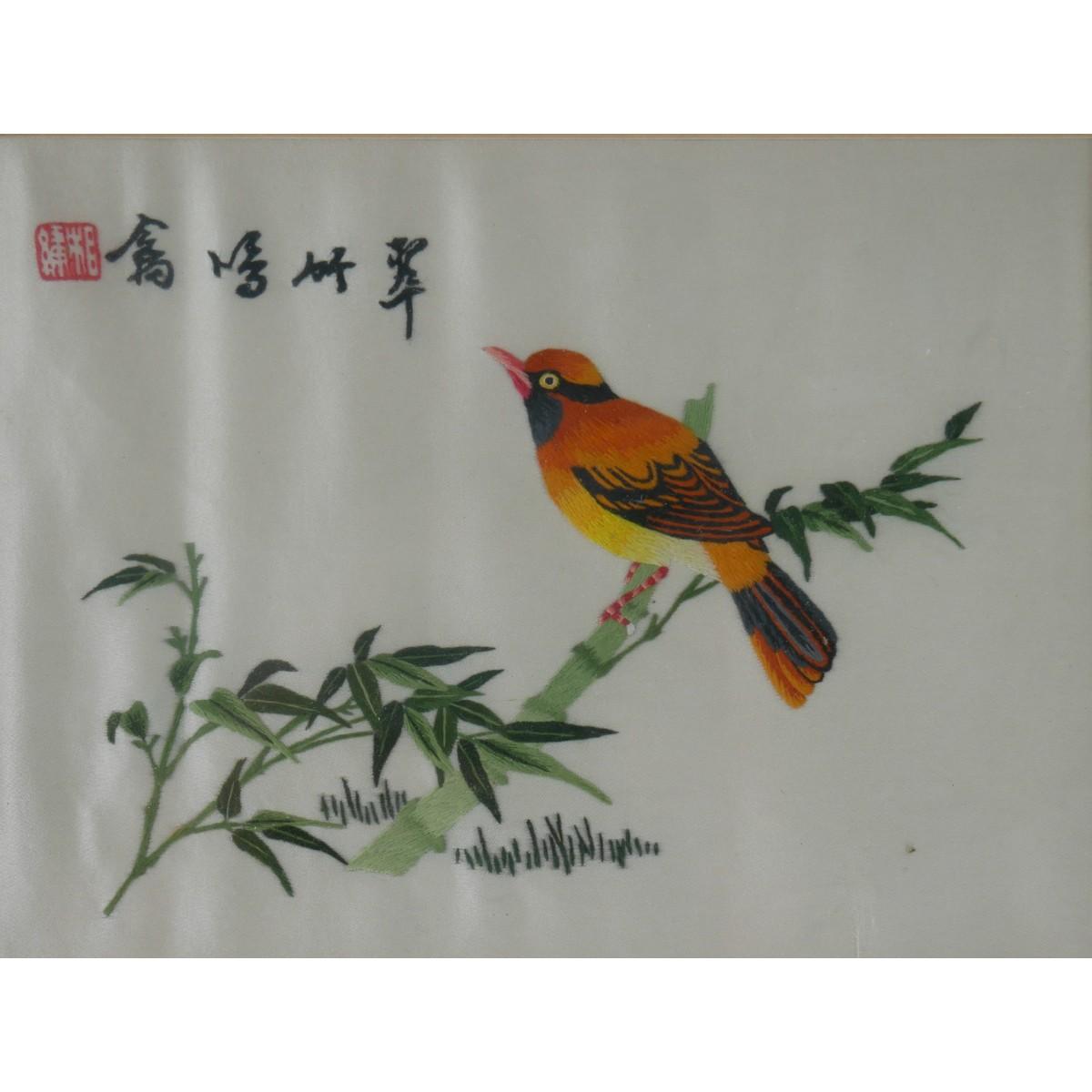 Bird on Bamboo Asian Embroidery Artwork