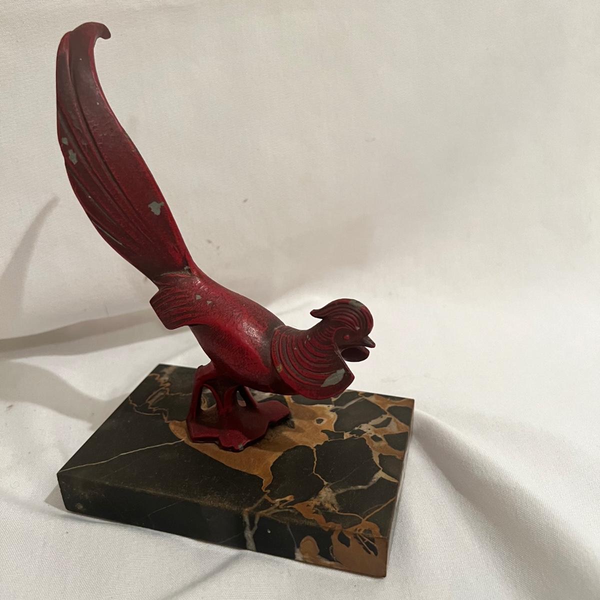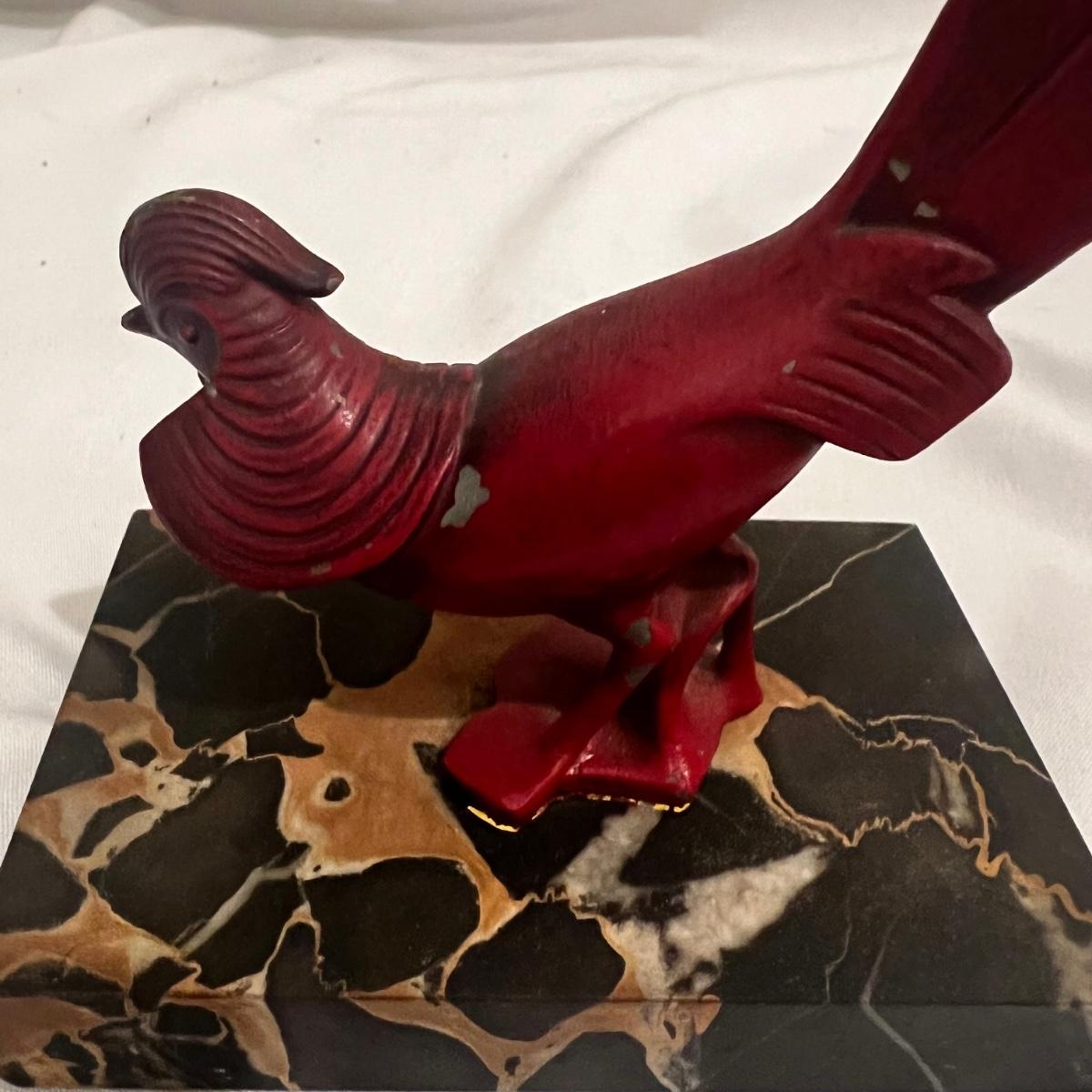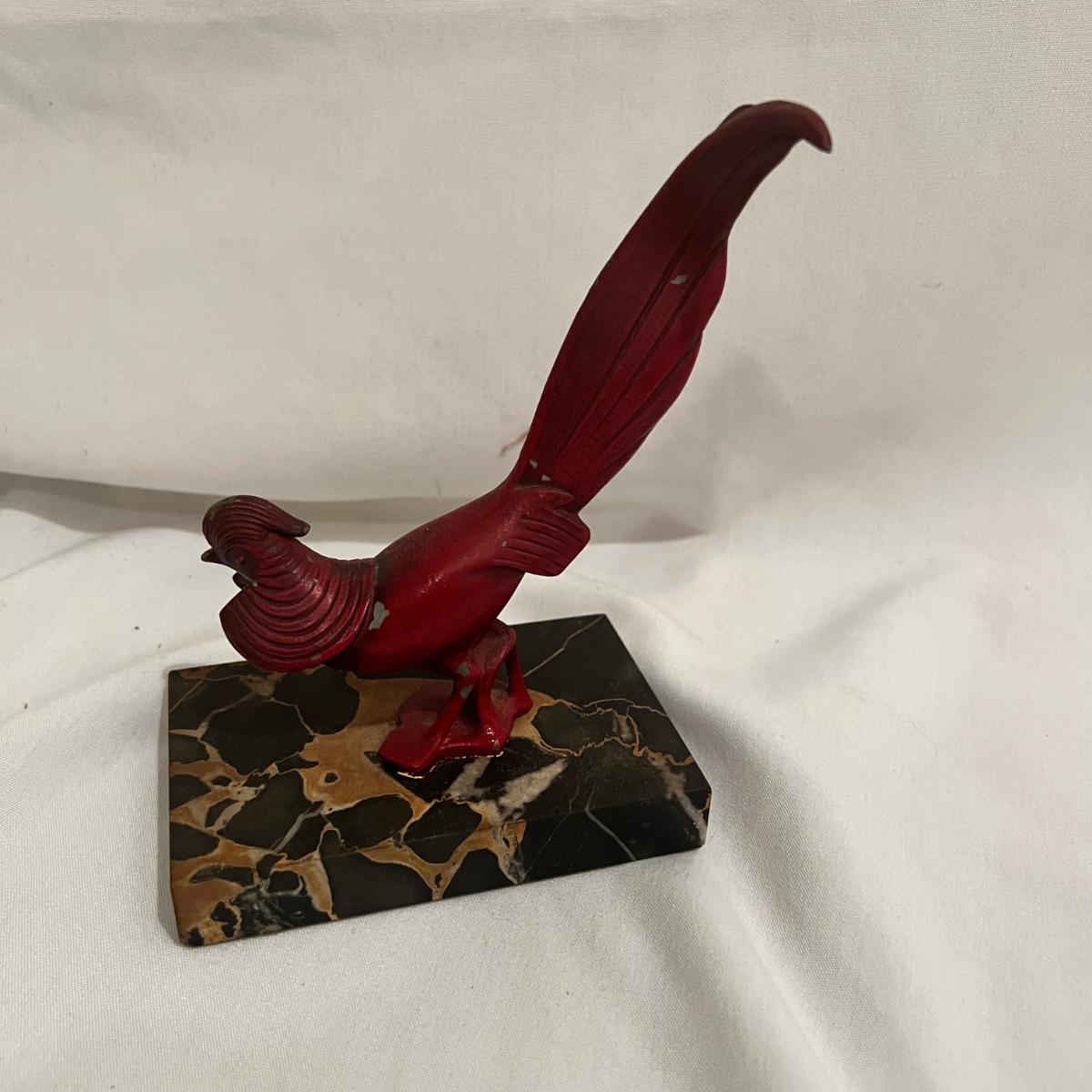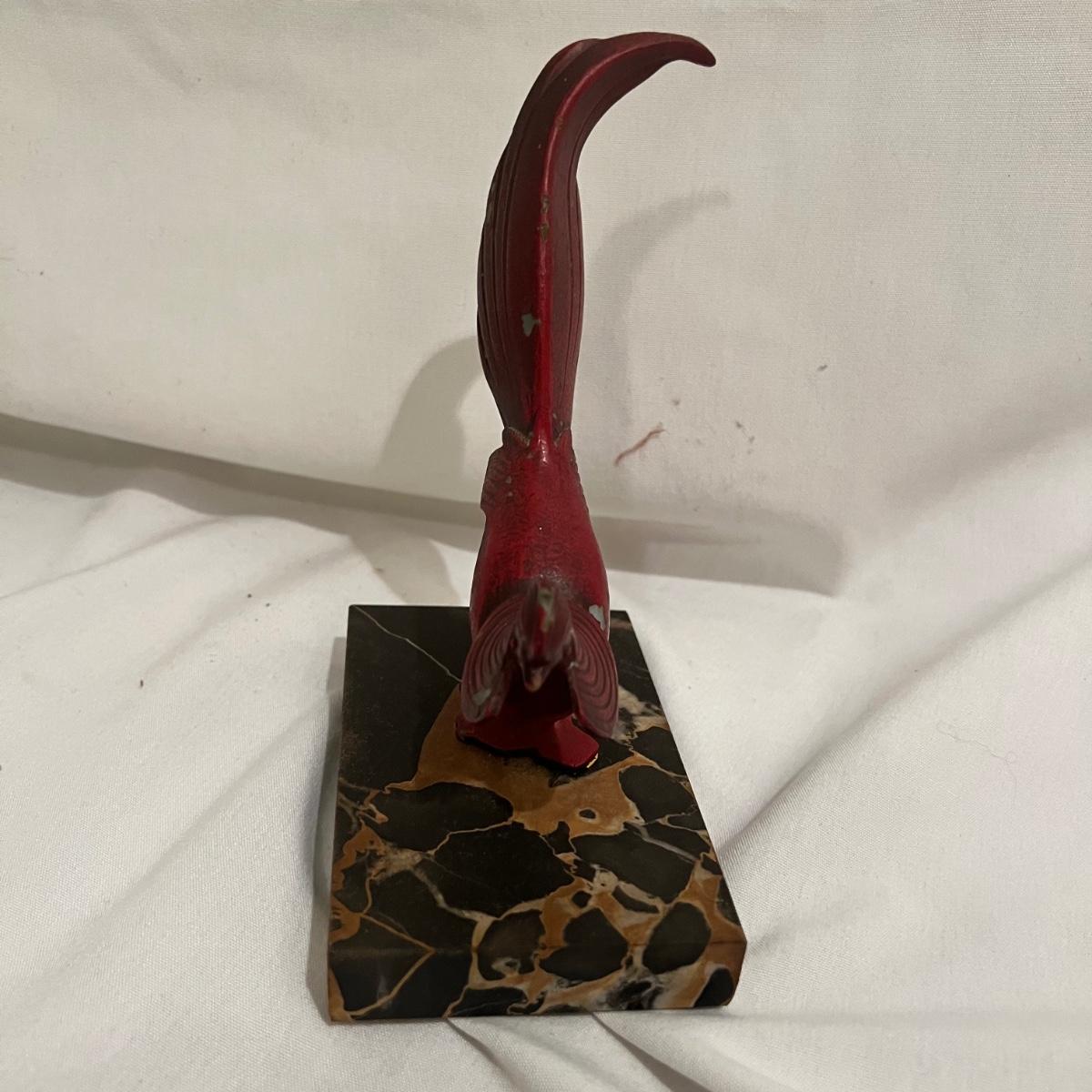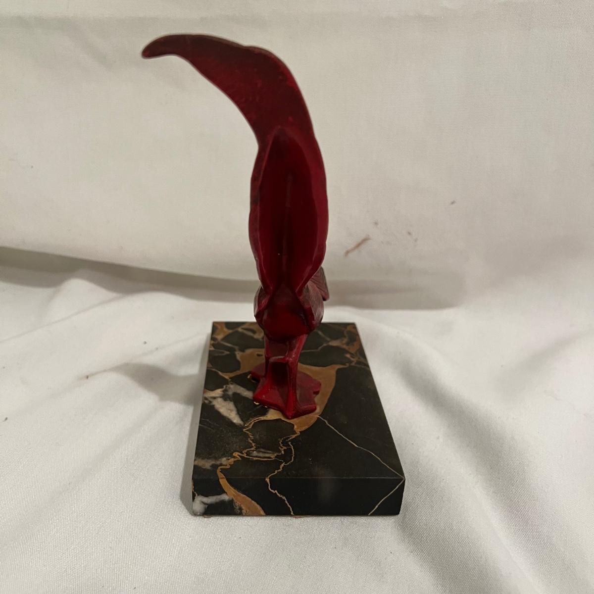 A red bird mounted on a marble square. The entire sculpture measures approximately 5” x 3.75” x 7”H.