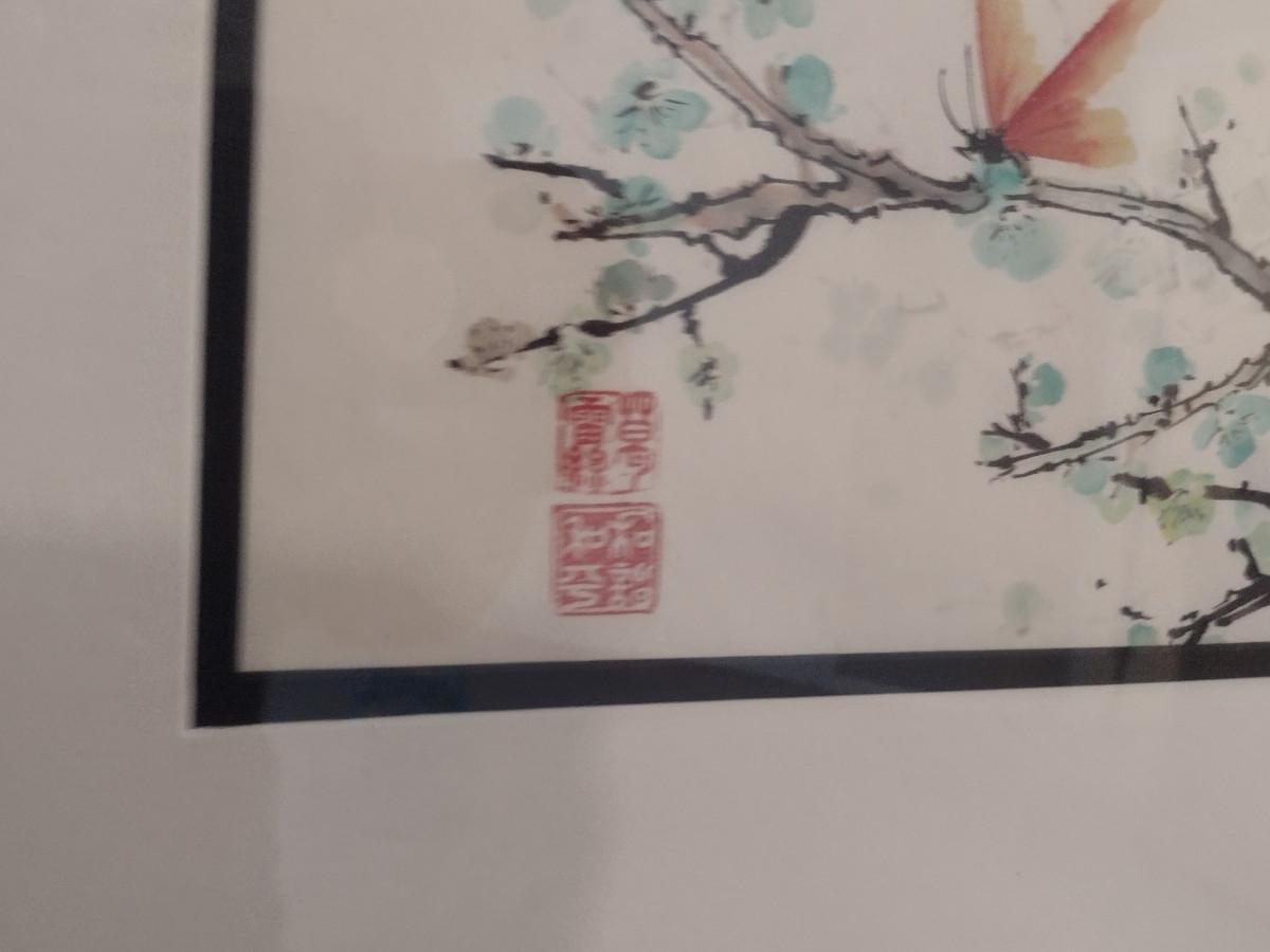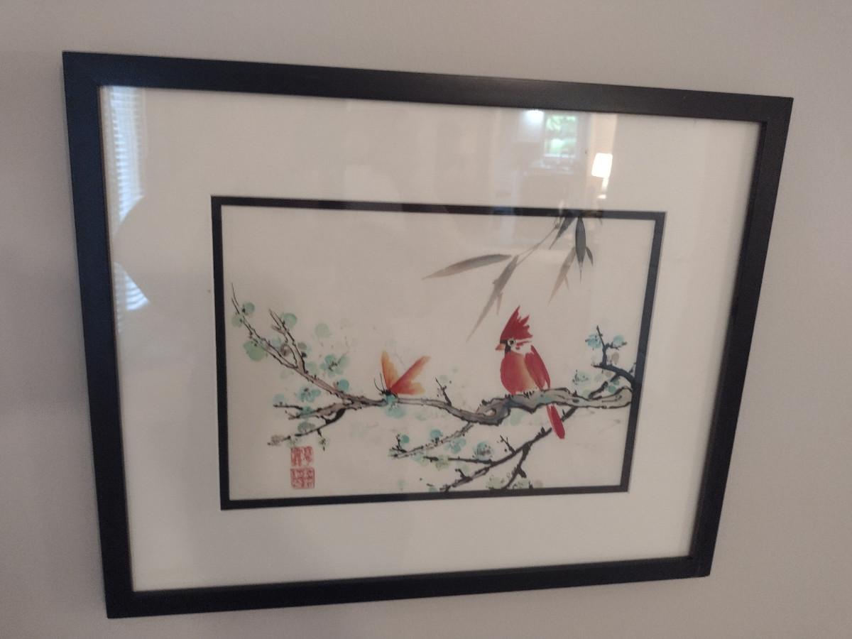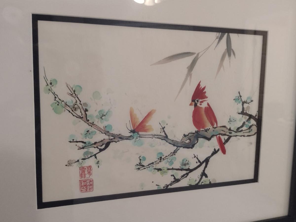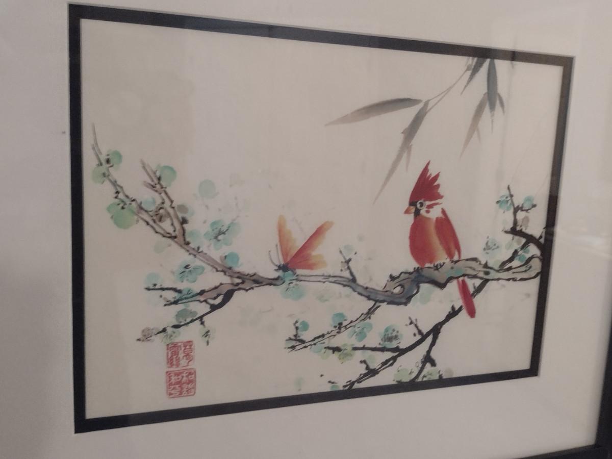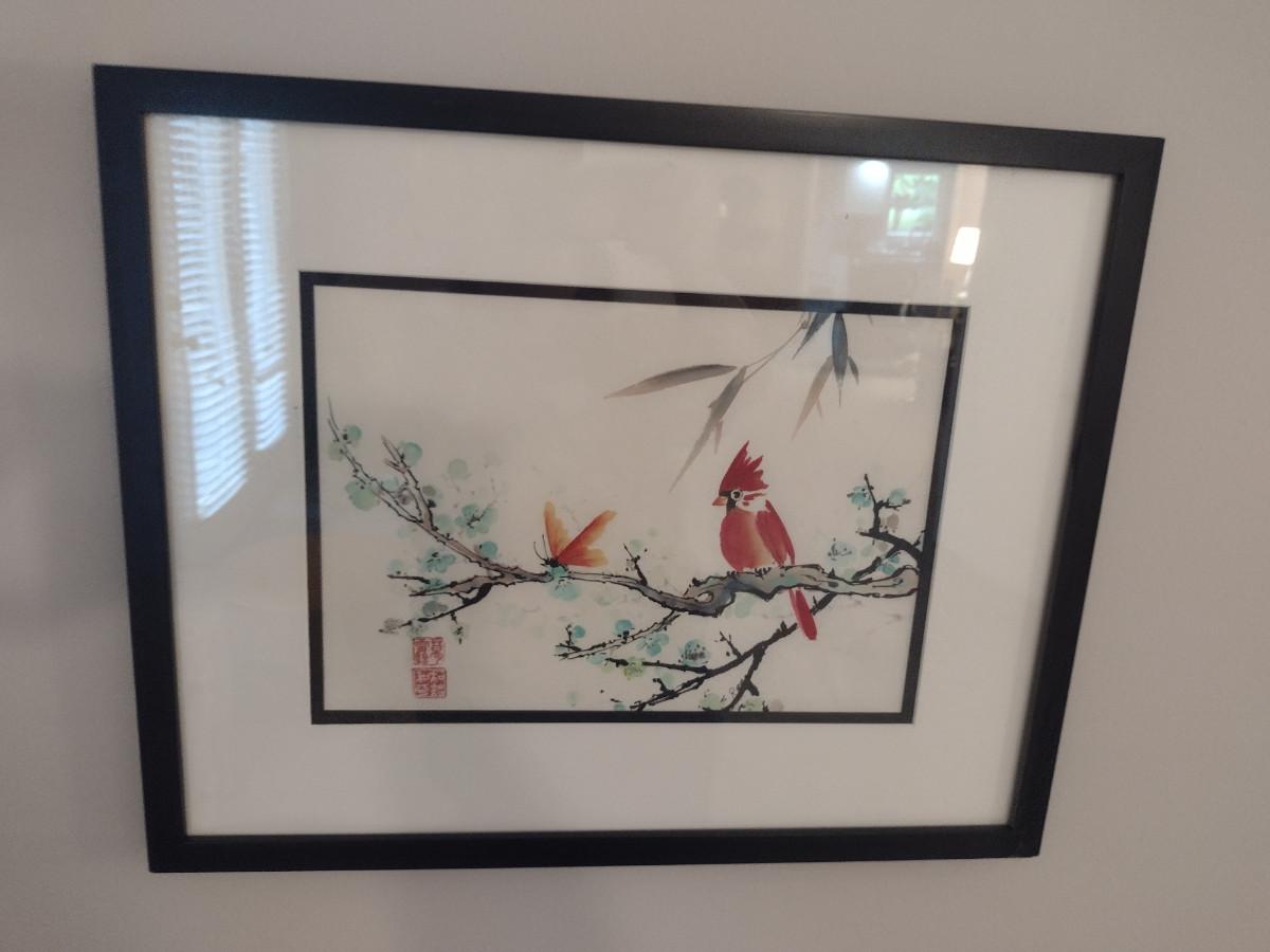Bird Theme Print- Framed Under Glass- Approx 21 1/2" x 16 3/4". Chop mark signature.