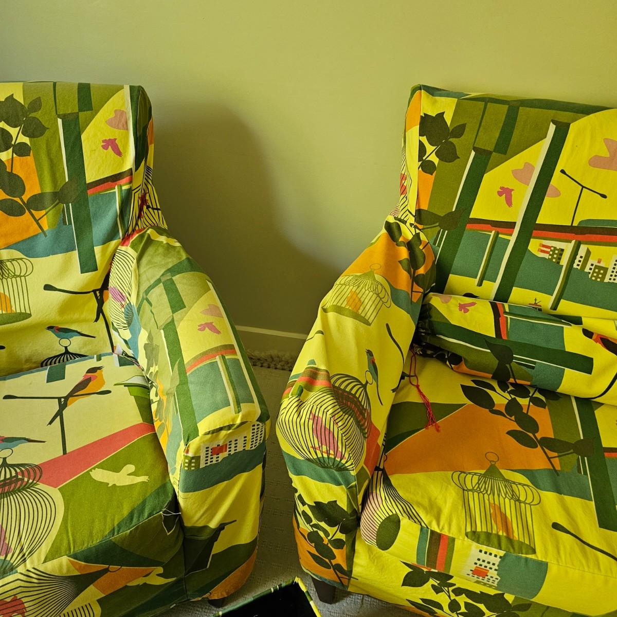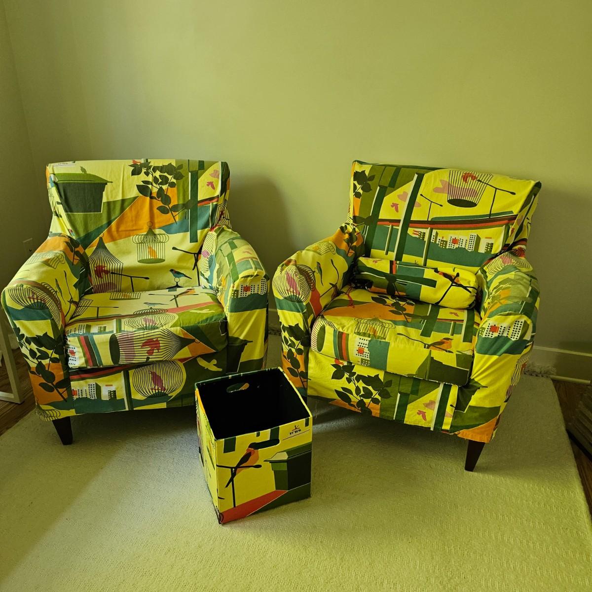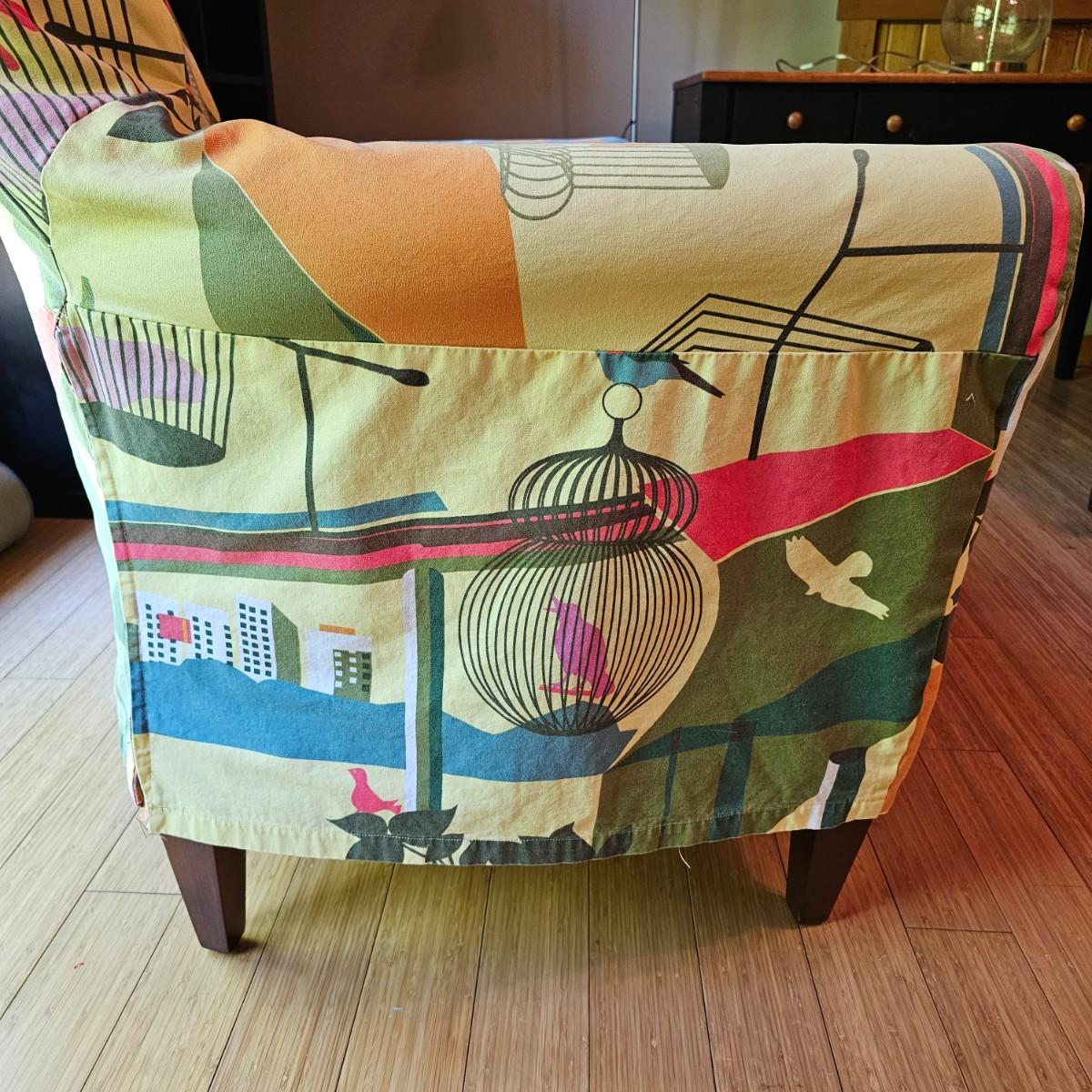 A fun looking pair of bird and cage covered chairs. Bird pieces are slipcovers on the original upholstery, see photos for details. Chairs measure 33.5" x 30" x 36"H and have a 19" seat height. Also includes a small matching pillow and storage box. Local pickup only.