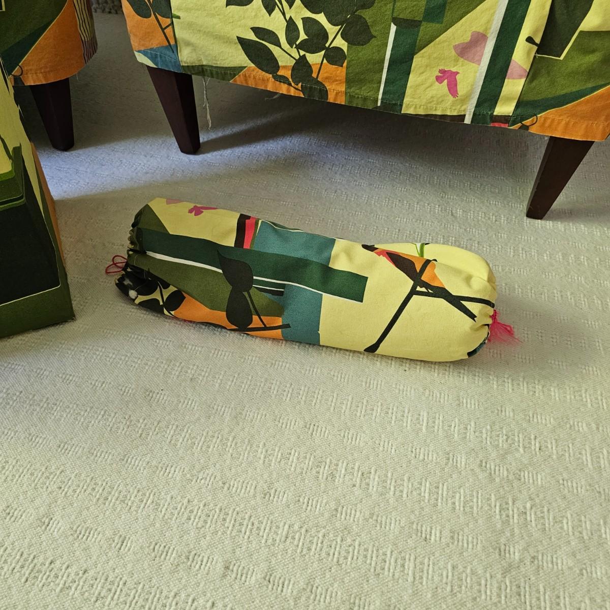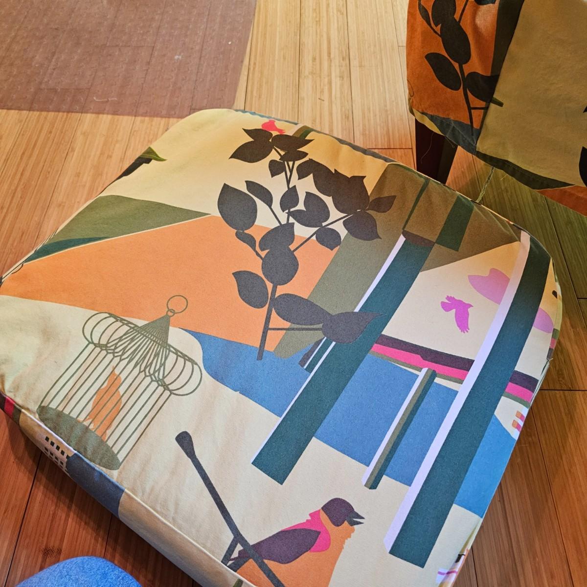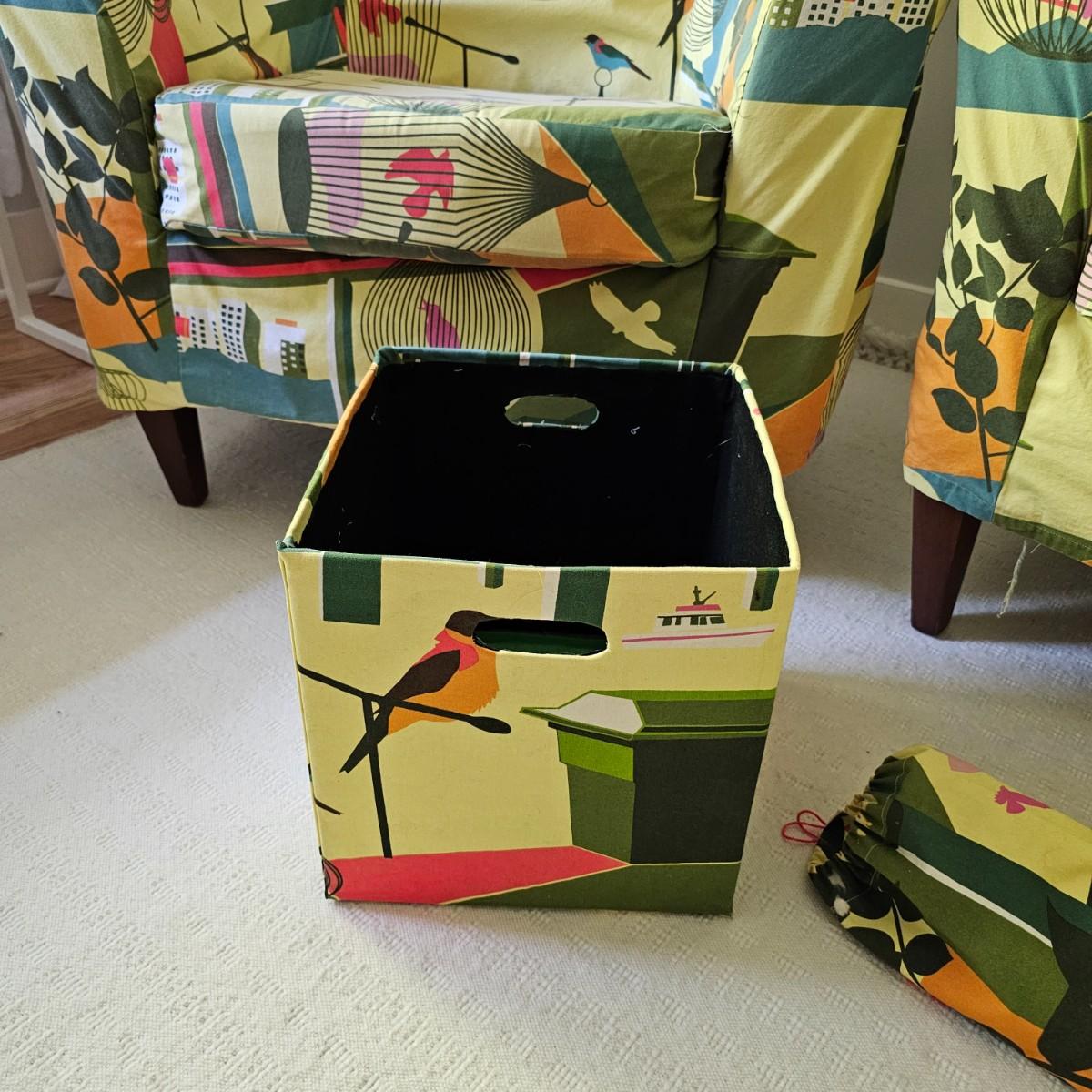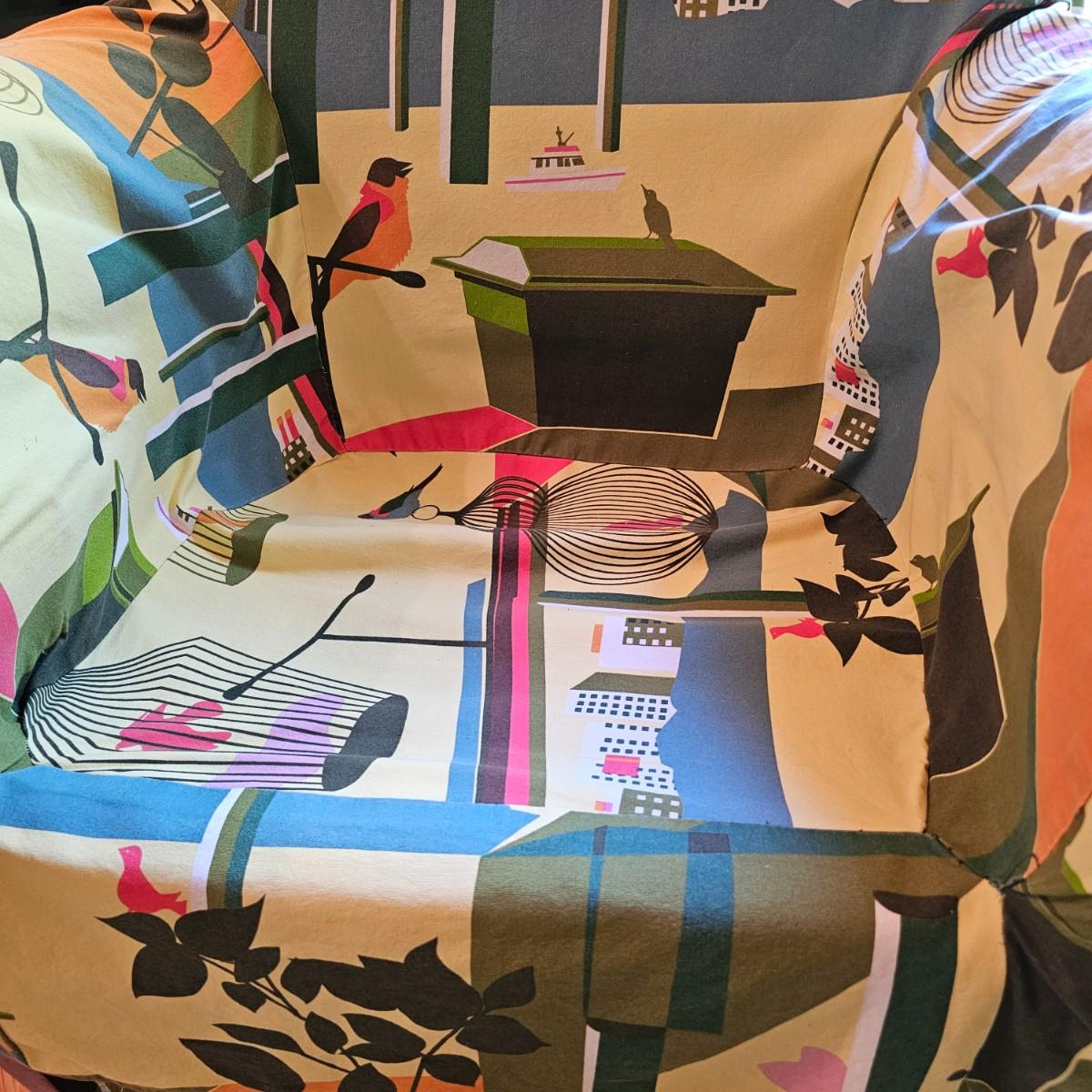 A fun looking pair of bird and cage covered chairs. Bird pieces are slipcovers on the original upholstery, see photos for details. Chairs measure 33.5" x 30" x 36"H and have a 19" seat height. Also includes a small matching pillow and storage box. Local pickup only.
