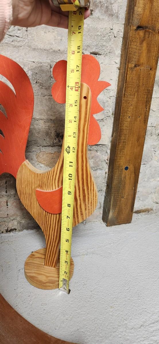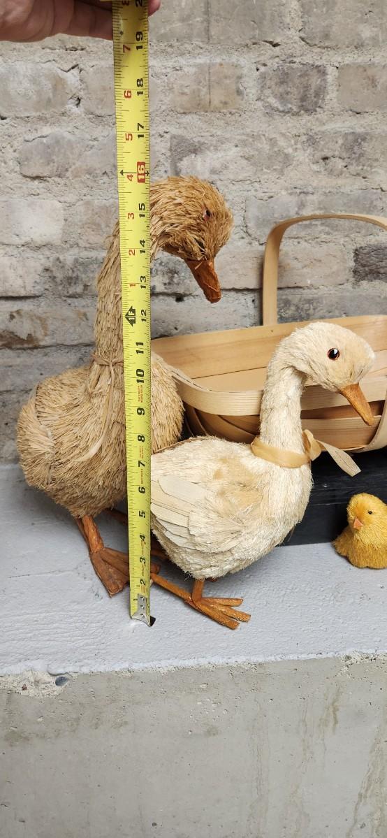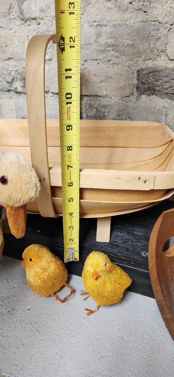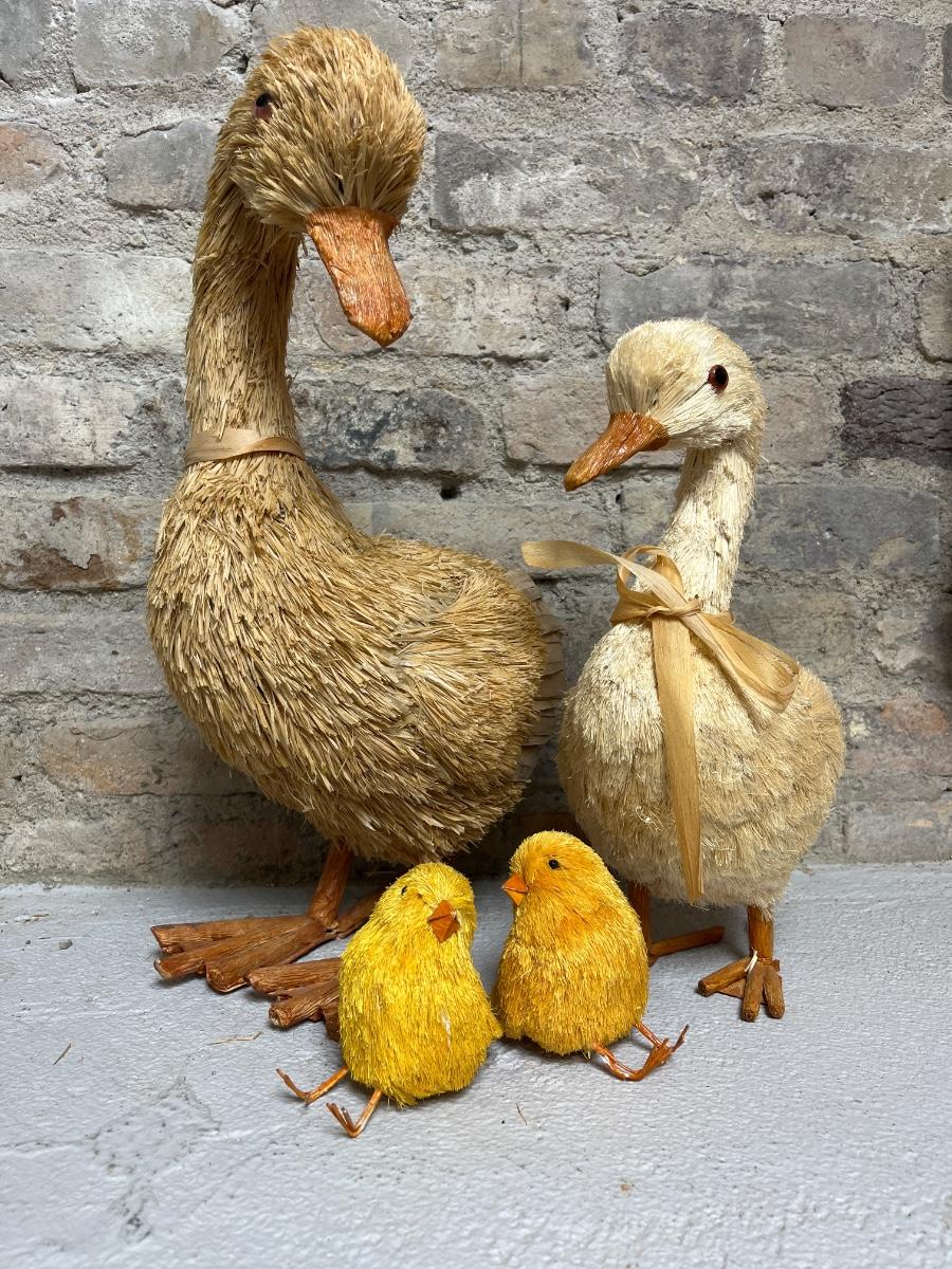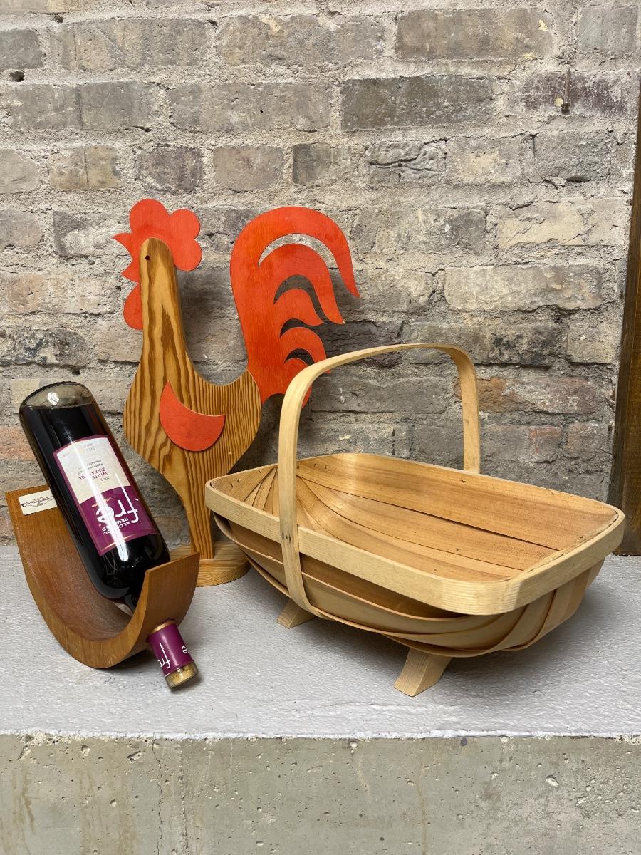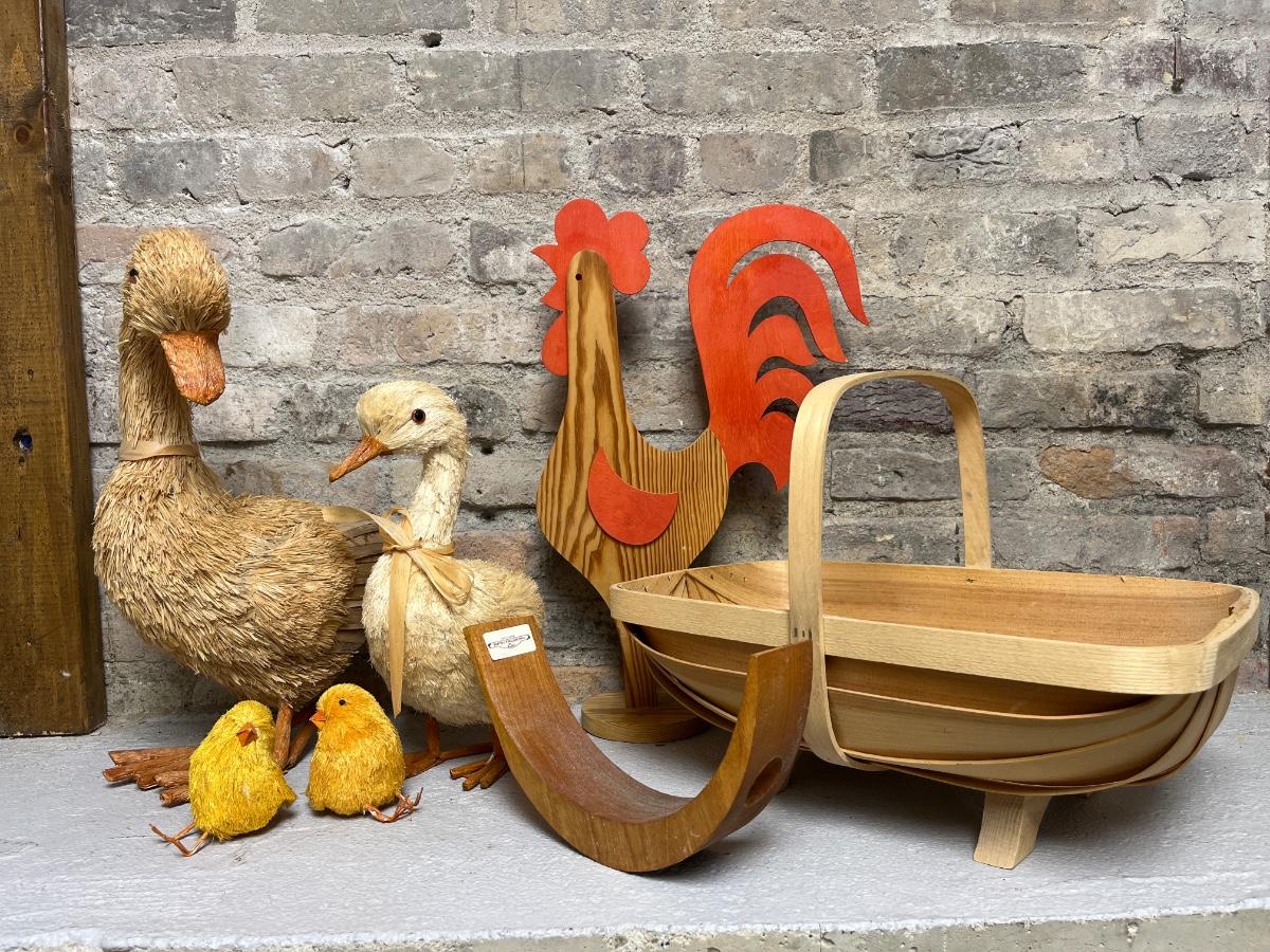 Natural fiber ducks and chicks, a trug basket, wooden rooster and a gravity wine bottle holder