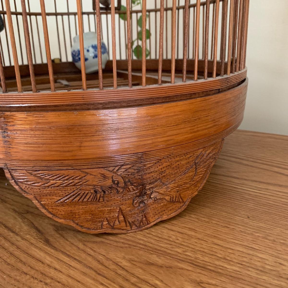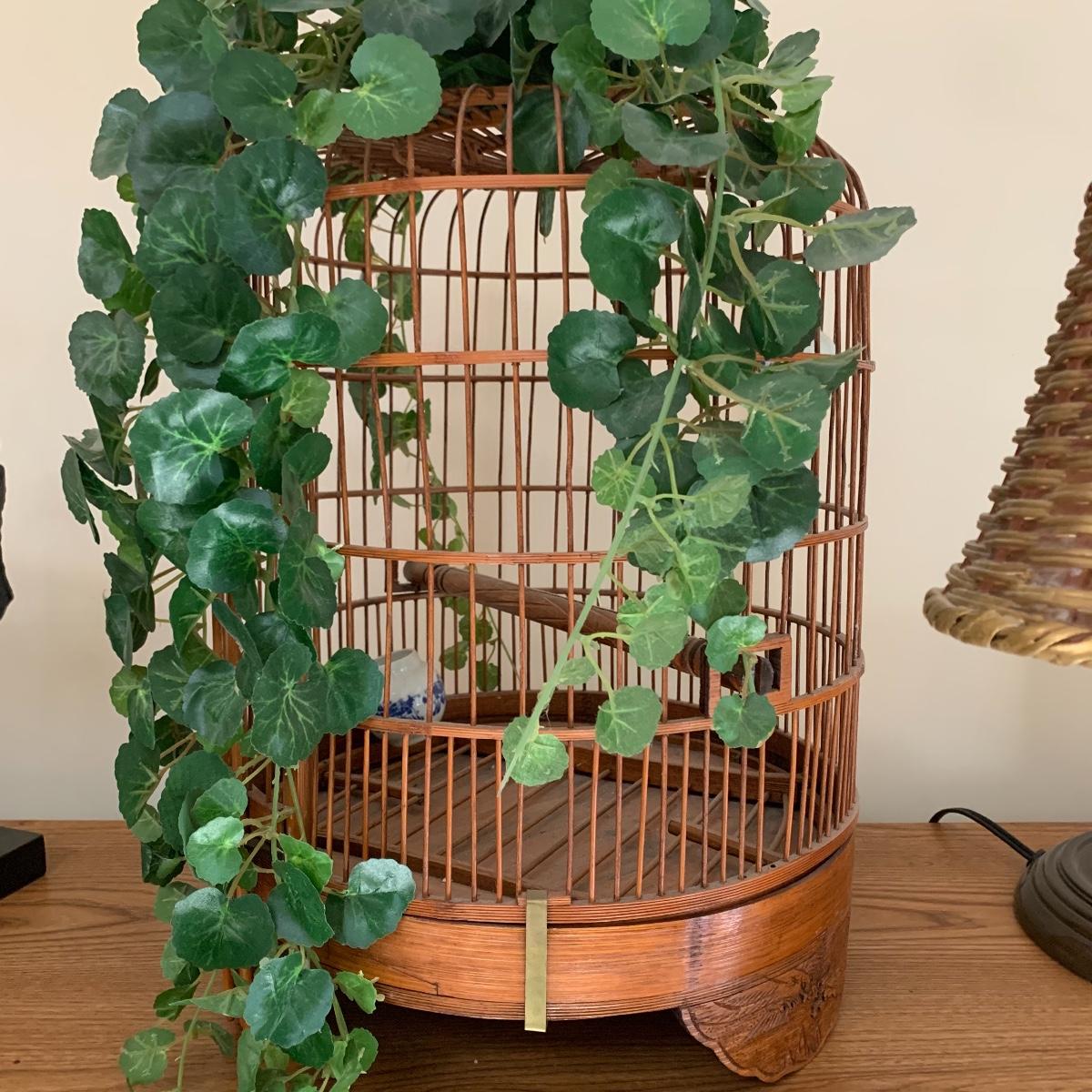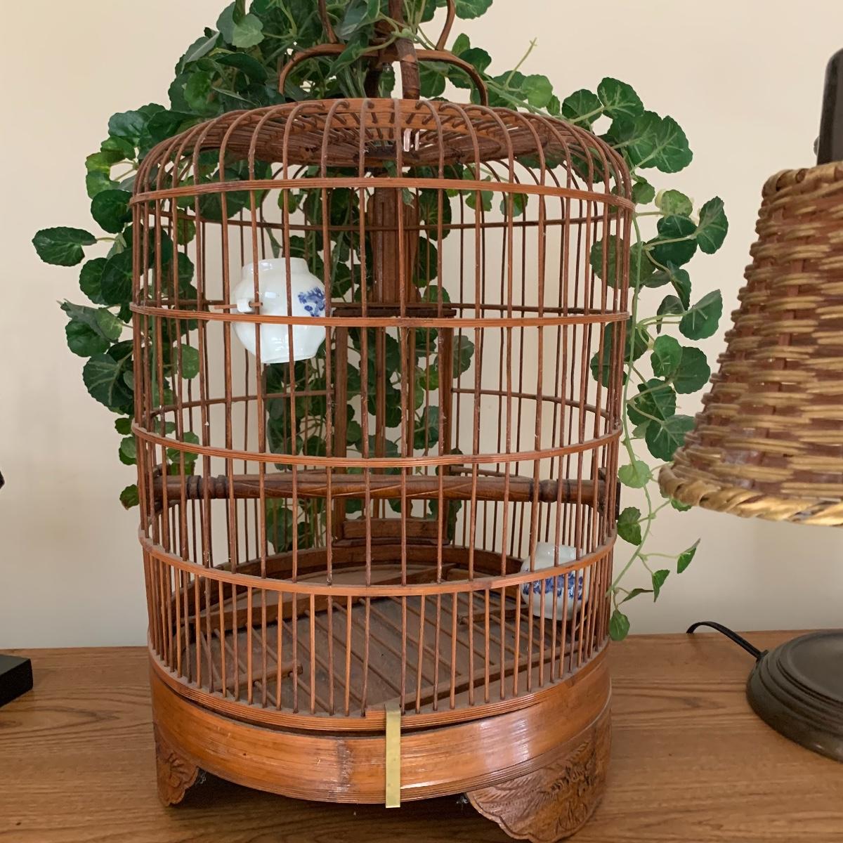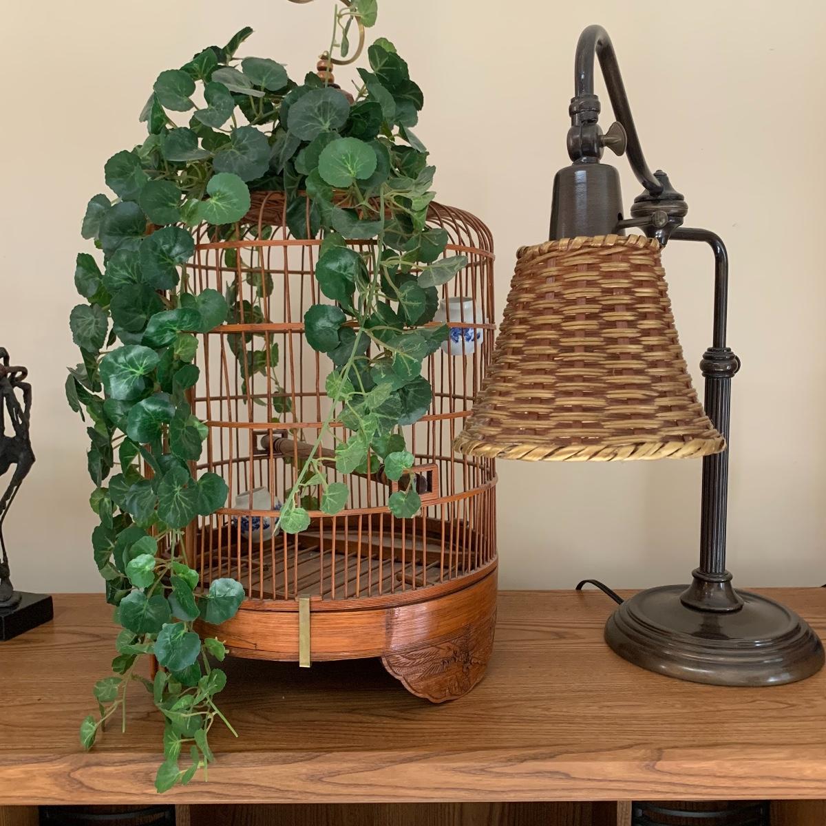 This lot includes a wooden birdcage that measures 12"d x 22", and a lamp that is adjustable and stands 21” tall. Both pieces are in good condition. The lamp powered on when plugged in. The lamp swivels and can adjust its’ height and the shade can adjust/tilt. The shade is made of vinyl material. Local pickup only.