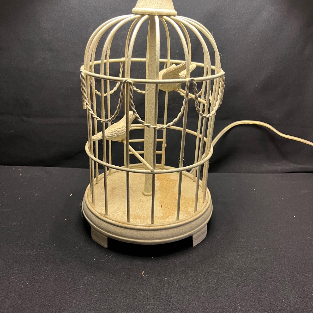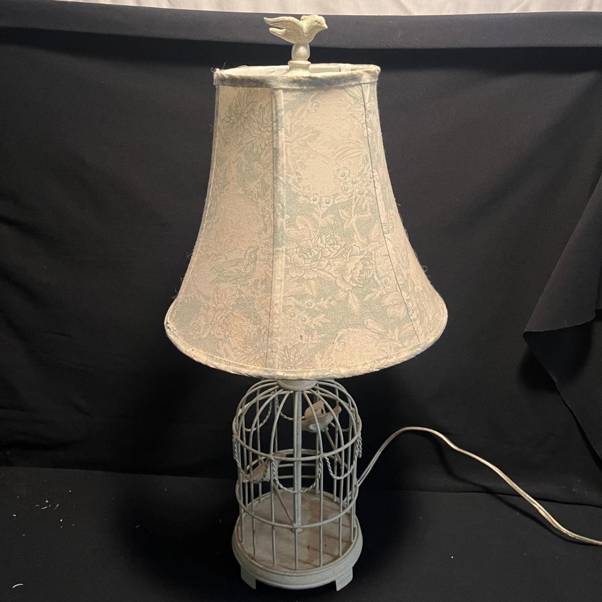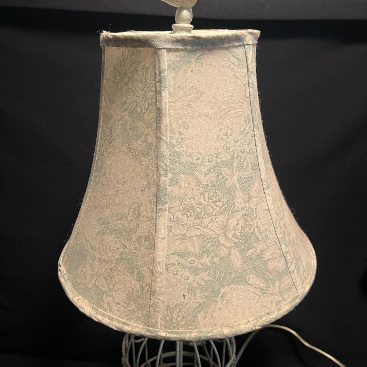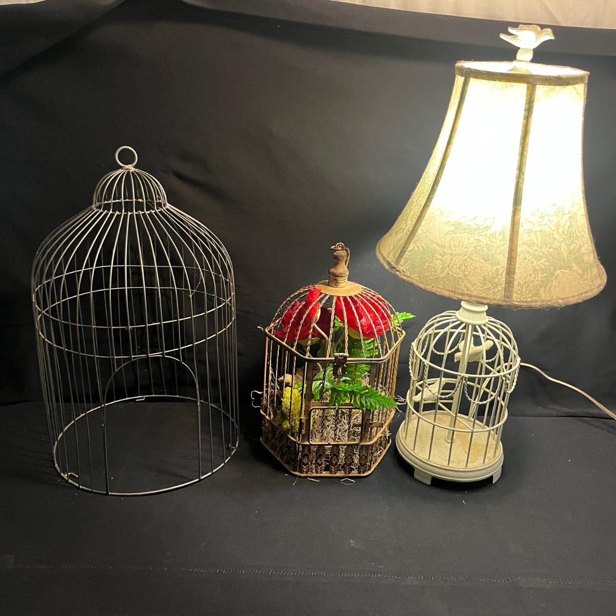 Lot includes a metal birdcage lamp, metal birdcage with faux flowers and a metal birdcage top with no bottom. Lamp measures 12”D x 24”H with shade and powered on when plugged in.