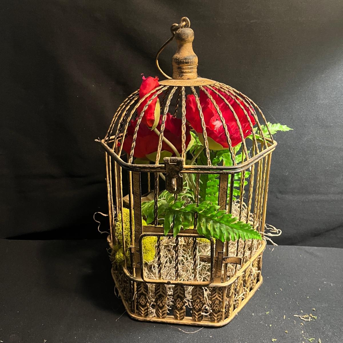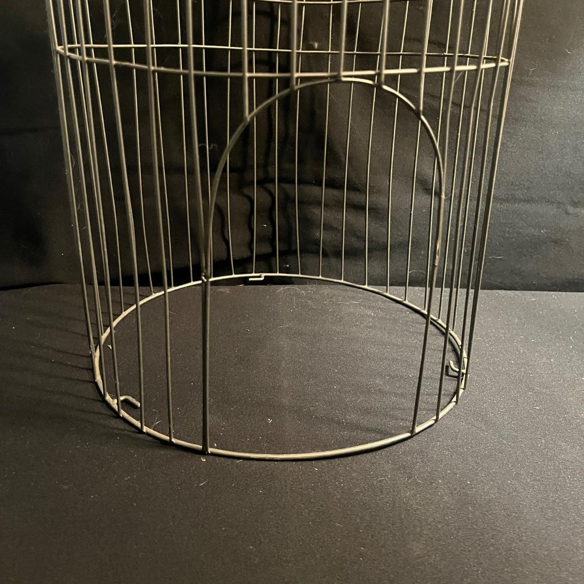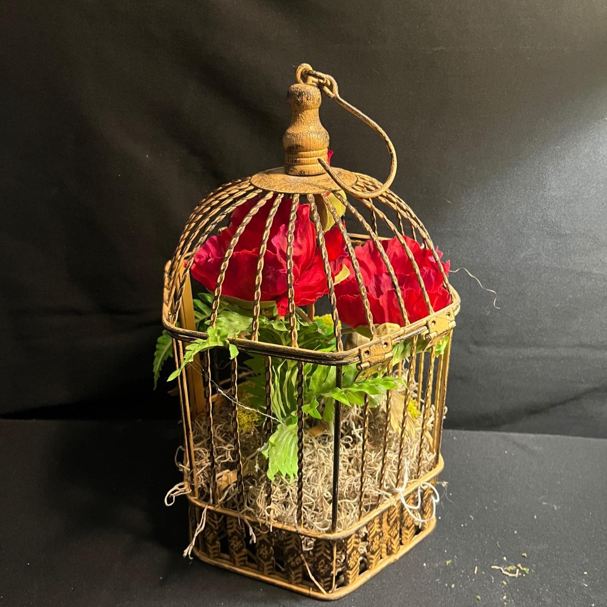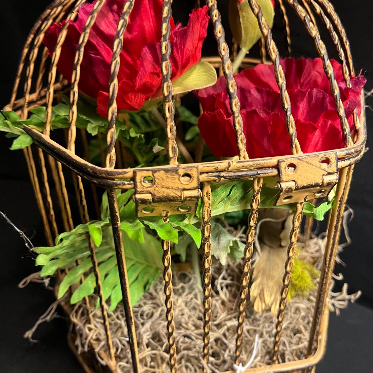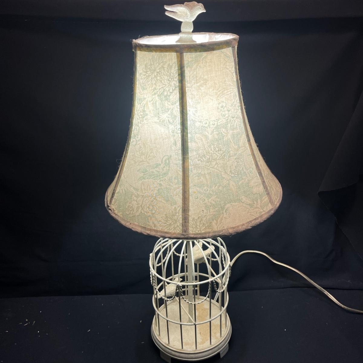 Lot includes a metal birdcage lamp, metal birdcage with faux flowers and a metal birdcage top with no bottom. Lamp measures 12”D x 24”H with shade and powered on when plugged in.