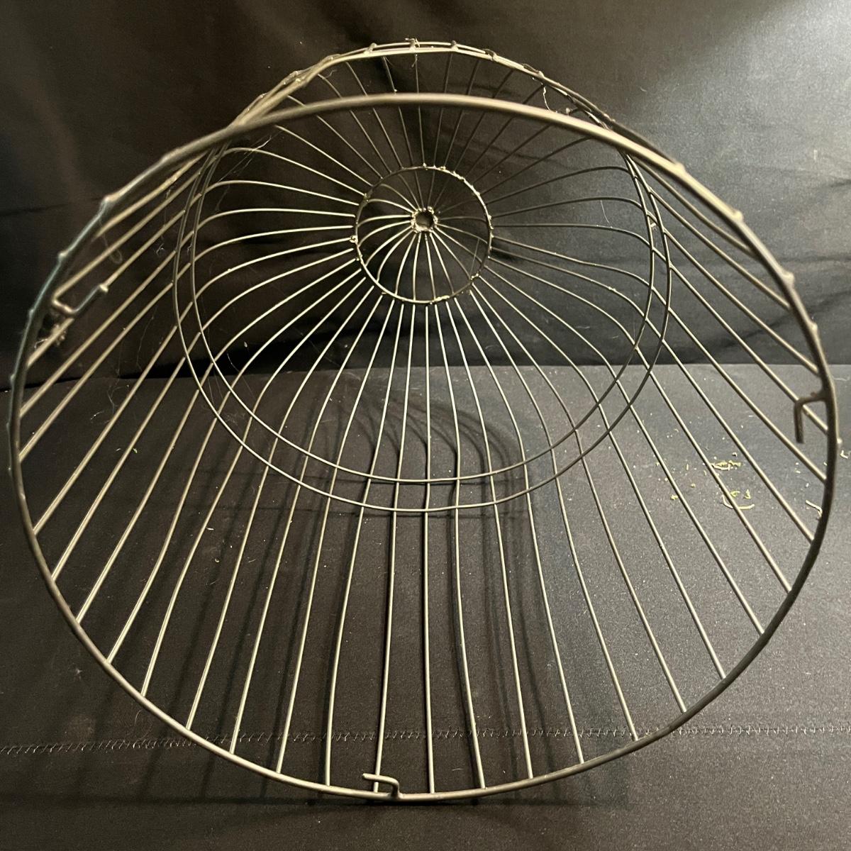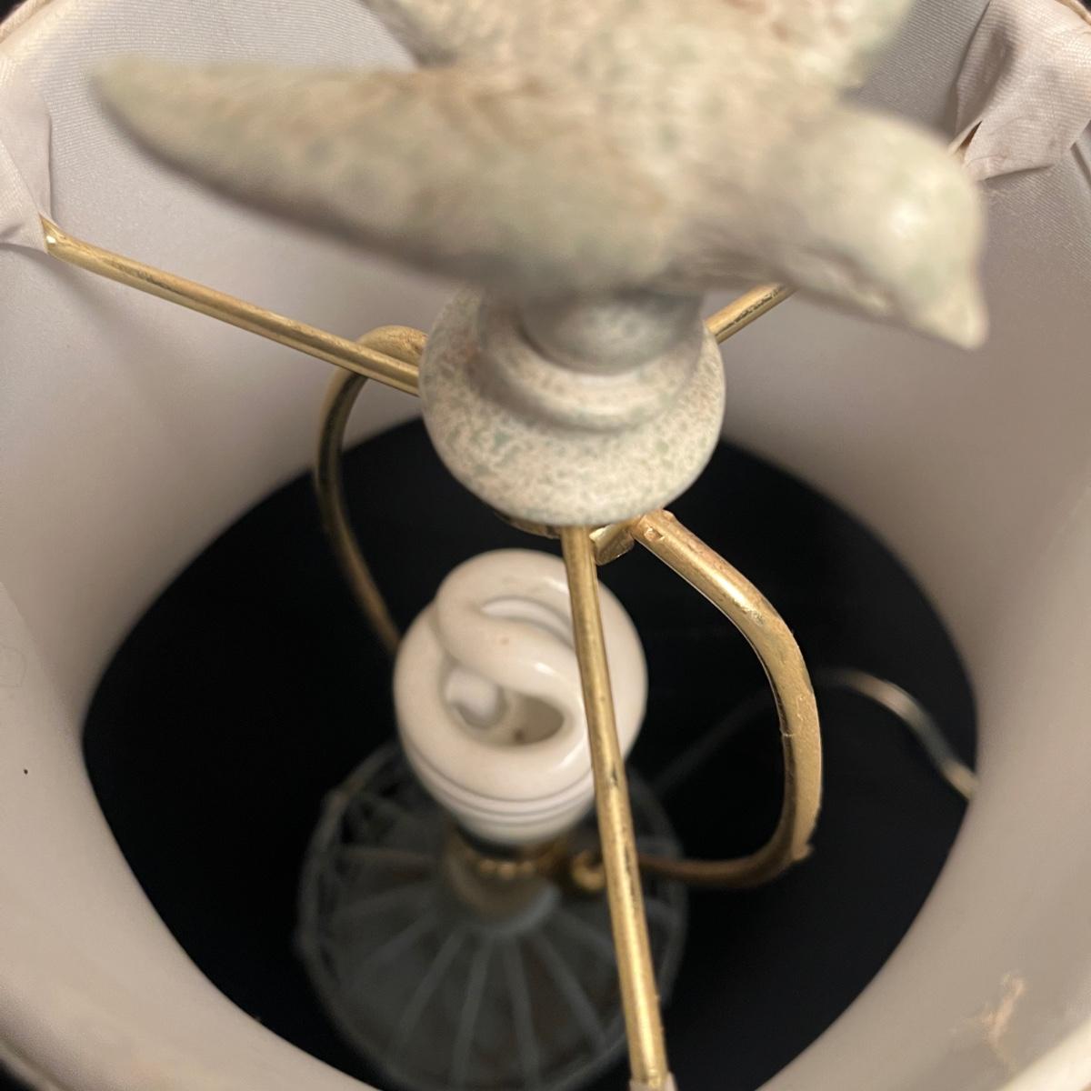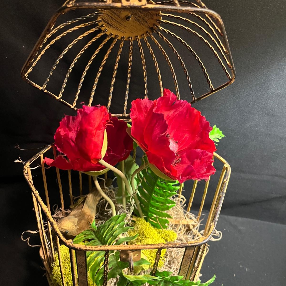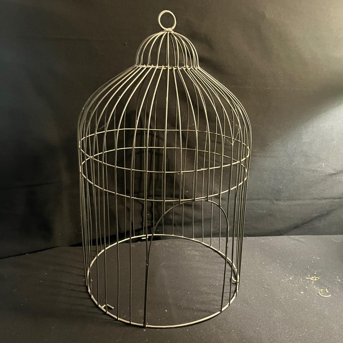 Lot includes a metal birdcage lamp, metal birdcage with faux flowers and a metal birdcage top with no bottom. Lamp measures 12”D x 24”H with shade and powered on when plugged in.