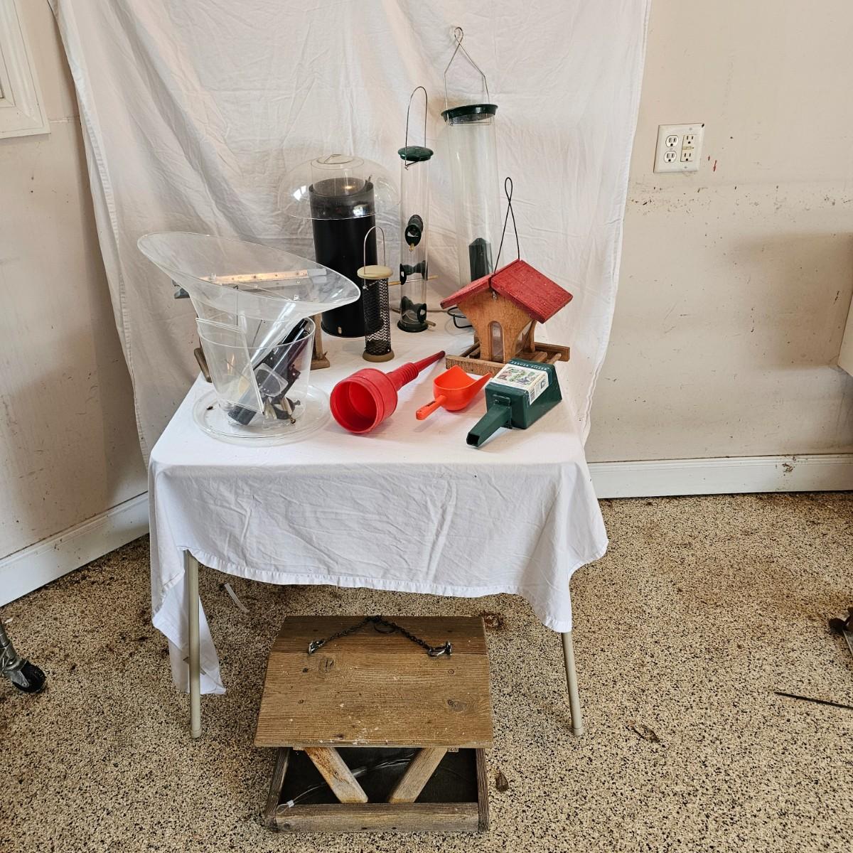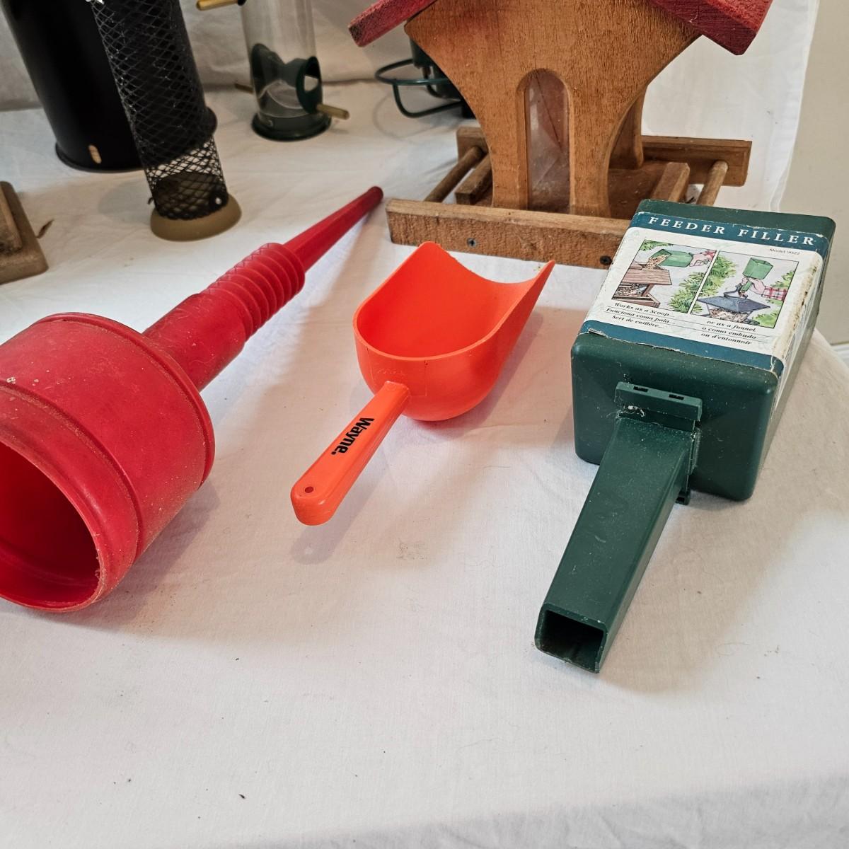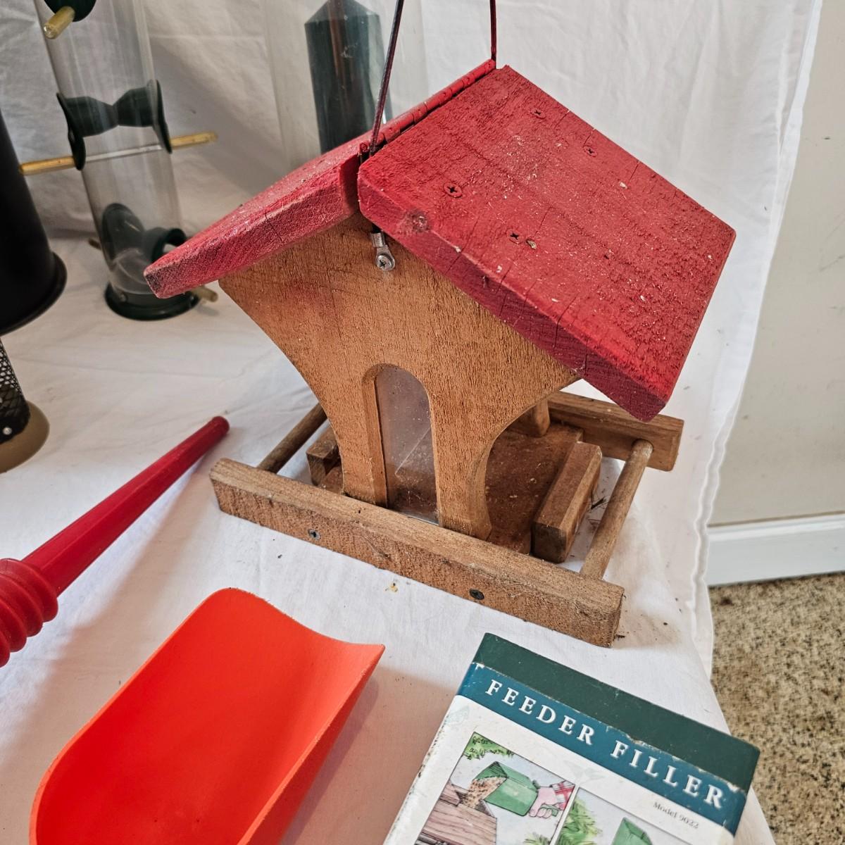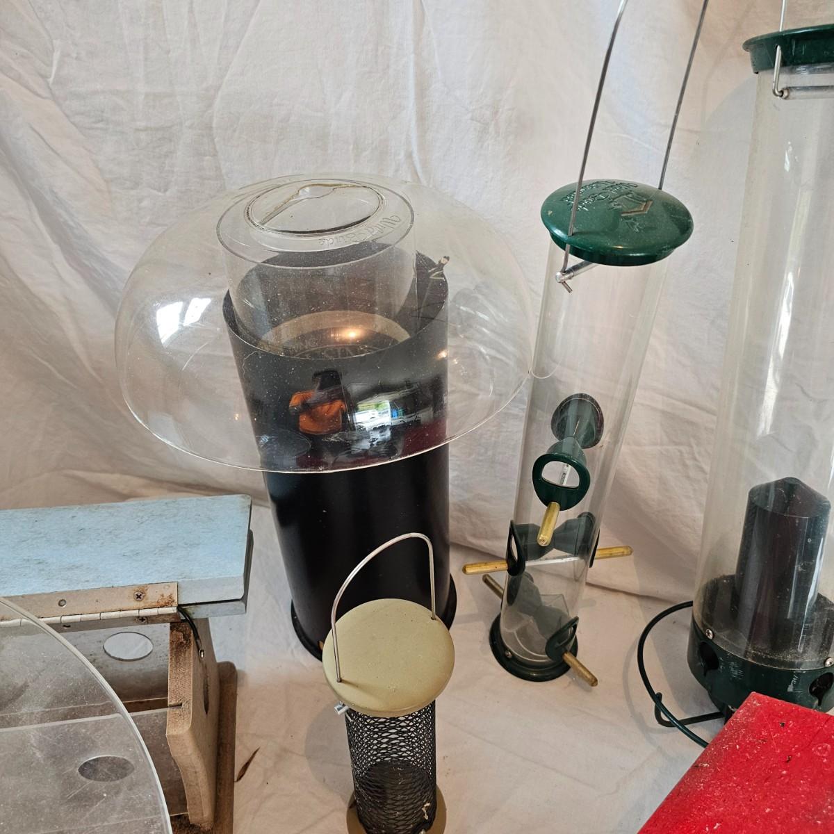 Collection of birdfeeders and scoops for backyard enjoyment. Round hanging tubes and some handmade wooden items as well. The big gazebo type is 13"'x 17.5" x 12"H. The tall clear cylinder is 8.5" D x 29"H. New and used items. Includes several scoops and filler tubes for feed. See photos for details. Local pickup only.