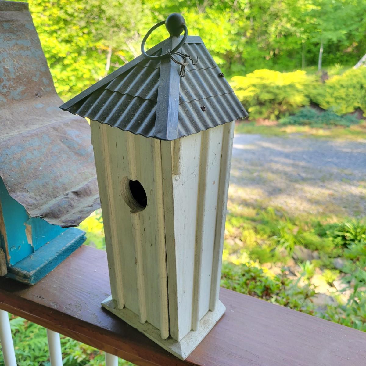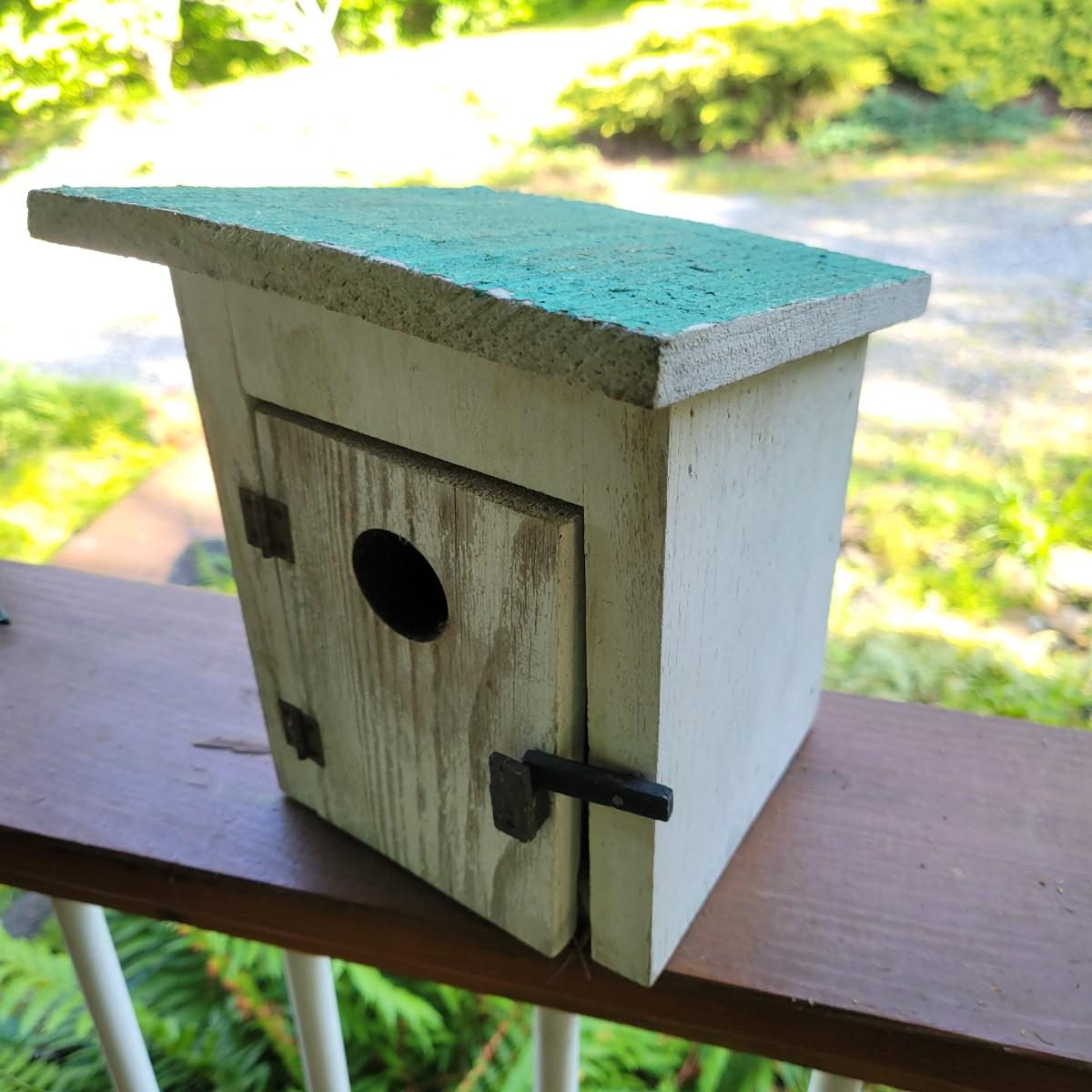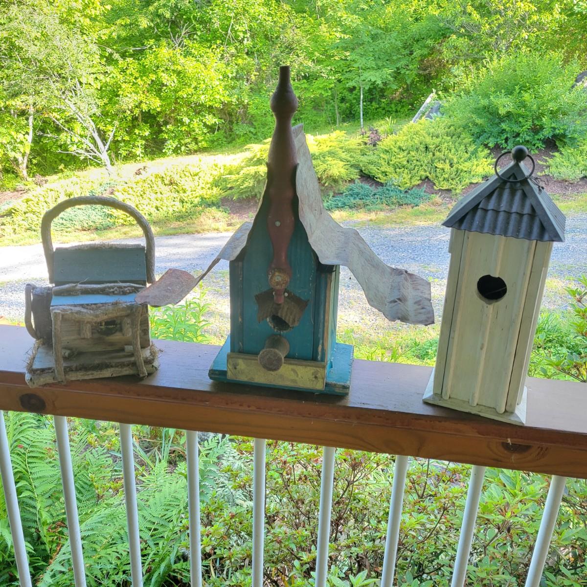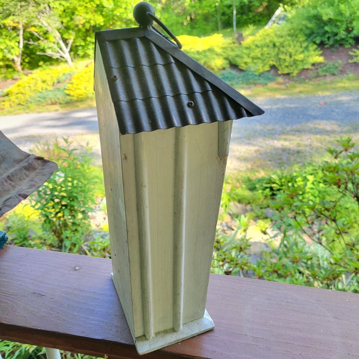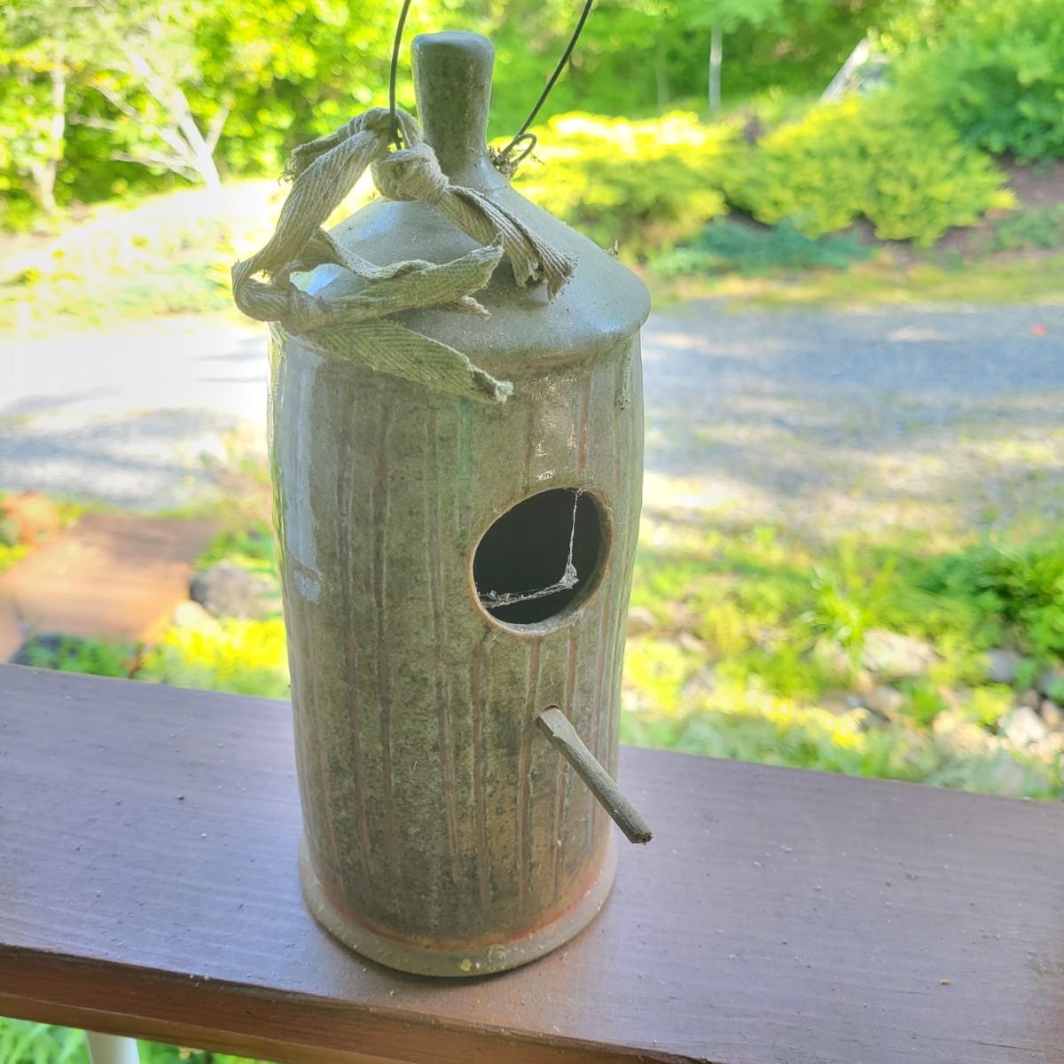 An assortment of seven birdhouses in an array of sizes and materials. Most are wooden, but one is a signed piece of pottery. The largest birdhouse measures approximately 16" x 7" x 17.5"H. This lot also includes a suet bird feeder. Local pickup only