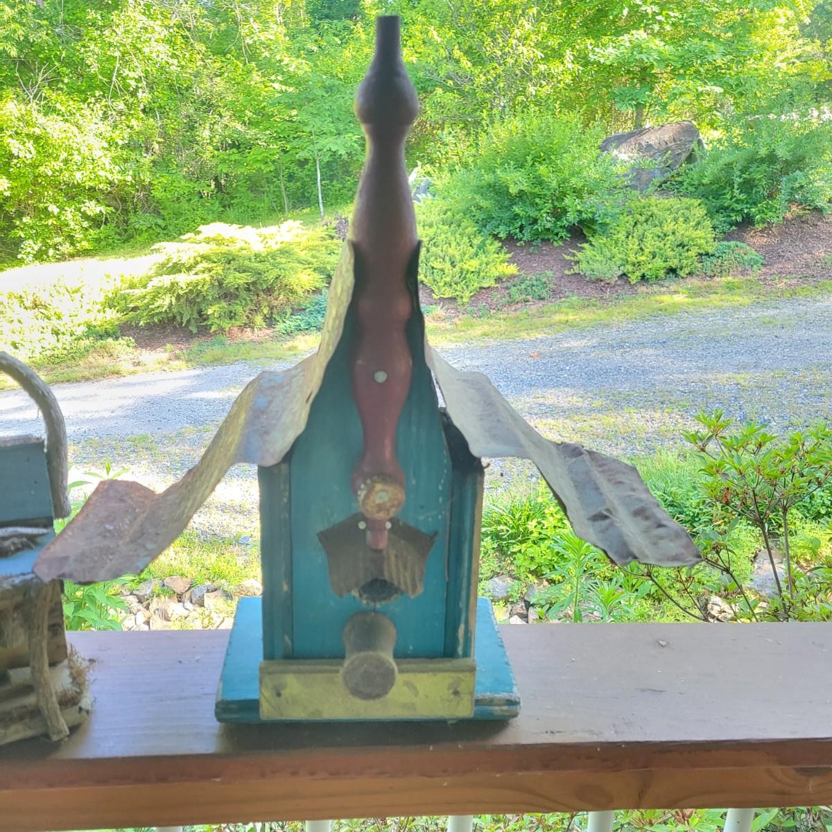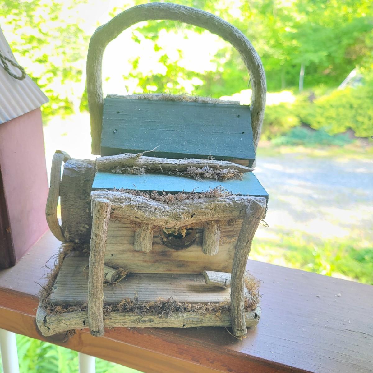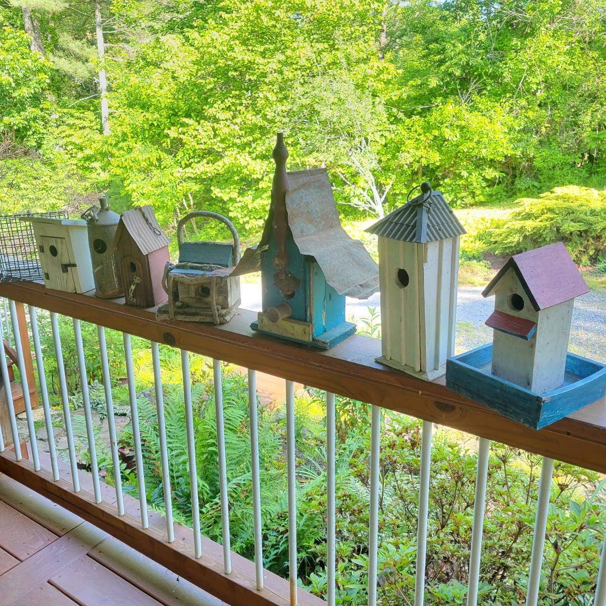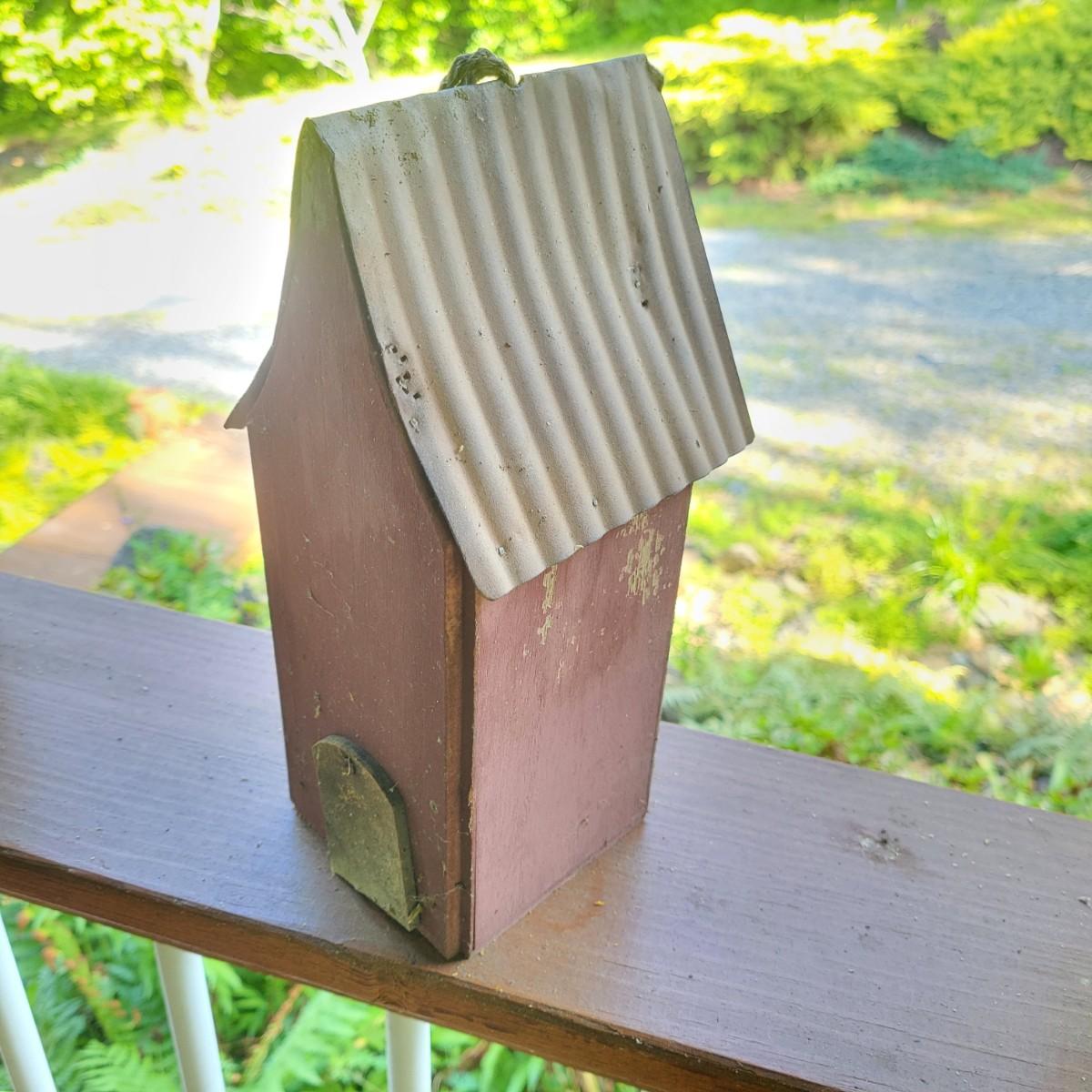 An assortment of seven birdhouses in an array of sizes and materials. Most are wooden, but one is a signed piece of pottery. The largest birdhouse measures approximately 16" x 7" x 17.5"H. This lot also includes a suet bird feeder. Local pickup only
