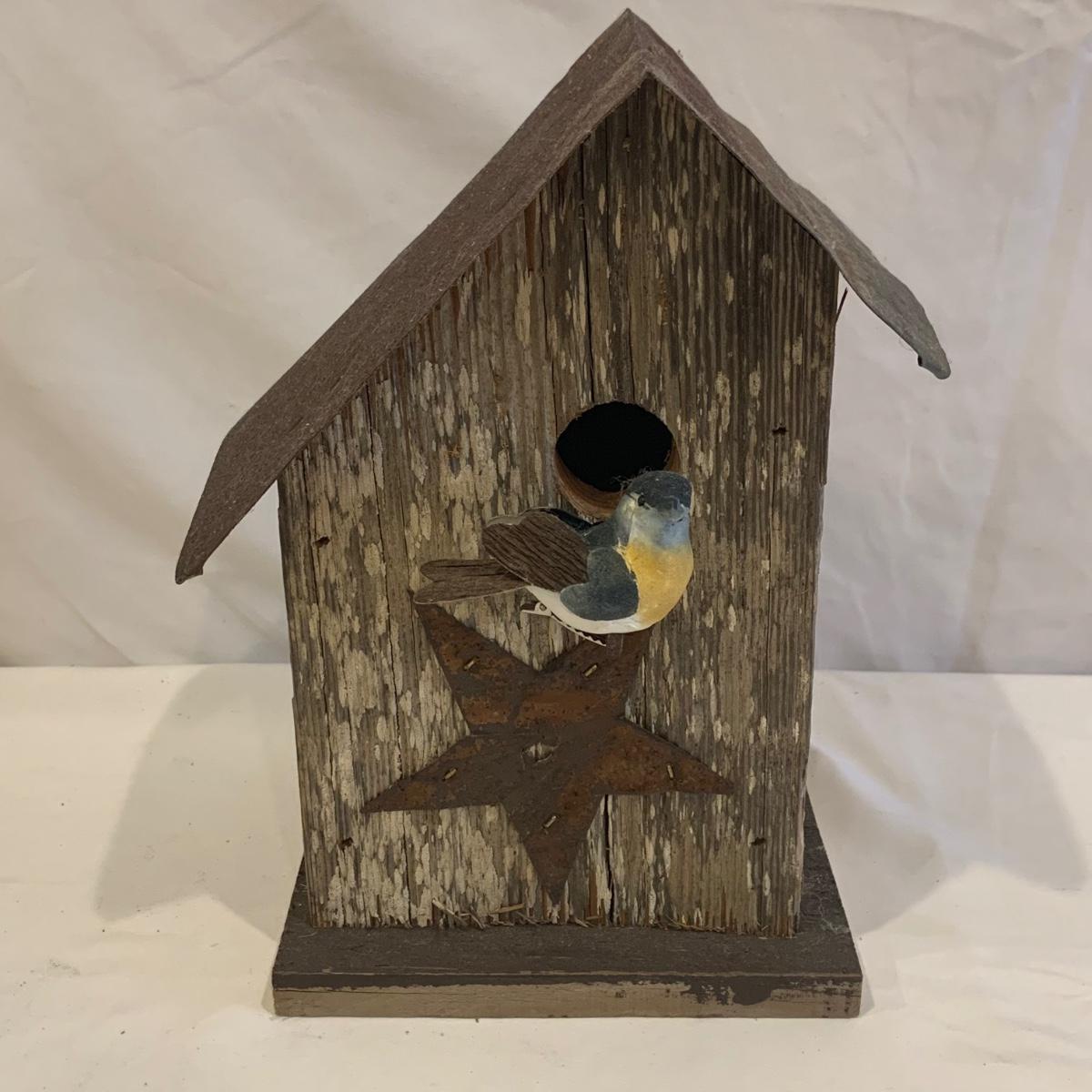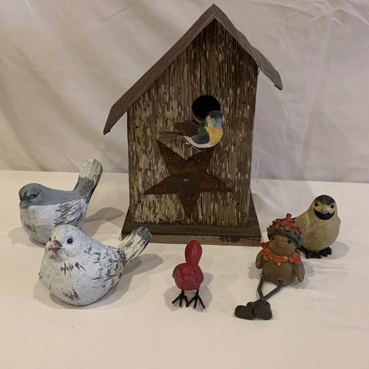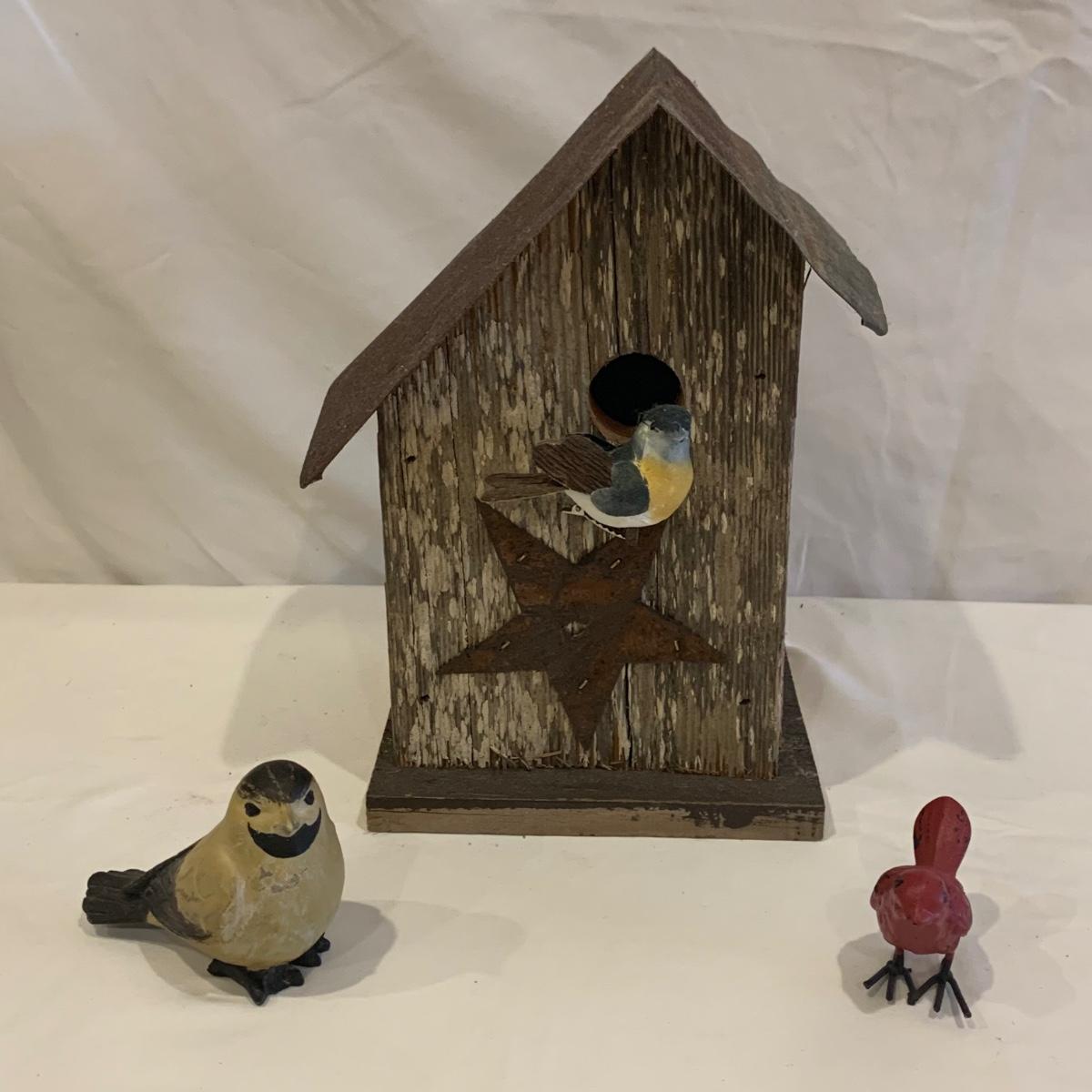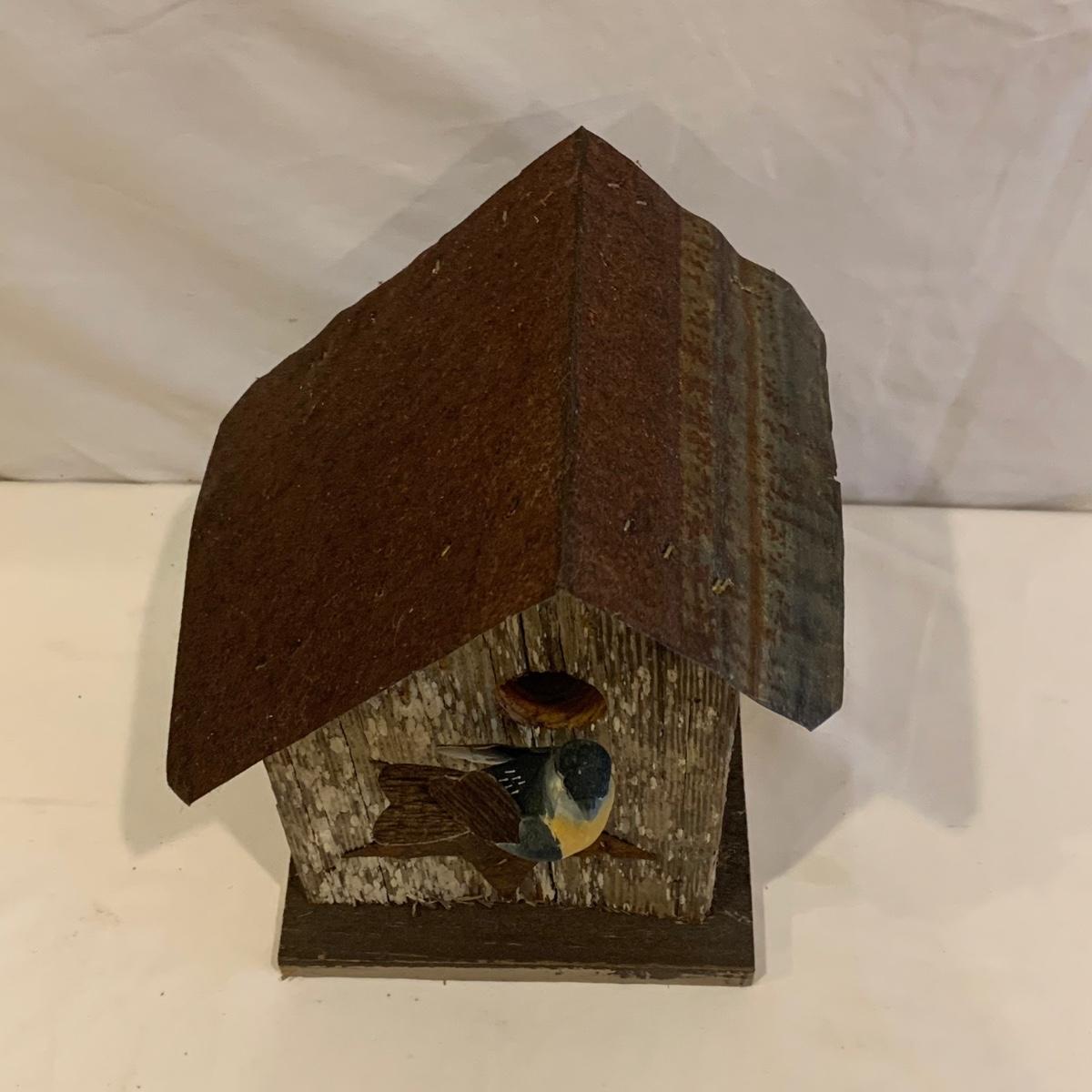 Wood birdhouse with metal roof measures 7” x 6.5” x 11”H. The metal roof has some stickiness on its surface that can’t really be seen, only felt, and is cleanable. Five bird figurines also are included that are made from resin, wood, or metal.