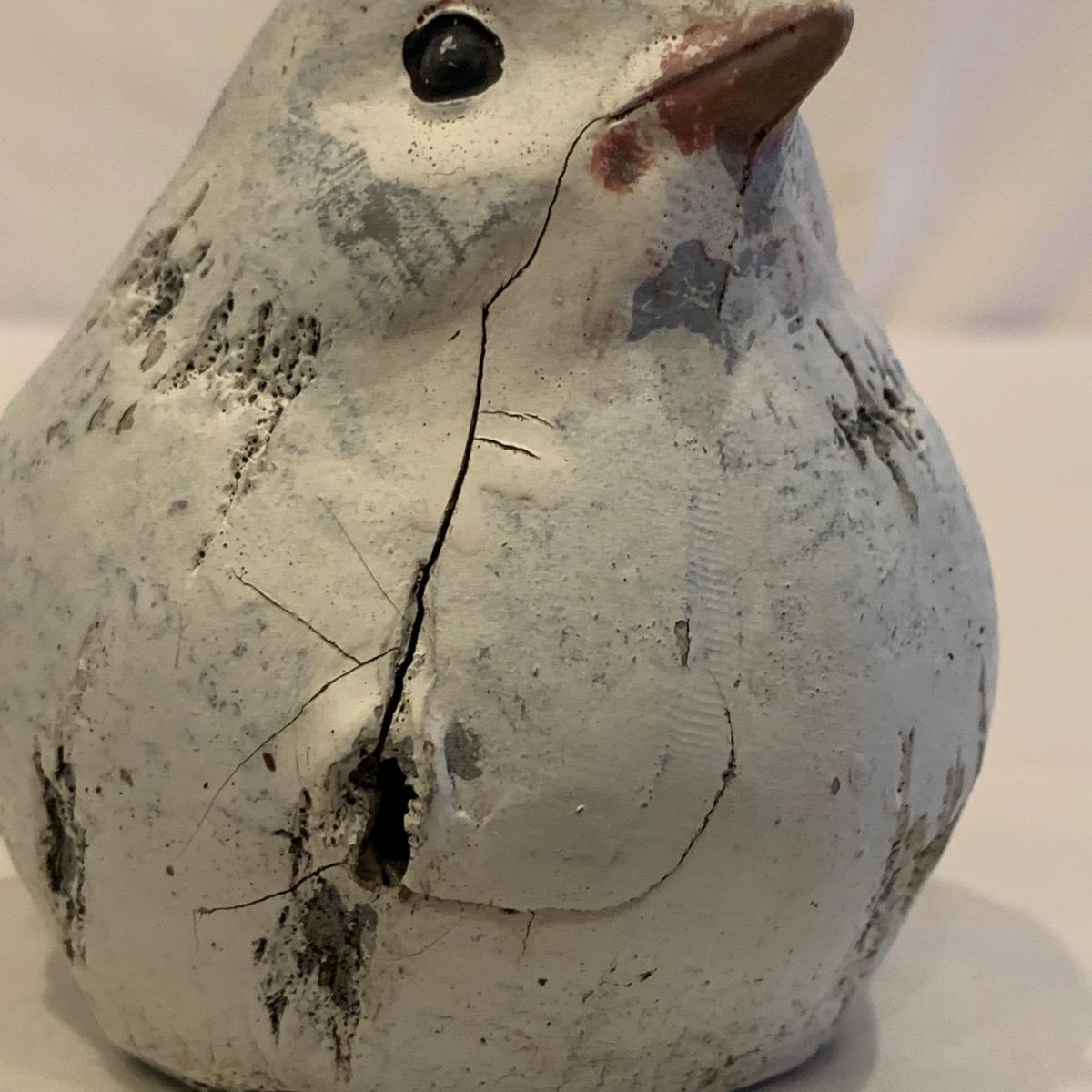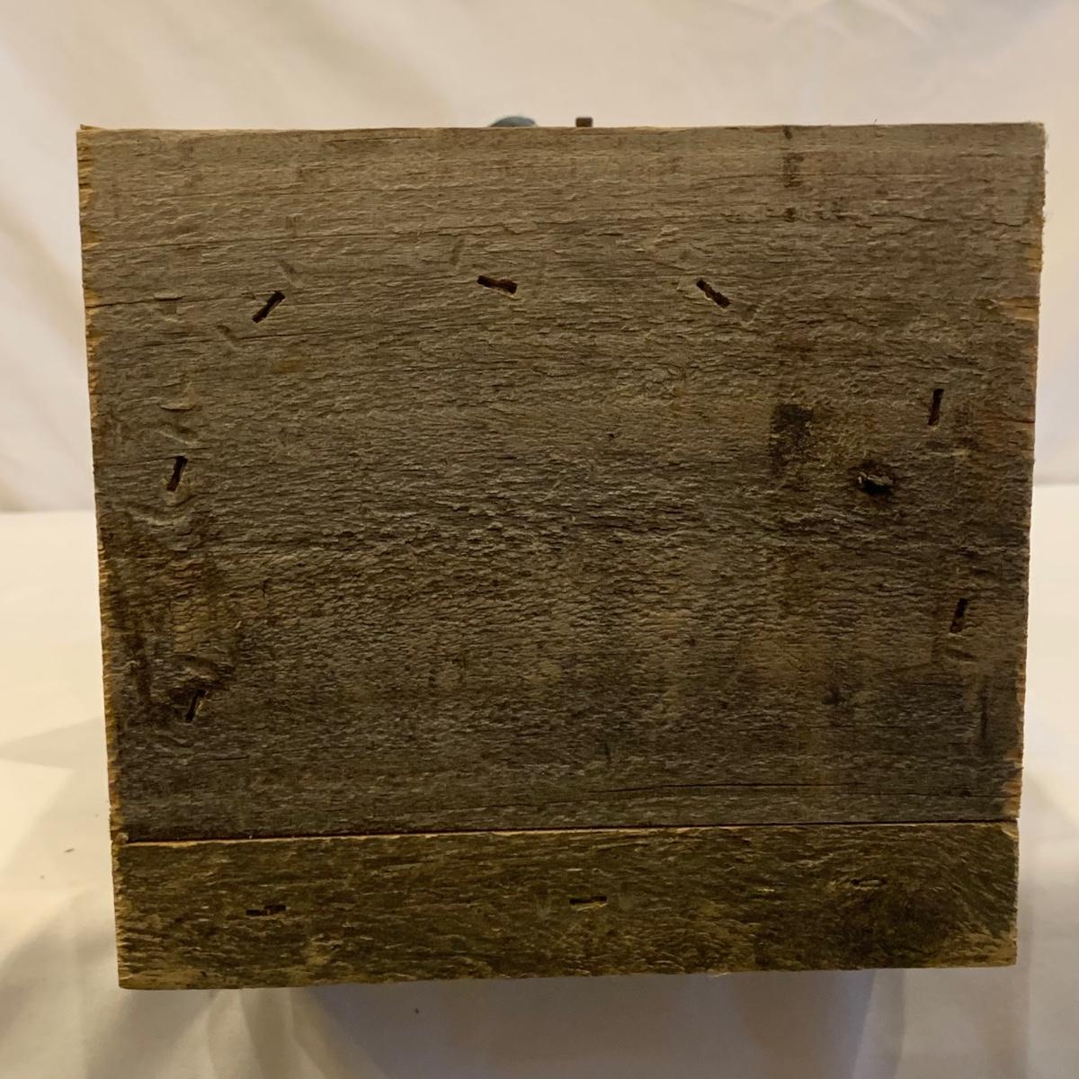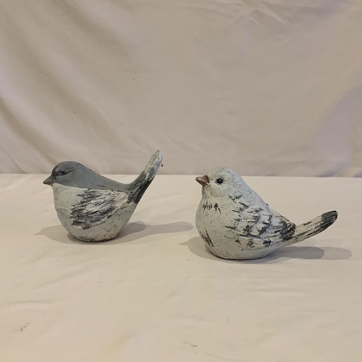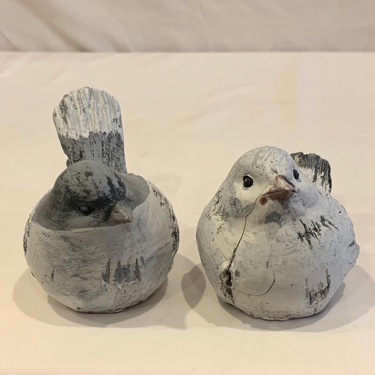 Wood birdhouse with metal roof measures 7” x 6.5” x 11”H. The metal roof has some stickiness on its surface that can’t really be seen, only felt, and is cleanable. Five bird figurines also are included that are made from resin, wood, or metal.