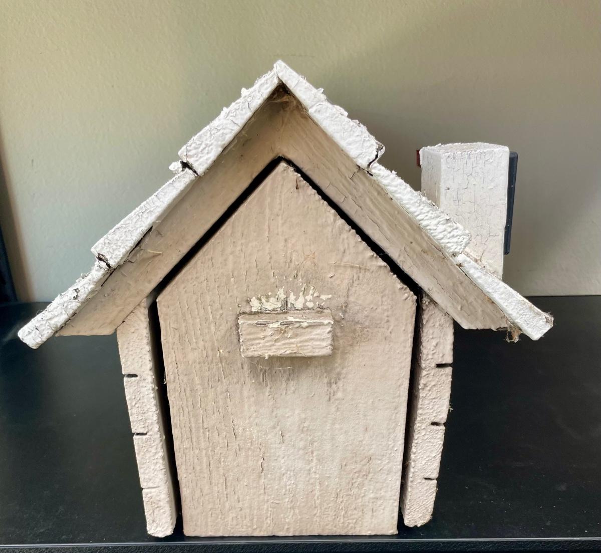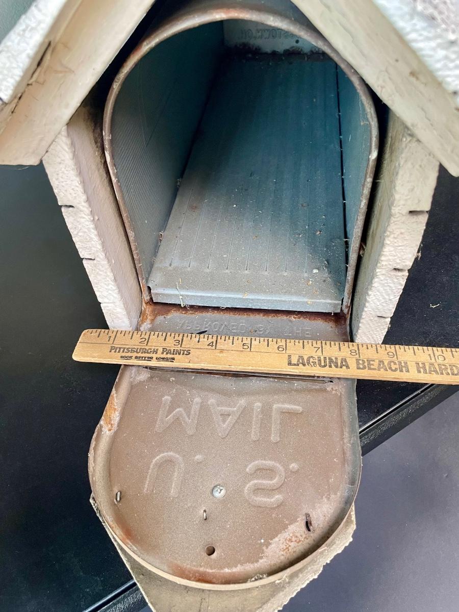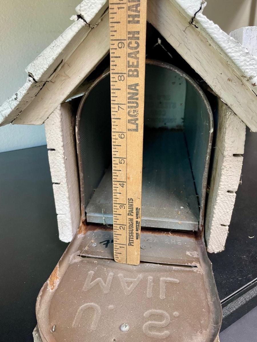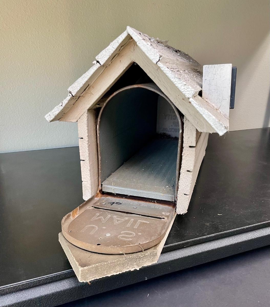 Wood birdhouse with a standard metal home mailbox inside. Rustic looking outside, good condition inside.